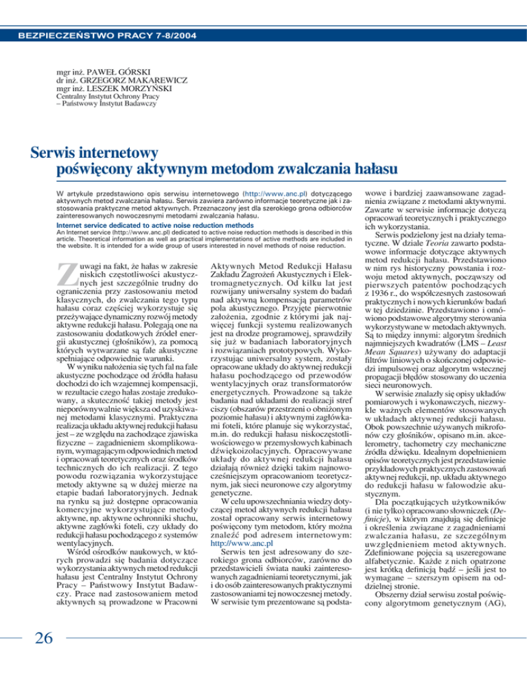 BEZPIECZEŃSTWO PRACY 7-8/2004 mgr inż. PAWEŁ GÓRSKI dr inż. GRZEGORZ MAKAREWICZ mgr inż. LESZEK MORZYŃSKI Centralny Instytut Ochrony Pracy – Państwowy Instytut Badawczy Serwis internetowy poświęcony aktywnym metodom zwalczania hałasu W artykule przedstawiono opis serwisu internetowego (http://www.anc.pl) dotyczącego aktywnych metod zwalczania hałasu. Serwis zawiera zarówno informacje teoretyczne jak i zastosowania praktyczne metod aktywnych. Przeznaczony jest dla szerokiego grona odbiorców zainteresowanych nowoczesnymi metodami zwalczania hałasu. Internet service dedicated to active noise reduction methods An Internet service (http://www.anc.pl) dedicated to active noise reduction methods is described in this article. Theoretical information as well as practical implementations of active methods are included in the website. It is intended for a wide group of users interested in novel methods of noise reduction. Z uwagi na fakt, że hałas w zakresie niskich częstotliwości akustycznych jest szczególnie trudny do ograniczenia przy zastosowaniu metod klasycznych, do zwalczania tego typu hałasu coraz częściej wykorzystuje się przeżywające dynamiczny rozwój metody aktywne redukcji hałasu. Polegają one na zastosowaniu dodatkowych źródeł energii akustycznej (głośników), za pomocą których wytwarzane są fale akustyczne spełniające odpowiednie warunki. W wyniku nałożenia się tych fal na fale akustyczne pochodzące od źródła hałasu dochodzi do ich wzajemnej kompensacji, w rezultacie czego hałas zostaje zredukowany, a skuteczność takiej metody jest nieporównywalnie większa od uzyskiwanej metodami klasycznymi. Praktyczna realizacja układu aktywnej redukcji hałasu jest – ze względu na zachodzące zjawiska fizyczne – zagadnieniem skomplikowanym, wymagającym odpowiednich metod i opracowań teoretycznych oraz środków technicznych do ich realizacji. Z tego powodu rozwiązania wykorzystujące metody aktywne są w dużej mierze na etapie badań laboratoryjnych. Jednak na rynku są już dostępne opracowania komercyjne wykorzystujące metody aktywne, np. aktywne ochronniki słuchu, aktywne zagłówki foteli, czy układy do redukcji hałasu pochodzącego z systemów wentylacyjnych. Wśród ośrodków naukowych, w których prowadzi się badania dotyczące wykorzystania aktywnych metod redukcji hałasu jest Centralny Instytut Ochrony Pracy – Państwowy Instytut Badawczy. Prace nad zastosowaniem metod aktywnych są prowadzone w Pracowni 26 Aktywnych Metod Redukcji Hałasu Zakładu Zagrożeń Akustycznych i Elektromagnetycznych. Od kilku lat jest rozwijany uniwersalny system do badań nad aktywną kompensacją parametrów pola akustycznego. Przyjęte pierwotnie założenia, zgodnie z którymi jak najwięcej funkcji systemu realizowanych jest na drodze programowej, sprawdziły się już w badaniach laboratoryjnych i rozwiązaniach prototypowych. Wykorzystując uniwersalny system, zostały opracowane układy do aktywnej redukcji hałasu pochodzącego od przewodów wentylacyjnych oraz transformatorów energetycznych. Prowadzone są także badania nad układami do realizacji stref ciszy (obszarów przestrzeni o obniżonym poziomie hałasu) i aktywnymi zagłówkami foteli, które planuje się wykorzystać, m.in. do redukcji hałasu niskoczęstotliwościowego w przemysłowych kabinach dźwiękoizolacyjnych. Opracowywane układy do aktywnej redukcji hałasu działają również dzięki takim najnowocześniejszym opracowaniom teoretycznym, jak sieci neuronowe czy algorytmy genetyczne. W celu upowszechniania wiedzy dotyczącej metod aktywnych redukcji hałasu został opracowany serwis internetowy poświęcony tym metodom, który można znaleźć pod adresem internetowym: http://www.anc.pl Serwis ten jest adresowany do szerokiego grona odbiorców, zarówno do przedstawicieli świata nauki zainteresowanych zagadnieniami teoretycznymi, jak i do osób zainteresowanych praktycznymi zastosowaniami tej nowoczesnej metody. W serwisie tym prezentowane są podsta- wowe i bardziej zaawansowane zagadnienia związane z metodami aktywnymi. Zawarte w serwisie informacje dotyczą opracowań teoretycznych i praktycznego ich wykorzystania. Serwis podzielony jest na działy tematyczne. W dziale Teoria zawarto podstawowe informacje dotyczące aktywnych metod redukcji hałasu. Przedstawiono w nim rys historyczny powstania i rozwoju metod aktywnych, począwszy od pierwszych patentów pochodzących z 1936 r., do współczesnych zastosowań praktycznych i nowych kierunków badań w tej dziedzinie. Przedstawiono i omówiono podstawowe algorytmy sterowania wykorzystywane w metodach aktywnych. Są to między innymi: algorytm średnich najmniejszych kwadratów (LMS – Least Mean Squares) używany do adaptacji filtrów liniowych o skończonej odpowiedzi impulsowej oraz algorytm wstecznej propagacji błędów stosowany do uczenia sieci neuronowych. W serwisie znalazły się opisy układów pomiarowych i wykonawczych, niezwykle ważnych elementów stosowanych w układach aktywnej redukcji hałasu. Obok powszechnie używanych mikrofonów czy głośników, opisano m.in. akcelerometry, tachometry czy mechaniczne źródła dźwięku. Idealnym dopełnieniem opisów teoretycznych jest przedstawienie przykładowych praktycznych zastosowań aktywnej redukcji, np. układu aktywnego do redukcji hałasu w falowodzie akustycznym. Dla początkujących użytkowników (i nie tylko) opracowano słowniczek (Definicje), w którym znajdują się definicje i określenia związane z zagadnieniami zwalczania hałasu, ze szczególnym uwzględnieniem metod aktywnych. Zdefiniowane pojęcia są uszeregowane alfabetycznie. Każde z nich opatrzone jest krótką definicją bądź – jeśli jest to wymagane – szerszym opisem na oddzielnej stronie. Obszerny dział serwisu został poświęcony algorytmom genetycznym (AG), BEZPIECZEŃSTWO PRACY 7-8/2004 Witryna internetowa www.anc.pl - dział teorii dotyczącej metod