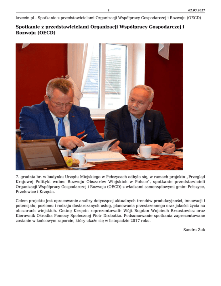 1 02.03.2017 krzecin.pl - Spotkanie z przedstawicielami Organizacji Współpracy Gospodarczej i Rozwoju (OECD) Spotkanie z przedstawicielami Organizacji Współpracy Gospodarczej i Rozwoju (OECD) 7. grudnia br. w budynku Urzędu Miejskiego w Pełczycach odbyło się, w ramach projektu „Przegląd Krajowej Polityki wobec Rozwoju Obszarów Wiejskich w Polsce", spotkanie przedstawicieli Organizacji Współpracy Gospodarczej i Rozwoju (OECD) z władzami samorządowymi gmin: Pełczyce, Przelewice i Krzęcin. Celem projektu jest opracowanie analizy dotyczącej aktualnych trendów produkcyjności, innowacji i potencjału, poziomu i rodzaju dostarczanych usług, planowania przestrzennego oraz jakości życia na obszarach wiejskich. Gminę Krzęcin reprezentowali: Wójt Bogdan Wojciech Brzustowicz oraz Kierownik Ośrodka Pomocy Społecznej Piotr Drobotko. Podsumowanie spotkania zaprezentowane zostanie w końcowym raporcie, który ukaże się w listopadzie 2017 roku. Sandra Żuk 2 02.03.2017 3 02.03.2017 4 02.03.2017