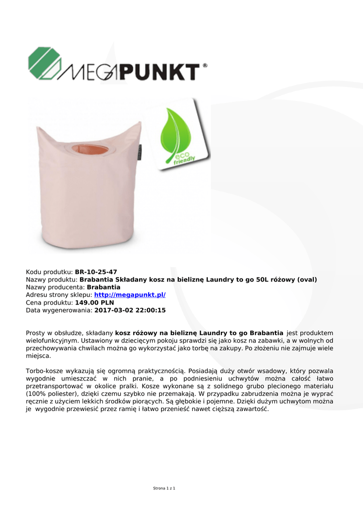 Kodu produtku: BR-10-25-47 Nazwy produktu: Brabantia Składany kosz na bieliznę Laundry to go 50L różowy (oval) Nazwy producenta: Brabantia Adresu strony sklepu: http://megapunkt.pl/ Cena produktu: 149.00 PLN Data wygenerowania: 2017-03-02 22:00:15 Prosty w obsłudze, składany kosz różowy na bieliznę Laundry to go Brabantia jest produktem wielofunkcyjnym. Ustawiony w dziecięcym pokoju sprawdzi się jako kosz na zabawki, a w wolnych od przechowywania chwilach można go wykorzystać jako torbę na zakupy. Po złożeniu nie zajmuje wiele miejsca. Torbo-kosze wykazują się ogromną praktycznością. Posiadają duży otwór wsadowy, który pozwala wygodnie umieszczać w nich pranie, a po podniesieniu uchwytów można całość łatwo przetransportować w okolice pralki. Kosze wykonane są z solidnego grubo plecionego materiału (100% poliester), dzięki czemu szybko nie przemakają. W przypadku zabrudzenia można je wyprać ręcznie z użyciem lekkich środków piorących. Są głębokie i pojemne. Dzięki dużym uchwytom można je wygodnie przewiesić przez ramię i łatwo przenieść nawet cięższą zawartość. Strona 1 z 1