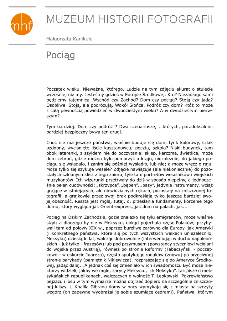MUZEUM HISTORII FOTOGRAFII Małgorzata Kanikuła Pociąg Początek wieku. Nieważne, którego. Ludzie na tym zdjęciu akurat o stulecie wcześniej niż my. Jesteśmy gdzieś w Europie Środkowej. Kto? Niezadługo sami będziemy tajemnicą. Wschód czy Zachód? Dom czy pociąg? Stoją czy jadą? Osobliwe. Stoją, ale podróżują. Wokół Słońca. Podróż czy dom? Któż to może z całą pewnością powiedzieć w dwudziestym wieku? A w dwudziestym pierwszym? Tym bardziej. Dom czy podróż ? Dwa scenariusze, z których, paradoksalnie, bardziej bezpieczny bywa ten drugi. Choć nie ma jeszcze państwa, właśnie buduje się dom, tynk kolorowy, szlak ozdobny, wyciśnięte liście kasztanowca; poczta, szkoła? Niski budynek, tam obok latarenki, z szyldem nie do odczytania: sklep, karczma, świetlica, może dom zebrań, gdzie można było pomarzyć o kraju, niezależnie, do jakiego pociągu się wsiadało, i zanim się później wysiadło, lub nie; a może wręcz o raju. Może tylko się szykuje wesele? Zdjęcie nawiązuje (ale niekoniecznie) do pozostałych szklanych klisz z tego zbioru, tyle tam portretów weselników i wiejskich muzykantów. Ich wizerunki przetrwały do dziś w sposób niepełny, a jednocześnie pełen cudowności: „skrzypce”, „bęben”, „basy”, jedynie instrumenty, wciąż grające w istniejących, ale niewidzialnych rękach, pozostały na zniszczonej fotografii, a grajkowie przez swój brak podkreślają tylko jeszcze bardziej swoją obecność. Reszta jest mgłą, tutaj, o, przesłania fundamenty, korzenie tego domu, który wygląda jak Orient-express, jak dom na palach, jak... Pociąg na Dzikim Zachodzie, gdzie znalazło się tylu emigrantów, może właśnie stąd; a dlaczego by nie w Meksyku, dokąd pojechała część Polaków; przybywali tam od połowy XIX w., poprzez burzliwe zarówno dla Europy, jak Ameryki (i konkretnego państwa, które się po tych wszystkich walkach uniezależniło, Meksyku) dziesiątki lat, walcząc dobrowolnie (interweniując w duchu napoleońskich - już tylko - frazesów) lub pod przymusem (powstańcy styczniowi wcielani do wojska przez Austrię), również po stronie Reformy (Tabaczyński - początkowo - w eskorcie Juareza), często spotykając rodaków (znowu) po przeciwnej stronie barykady (pamiętnik Niklewicza), rozpraszając się po Ameryce Środkowej, jadąc dalej. „A jednak coś się zmieniało w ich świadomości. Być może niektórzy widzieli, jakby we mgle, zarysy Meksyku, ich Meksyku”, tak pisze o meksykańskich republikanach, walczących o wolność T. Łepkowski. Pokrewieństwo pejzażu i losu w tym wymiarze można dojrzeć dopiero na szczególnie zniszczonej kliszy. U Khalila Gibrana domy w nocy wymykają się z miasta na szczyty wzgórz (on zapewne wyobrażał je sobie szumiące cedrami). Państwa, którym odebrano istnienie lub zabiera się wolność, nocami swobodnie rysują swoje góry na powierzchni Syriusza. Każdy ma swój własny Meksyk, a za każdym Meksykiem otwiera się nowy Meksyk, mówi bohater Brunona Schulza; mieszka właśnie tam, w okolicach tych sklepów; dlatego przychodzi na myśl tekst i film „Sanatorium pod Klepsydrą”, scena, w której chłopcy - przemądrzały właściciel markownika i Józef, doszukujący się w tym głębszego sensu, przeskakują mur, by wpaść do ogrodu wyobraźni. A to już inna książka: „Wszystko się może wydarzyć”... „w owym trzynastym, nadliczbowym i niejako fałszywym miesiącu /.../. Głos drżał pod tymi nowymi niebami dźwięcznie i świeżo jak w nowym jeszcze i pustym mieszkaniu, pełnym zapachu lakieru, farb, rzeczy zaczętych i nie wypróbowanych. Z dziwnym wzruszeniem próbowało się nowego echa, napoczynało się je z ciekawością, jak w chłodny i trzeźwy poranek babkę do kawy, w przeddzień podróży.” (Bruno Schulz, „Noc wielkiego sezonu”). Przez tę pustkę, ziejącą u fundamentów, dom na szklanej ścianie kliszy odpływa, żegluje po galicyjskich przestworzach, meksykańskich manowcach, odwiedza Kuśniewiczowski Benares, jedzie do Babadag na skróty przez Bilbao; w zaistniałej sytuacji Pernambuko skończyło się, skończyło (jako symbol bliżej nie określonej egzotyki: teraz kojarzy się z festiwalami muzyki i filmów latynoskich - na wyciągnięcie ręki - o ile masz na bilet). Przy tych dygresjach dom odfrunął; wróćmy do naszej fotografii: mamy tu do czynienia z najzwyklejszą ponoć na świecie czynnością i dążeniem: budową domu. Narzędzia, wiadra, puste jeszcze okna, mistrzowie murarscy w fartuchach, kapeluszach, mężczyzna z piłą w rękach (trzyma ją zresztą takim gestem, jakby to był instrument muzyczny!), trzy dziewoje w sutych, jasnych, wzorzystych spódnicach - zaraz chyba zaczną śpiewać. Uroczyste zakończenie pewnego etapu? Oczekiwanie na nowożeńców? Oczekiwanie na gorzałkę. Dom ten miał okazję później płonąć wielokrotnie, znowu ukazując puste okna, ale któż to wie, czy tak się stało; oby nigdy nikogo nie postawiono pod jego ścianą, by oczekiwał na cokolwiek innego, niż gorzałkę. Jeżeli jest gdzieś to miejsce, gdzie było to miasto, niewykluczone, że dzisiaj mieści się tam bankomat. W dawnym domu mieszkalnym, w Krakowie, w domu niegdyś piętrowym, z dobudowanym później drugim piętrem; z korytarzem, który dawał niewyczerpane możliwości zabaw, jak jeżdżenie w domu na nartach po wykładzinie z trawy morskiej, o czym opowiadali kiedyś dawni jego mieszkańcy - pozostały pamiątki w postaci zdjęcia z przedstawienia odgrywanego tutaj przez dzieci, które przebrane były za zwierzątka (to w czasach, gdy blisko stąd były baseny i obiekty sportowe, na miejscu Parku i Alei; w czasie wojny budynek zajęli Niemcy; w tym domu stworzono po wojnie szkołę filmową (słynna „Prafilmówka”); później było tu Biuro Paszportowe; obecnie Muzeum Historii Fotografii w Krakowie przechowuje tu swoje fotografie, także te dziwne, nie takie „cenne”, nie wy