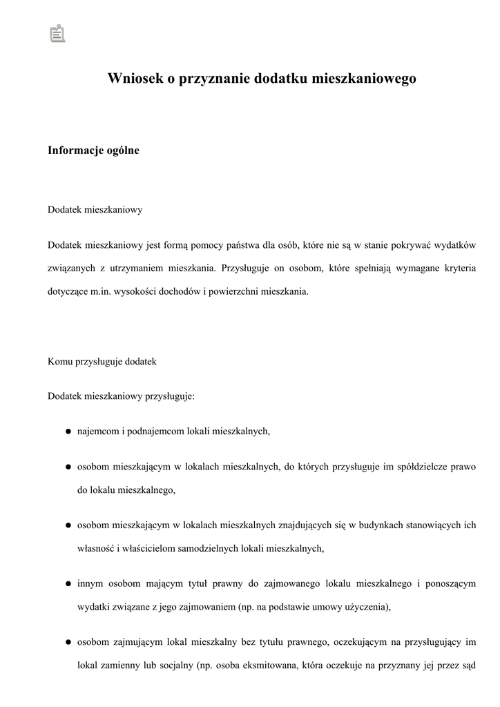 Wniosek o przyznanie dodatku mieszkaniowego Informacje ogólne Dodatek mieszkaniowy Dodatek mieszkaniowy jest formą pomocy państwa dla osób, które nie są w stanie pokrywać wydatków związanych z utrzymaniem mieszkania. Przysługuje on osobom, które spełniają wymagane kryteria dotyczące m.in. wysokości dochodów i powierzchni mieszkania. Komu przysługuje dodatek Dodatek mieszkaniowy przysługuje: najemcom i podnajemcom lokali mieszkalnych, osobom mieszkającym w lokalach mieszkalnych, do których przysługuje im spółdzielcze prawo do lokalu mieszkalnego, osobom mieszkającym w lokalach mieszkalnych znajdujących się w budynkach stanowiących ich własność i właścicielom samodzielnych lokali mieszkalnych, innym osobom mającym tytuł prawny do zajmowanego lokalu mieszkalnego i ponoszącym wydatki związane z jego zajmowaniem (np. na podstawie umowy użyczenia), osobom zajmującym lokal mieszkalny bez tytułu prawnego, oczekującym na przysługujący im lokal zamienny lub socjalny (np. osoba eksmitowana, która oczekuje na przyznany jej przez sąd lokal socjalny). ZAPAMIĘTAJ Dodatek mieszkaniowy przysługuje uprawnionym osobom wówczas, jeśli średni miesięczny dochód na jednego członka gospodarstwa domowego (liczony na podstawie dochodu z 3 miesięcy poprzedzających dzień złożenia wniosku o dodatek) nie przekracza kwoty 175% najniższej emerytury w gospodarstwie jednoosobowym i 125% tej kwoty w gospodarstwie wieloosobowym (najniższa emerytura od 1 marca 2008 r. wynosi 636, 29zł brutto). Dodatku mieszkaniowego nie przyznaje się, jeśli byłby on niższy niż 2% kwoty najniższej emerytury, liczonej w dniu wydania decyzji. Istotna powierzchnia mieszkania Przyznanie dodatku mieszkaniowego zależy również od tzw. normatywnej powierzchni mieszkania, czyli powierzchni, jaka przypada na określoną liczbę członków rodziny. Normatywna powierzchnia, w przeliczeniu na liczbę członków gospodarstwa domowego, nie może przekraczać: 35 m2 – dla 1 osoby, 40 m2 – dla 2 osób, 45 m2 – dla 3 osób, 55 m2 – dla 4 osób, 65 m2 – dla 5 osób, 70 m2 – dla 6 osób. Jeśli w lokalu mieszka więcej osób, to dla każdej kolejnej powierzchnię normatywną zwiększa się o 5 m2. Jeżeli natomiast w lokalu mieszka osoba niepełnosprawna poruszająca się na wózku lub osoba niepełnosprawna, której niepełnosprawność wymaga zamieszkiwania w oddzielnym pokoju – wówczas powierzchnię normatywną zwiększa się o 15 m2. Dodatek mieszkaniowy przysługuje wówczas, gdy powierzchnia użytkowa lokalu mieszkalnego nie przekracza powierzchni normatywnej o więcej niż 30% albo o więcej niż 50% – jeśli udział powierzchni pokoi i kuchni w powierzchni użytkowej lokalu nie przekracza 60%. PRZYKŁAD Janina Z. jest właścicielką mieszkania o powierzchni 45 m2 (to powierzchnia użytkowa), w którym 40 m2 zajmuje kuchnia i 2 pokoje. Janina Z. mieszka razem z synem. Taka wielkość mieszkania kwalifikuje się do dodatku mieszkaniowego, gdyż powierzchnia użytkowa nie przekracza tu powierzchni normatywnej (która dla 2 osób wynosi 40 m2) o więcej niż 30%. Jak wypełnić wniosek Formularz wniosku o dodatek mieszkaniowy i deklaracji o wysokości dochodów jest ustalony urzędowo – można go otrzymać we właściwym miejscowo urzędzie miasta lub gminy (zwykle w wydziale lokalowym lub w wydziale spraw społecznych) lub znaleźć na stronie internetowej tego urzędu. GP RADZI Osoba, która otrzymała dodatek mieszkaniowy na podstawie nieprawdziwych danych, musi liczyć się z koniecznością zwrotu nienależnie pobranej kwoty w podwójnej wysokości. Organ przyznający dodatek może przeprowadzić wywiad środowiskowy w celu stwierdzenia, czy dochody wykazane w złożonej deklaracji są prawdziwe. Krok 1 DANE ADRESOWE. We wniosku należy podać swoje dane, z własnym adresem oraz nazwą i adresem zarządcy domu (w przypadku budynków wielorodzinnych). Krok 2 TYTUŁ PRAWNY. Należy określić tytuł prawny do zajmowanego lokalu (np. najem, podnajem, własność domu jednorodzinnego). Krok 3 STAN MIESZKANIA. Wnioskodawca musi podać powierzchnię użytkową lokalu, sposób ogrzewania lokalu i wody, instalację gazową, liczbę osób w gospodarstwie domowym (także niepełnosprawnych). Krok 4 DOCHODY. Należy dokładnie obliczyć osiągany dochód i sprawdzić powierzchnię normatywną mieszkania. Warto pamiętać, że za dochód liczony do dodatku mieszkaniowego uważa się wszelkie przychody po odliczeniu kosztów ich uzyskania oraz po odliczeniu składek na ubezpieczenie emerytalne i rentowe oraz na ubezpieczenie chorobowe, określonych w przepisach o systemie ubezpieczeń społecznych, chyba że zostały już zaliczone do kosztów uzyskania przychodu. Do dochodu nie wlicza się świadczeń pomocy materialnej dla uczniów, dodatków dla sierot zupełnych, jednorazowych zapomóg z tytułu urodzenia się dziecka, dodatku z tytułu urodzenia dziecka, pomocy w zakresie dożywiania, zasiłków pielęgnacyjnych, zasiłków okresowych z pomocy społecznej, jednorazowych świadczeń pieniężnych i świadczeń w naturze z pomocy społecznej, dodatku mieszkaniowego oraz zapomogi pieniężnej, o której mowa w przepisach o zapomodze pieniężnej dla niektórych emerytów, rencistów i osób pobierających świadczenie przedemerytalne albo zasiłek przedemerytalny w 2007 r. PRZYKŁAD Zenon W. będzie otrzymywał dodatek mieszkaniowy do końca października br. Najpóźniej w październiku musi więc złożyć kolejny wniosek o dodatek mieszkaniowy, jeśli chce go otrzymywać od 1 listopada. Do dochodu, od którego zależy przyznanie kolejnego dodatku, nie zostanie wliczony dodatek mieszkaniowy, który obecnie otrzymuje Zenon W. Krok 5 WYDATKI. Konieczne jest obliczanie łącznej kwoty wydatków przeznaczanych na utrzymanie mieszkania (m.in. czynsz, ogrzewanie, woda). Krok 6 PODPISY. Pod wnioskiem podpisują się: zarządca domu, wnioskodawca i urzędnik przyjmujący pismo. ZAPA