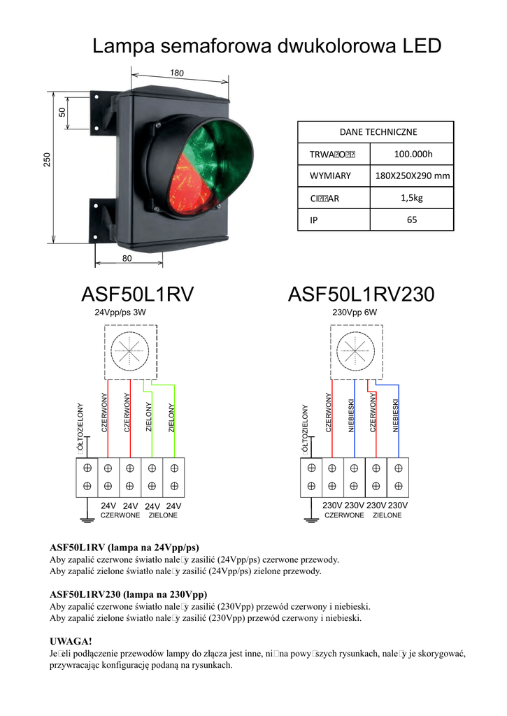 Lampa semaforowa dwukolorowa LED 50 180 250 DANE TECHNICZNE TRWAŁOŚĆ 100.000h WYMIARY 180X250X290 mm 1,5kg CIĘŻAR 65 IP 80 ASF50L1RV ASF50L1RV230 24V 24V 24V 24V CZERWONE ZIELONE NIEBIESKI CZERWONY NIEBIESKI CZERWONY ŻÓŁTOZIELONY ZIELONY 230Vpp 6W ZIELONY CZERWONY CZERWONY ŻÓŁTOZIELONY 24Vpp/ps 3W 230V 230V 230V 230V CZERWONE ZIELONE ASF50L1RV (lampa na 24Vpp/ps) Aby zapalić czerwone światło należy zasilić (24Vpp/ps) czerwone przewody. Aby zapalić zielone światło należy zasilić (24Vpp/ps) zielone przewody. ASF50L1RV230 (lampa na 230Vpp) Aby zapalić czerwone światło należy zasilić (230Vpp) przewód czerwony i niebieski. Aby zapalić zielone światło należy zasilić (230Vpp) przewód czerwony i niebieski. UWAGA! Jeżeli podłączenie przewodów lampy do złącza jest inne, niż na powyższych rysunkach, należy je skorygować, przywracając konfigurację podaną na rysunkach. Dichiarazione di conformitŕ / Declaration of Conformity Il sottoscritto, dichiara che il prodotto I hereby declare that the product Descrizione / Description Trademark Marca / SEMAFORO 50 (25+25) LED ROSSO/VERDE TRAFFIC LIGHT 50 (25+25) LED RED/GREEN STAGNOLI Funzionante in un campo di temperature esteso da -30°C a +80°C. č conforme a tutte le norme tecniche relative al prodotto entro il campo di applicabilitŕ delle Direttive Comunitarie 2004/108/CE EMC 2006/95/CE LVD; Extended operating temperature range from -30°C to+ 80°C satisfies all the technical regulations applicable to the product within the scope of Council Directives , 2004/108/CE EMC 2006/95/CE LVD. COSTRUTTORE E RAPPRESENTANTE AUTORIZZATO: MANUFACTURER AND AUTHORISED REPRESENTATIVE: STAGNOLI TG S.r.l. Via Mantova Traversa 1a ,105a/b 25017 Lonato Del Garda (BS) – ITALIA Questa dichiarazione viene emessa sotto la sola responsabilitŕ del costruttore e, se applicabile, del suo rappresentante autorizzato. This declaration is issued under the sole responsibility of the manufacturer and, if applicable, his authorised representative. Lonato Del Garda, 01/09/2010 (Luogo, data di emissione) (Firma)