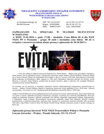 Komi NIEZALEŻNY SAMORZĄDNY ZWIĄZEK ZAWODOWY PRACOWNIKÓW POLICJI WOJEWÓDZKI ZARZĄD ZAKŁADOWY W POZNANIU ul. Kochanowskiego 2a, 60-844 Poznań NIP: 781-14-52-018 Regon : 630920000 KRS: 0000331407 tel. 61 84 131-67/74 fax 61 84 127-76 kom. 506162802 ZAPRASZAMY NA SPEKTAKL W TEATRZE MUZYCZNYM W POZNANIU w DNIU 31.01.2016 r. godz. 17:00 – niedziela -Cena Biletu 60 zł dla WZZ NSZZ PP w Poznaniu – grupa 30 osób ( normalna cena biletu 80 zł) w związku z zarezerwowaniem miejsc proszę o zgłoszenia do 30.10.2015 r. Evita jest opartą na faktach muzyczną biografią Evy Perón-Duarte – drugiej żony prezydenta Argentyny, Juana Peróna. Jest to najbardziej znane i najczęściej wystawiane dzieło Andrew Lloyda Webbera. Premiera odbyła się w Prince Edward Theatre na londyńskim West Endzie w dniu 21 czerwca 1978 roku. Rok później to niezwykłe dzieło pokazano na Broadwayu, gdzie zagrano je 1584 razy! Ogromnym sukcesem okazała się również wersja filmowa w reżyserii Alana Parkera, nominowana do pięciu Oscarów, gdzie w głównej roli wystąpiła Madonna, a partnerował jej Antonio Banderas. 26 września, po raz pierwszy w Poznaniu, pokażemy musical najsłynniejszego kompozytora musicalowego na świecie – Andrew Lloyda Webbera. Będzie to najnowsza muzyczna wersja spektaklu Evita z 2010 roku. Zawiera ona piosenkę „You must Love me” skomponowaną dla Madonny na potrzeby filmu z 1996 roku. Andrew Lloyd Webber jest twórcą najbardziej kasowych musicali na świecie, takich jak Koty, Jesus Christ Superstar czy Upiór w operze. Spektakl przygotują realizatorzy, pracujący wcześniej przy musicalu Jekyll&Hyde. Reżyserii podjął się Sebastian Gonciarz, autorem scenografii jest Mariusz Napierała, choreografii Paulina Andrzejewska, a kostiumów Agata Uchman. Kierownikiem muzycznym spektaklu został Piotr Deptuch. Musical zostanie przedstawiony w polskim tłumaczeniu Andrzeja Ozgi. Licencji na wystawienie musicalu udzieliła osiło się ponad 100 osób z całej Polski--Teatrowi firma The Really Usefull Group. Obsada wyłoniona została w drodze castingu, na który zgł Zgłoszenia proszę kierować WZZ NSZZ Pracowników Policji w Poznaniu Lucyna Jaworska – Wojtas , Wanda Sobczak, 131-74, 131-67