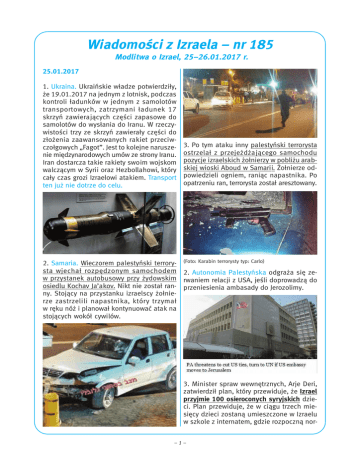 Wiadomości z Izraela – nr 185 Modlitwa o Izrael, 25–26.01.2017 r. 25.01.2017 1. Ukraina. Ukraińskie władze potwierdziły, że 19.01.2017 na jednym z lotnisk, podczas kontroli ładunków w jednym z samolotów transportowych, zatrzymani ładunek 17 skrzyń zawierających części zapasowe do samolotów do wysłania do Iranu. W rzeczywistości trzy ze skrzyń zawierały części do złożenia zaawansowanych rakiet przeciwczołgowych „Fagot”. Jest to kolejne naruszenie międzynarodowych umów ze strony Iranu. Iran dostarcza takie rakiety swoim wojskom walczącym w Syrii oraz Hezbollahowi, który cały czas grozi Izraelowi atakiem. Transport ten już nie dotrze do celu. 3. Po tym ataku inny palestyński terrorysta ostrzelał z przejeżdżającego samochodu pozycje izraelskich żołnierzy w pobliżu arabskiej wioski Aboud w Samarii. Żołnierze odpowiedzieli ogniem, raniąc napastnika. Po opatrzeniu ran, terrorysta został aresztowany. 2. Samaria. Wieczorem palestyński terrory- (Foto: Karabin terrorysty typ: Carlo) sta wjechał rozpędzonym samochodem 2. Autonomia Palestyńska odgraża się zew przystanek autobusowy przy żydowskim rwaniem relacji z USA, jeśli doprowadzą do osiedlu Kochav Ja’akov. Nikt nie został ran- przeniesienia ambasady do Jerozolimy. ny. Stojący na przystanku izraelscy żołnierze zastrzelili napastnika, który trzymał w ręku nóż i planował kontynuować atak na stojących wokół cywilów. 3. Minister spraw wewnętrznych, Arje Deri, zatwierdził plan, który przewiduje, że Izrael przyjmie 100 osieroconych syryjskich dzieci. Plan przewiduje, że w ciągu trzech miesięcy dzieci zostaną umieszczone w Izraelu w szkole z internatem, gdzie rozpoczną nor–1– malną edukację. W międzyczasie państwo rozpocznie procedurę poszukiwania dla nich rodzin zastępczych w Izraelu. Pozostaną one w Izraelu ze statusem tymczasowych rezydentów. Otrzymają izraelskie dowody osobiste, paszporty i wszystkie prawa obywatelskie. Nie wyklucza się możliwości, że jeśli zostaną odkryci rodzice lub rodzeństwo tych dzieci, również i ich przyjmie Izrael. 4. Ministerstwo obrony poinformowało, że najnowszy transporter opancerzony Eitan zakończył pierwsza rundę testów operacyjnych z Brygadą Piechoty Nahal, która będzie pierwszą jednostką bojową korzystającą z nowego pojazdu. Eitan zastapi wysłużone transportery M113, które są w służbie od 1970 r. Nowe transportery Eitan sa pierw- szymi w izraelskiej armii, które posiadają zaawansowane systemy aktywnej obrony oraz najnowszy pancerz chroniący przed pociskami przeciwpancernymi. 26.01.2017 5. Samaria. Popołudniu, w pobliżu arabskiej miejscowości Azzun palestyński terrorysta ostrzelał po południu izraelski pojazd wojskowy. Nikt nie został ranny. Napastnik zbiegł. Wieczorem, przy żydowskim osiedlu Beit Arjeh palestyńscy terroryści ostrzelali izraelski posterunek obserwacyjny. Nikt nie został ranny. W rejonie rozmieszczono dodatkowe siły bezpieczeństwa. *Od trzech dni wyraźnie widać wzrost napięcia na terytoriach palestyńskich, w szczególności w regionie Benjamina w Samarii. 6. UK. Brytyjska premier Theresa May powiedziała, że Wielka Brytania i Stany Zjednoczone muszą stanąć w obronie przyjaciół takich jak Izrael. „W naszym wspólnym interesie – Wielkiej Brytanii i Ameryki – jest bronić naszych wartości, naszych interesów i tych samych idei, w które wierzymy. Nie może to oznaczać powrotu do nieudanej polityki z przeszłości. Dni, kiedy Brytania i Ameryka interweniowały w suwerennych państwach, starając się zmienić świat na nasz obraz, minęły. Ale nie możemy sobie pozwolić, aby bezczynnie stać, gdy istnieją realne zagrożenia, i gdy w naszym własnym interesie leży interwencja. Musimy być silni, mądrzy i twardzi. Musimy pokazać niezbędną determinację w obronie naszych interesów. I gdy zagrożone jest bezpieczeństwo Izraela na Bliskim Wschodzie lub Estonii w krajach bałtyckich, musimy zawsze stawać w obronie naszych przyjaciół i sojuszników w krajach demokratycznych, które znalazły się w trudnym położeniu”. (Foto: Na górze Eitan, na dole stary typ pojazdu) –2– 27.01.2017 każdego dnia przez dzielnicę będzie przejeżdżać różnymi środkami transportu 100 7. Dzisiejszy dzień jest Międzynarodowym tys. ludzi. W 2019 r. ma rozpocząć się budoDniem Pamięci Ofiar Holokaustu. Rocznica wa nowej linii kolejowej do miasta Modlin. związana jest z wyzwoleniem największego obozu zagłady Auschwitz-Birkenau. 28.01.2017 9. Atak terrorystyczny koło Nili (Samaria). Palestyńczyk otworzył ogień do izraelskiego samochodu koło żydowskiej społeczności w Nili. Nikt nie został ranny. 8. Jerozolima. Centralny komitet planowania ujawnił kilka szczegółów dotyczących planów budowlanych w Jerozolimie. Nowa siedziba premiera zostanie wzniesiona za kwotę 650 mln szekli. Zespół będzie się składać z dwóch budynków o wysokości od pięciu do ośmiu kondygnacji, z podziemnymi wjazdami i parkingiem. Jednak najbardziej ambitny projekt powstanie przy wjeździe do Jerozolimy, gdzie już rozpoczęto prace przy budowie nowej dzielnicy biznesowej. Koszt budowy wyniesie ponad 1 mld szekli. Zgodnie z planem powstanie tutaj 24 wysokich budynków do 36 kondygnacji wysokości. Dzięki temu w okolicy powstanie ponad 2 tys. pomieszczeń biurowych. Nowa dzielnica stanie się również ważnym węzłem komunikacyjnym, z szybką koleją łączącą Jerozolimę z Tel Awiwem, normalną koleją, tramwajem i autobusami. Szacuje się, że 10. Współprzewodniczący amerykańskiej partii Republikanów, Marc Zell, zasugerował, że opóźnienie decyzji prezydenta Donalda Trumpa o przeniesieniu ambasady Stanów Zjednoczonych do Jerozolimy jest wynikiem prośby izraelskich urzędników. "Trump jednoznacznie opowiada się za przeniesieniem ambasady, ale postępuje ostrożnie ze względu na obawy wyrażone przez izraelskich urzędników. Trump wielokr