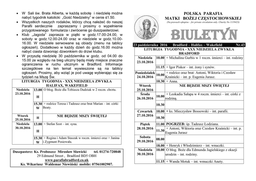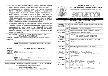 W Sali św. Brata Alberta, w każdą sobotę i niedzielę można nabyć tygodnik katolicki „Gość Niedzielny” w cenie £1.50. Wszystkich naszych rodaków, którzy chcą należeć do naszej Parafii serdecznie zapraszamy i prosimy o wypełnienie przygotowanego formularza i zwrócenie go duszpasterzowi. Klub „Jagoda” zaprasza w piątki w godz.17.00-24.00, w soboty w godz.12.00-24.00 oraz w niedziele w godz.10.0016.00. W niedziele serwowane są obiady (menu na tablicy ogłoszeń). Dodatkowo w każdy dzień do godz.16.00 można nabyć ciasta dzwoniąc dzwonkiem do drzwi klubu. W przyszłą niedzielę 30 października w godz. od 04.00 do 15.00 ze względu na bieg uliczny będą miały miejsce znaczne ograniczenia w ruchu ulicznym w Bradford. Informacje szczegółowe na ten temat wywieszone są na tablicy ogłoszeń. Prosimy, aby wziąć je pod uwagę wybierając się za tydzień na Mszę Św. LITURGIA TYGODNIA - XXX NIEDZIELA ZWYKŁA HALIFAX, WAKEFIELD Niedziela 13.00 O błog. Boże dla Tobiasza Dudziak w 2 roczn. chrztu. 23.10.2016 H 15.30 + rodzice Teresa i Tadeusz oraz brat Marian – int. córki W Beaty. Wtorek 25.10.2016 Niedziela 30.10.2016 H NIE BĘDZIE MSZY ŚWIĘTEJ 13.00 + Stefan Szot – int. syna. H 15.30 + Regina i Adam Staszak w roczn. śmierci oraz + Janina W i Zygmunt Posiewała. Duszpasterz: Ks. Proboszcz Mirosław Sławicki tel. 01274-720848 29 Edmund Street , Bradford BD5 OBH www.parafiabradford.co.uk Ks. Wikariusz Waldemar Niewiński mobile: 07561002907. POLSKA PARAFIA MATKI BOŻEJ CZĘSTOCHOWSKIEJ (Na prawach rękopisu – for private circulation only. Charity No 1119423) BIULETYN 23 października 2016 Bradford – Halifax – Wakefield Nr.43 LITURGIA TYGODNIA - XXX NIEDZIELA ZWYKŁA BRADFORD Niedziela 10.00 + Michalina Gurbis w 1 roczn. śmierci – int. rodziny 23.10.2016 11.15 + Igor Piskor – int. żony i synów. + rodzice oraz brat: Antoni, Wiktoria i Czesław Poniedziałek 10.00 Kraśnicki – int. p. Eugenia Jurasz. 24.10.2016 10.30 + Anna. Wtorek NIE BĘDZIE MSZY ŚWIĘTEJ 25.10.2016 + Leokadia Sałapa w 4 roczn. śmierci – int. córki z Środa 10.00 rodziną. 26.10.2016 10.30 Czwartek 10.00 + ks. Mieczysław Bossowski – int. parafii. 27.10.2016 10.30 Piątek 11.00 POGRZEB: śp. Tadeusz Łodziana. 28.10.2016 + Antoni, Wiktoria oraz Czesław Kraśnicki – int. p. 11.30 Eugenia Jurasz Sobota 08.00 29.10.2016 18.00 + Henryk i Włodzimierz – int. wnuczki. Niedziela 10.00 O błog. Boże dla Edmunda Jagielskiego z okazji 30.10.2016 urodzin – int. rodziny. 11.15 + Wanda Motuk – int. wmuczki Anety. Lektorzy – Sobota 29.10.2016 g.18.00 – R. Dziama Niedziela 30.10.2016 g. 10.00 - D. Jeżewska g.11.15 - J. Kszczot Dyżur przedstawiciela PRD Sali św. Brata Alberta, sobota i niedziela 29-30.10.2016 – J.J. Nowicki OFIARY Taca dla parafii – 16.10.2016 - £ 429.43 (Bradford), - £ 109.12 (Wakefield), - £ 145.19 (Halifax). Gift Aid (tydzień 40) - £77.50, (tydzień 41) - £86.50. Inne (sklepik, prasa, świece itp.) - £ 273.82 (w tym: - na kwiaty: p. M. Jas - £20) ***** Jeżeli ktoś z Parafian pragnie złożyć ofiarę czekiem na dowolny cel parafialny, prosimy go wypisać na: P.C.M. BRADFORD lub P.C.M. HALIFAX. Wszystkim ofiarodawcom składamy serdeczne podziękowanie za złożone ofiary na nasze cele parafialne. Bóg zapłać. OGŁOSZENIA DUSZPASTERSKIE W tym tygodniu w liturgii: - w poniedziałek wspomnienie św. Antoniego Marii Clareta, bpa, - w piątek święto Świętych Apostołów Szymona i Judy Tadeusza. Dziś obchodzimy w Kościele Niedzielę Misyjną. W związku z tym w kościołach Polskiej Misji Katolickiej zostanie zebrana II taca na Papieskie Dzieła Misyjne. Październik jest w Kościele tradycyjnie miesiącem modlitwy różańcowej. Zapraszam na nabożeństwa różańcowe, które odprawiane będą w tym tygodniu w Bradford w poniedziałek, środę oraz czwartek po zakończeniu ostatniej Mszy św., w sobotę o godz.17.30 oraz w niedziele po zakończeniu Mszy św. o godz.11.15. W Wakefield w niedzielę o godz.15.00. W tym tygodniu ze względu na zebranie dekanalne księży nie będzie we wtorek Mszy Św. w Bradford o godz.10.00 oraz w Halifax o godz.12.00. W środę oraz piątek zapraszamy naszych starszych parafian do POK na spotkania w ramach Day Centre w godz.10.00-14.00. W piątek ze względu na pogrzeb nie będzie Mszy św. o godz.10.00 w kościele. Zapraszamy na Mszę Św. do POK o godz.11.30. Zbliża się Uroczystość Wszystkich Świętych. Na stoliku przy wejściu do kościoła są wyłożone koperty na wypominki. Za zmarłych wymienionych w wypominkach modlić się będziemy w Uroczystość Wszystkich Świętych, w Dzień Zaduszny oraz w każdym tygodniu listopada ofiarowana będzie w ich intencji Msza św. Program modlitw za zmarłych na okolicznych cmentarzach: - sobota 05.11.2016 godz.11.00 – Scholemoor, - sobota 05.11.2016 godz.12.00 – West Bowling, - sobota 05.11.2016 godz.14.00 – Bingley, - sobota 05.11.2016 godz.15.00 – Nab Wood. - niedziela 06.11.2016 godz.14.00 – North Bierley, - niedziela 13.11.2016 godz.14.30 – Stoney Royd (Halifax). Nauki przedślubne czyli przygotowanie bezpośrednie do sakramentu małżeństwa odbędą się w naszej parafii w dniach 12, 13, 26 i 27 listopada. Spotkania sobotnie odbędą się o godz.19.00 w kościele (czas trwania ok. 90 minut), zaś spotkania niedzielne w POK w godz. od 16.00 do 21.00. Zapraszamy do udziału wszystkich narzeczonych, którzy pragną zawrzeć sakramentalny związek małżeński w ciągu najbliższych miesięcy. Kolejne nauki w naszej parafii odbędą się na przełomie lutego i marca 2017r. Narzeczonych prosimy o wcześniejsze zgłaszanie swego udziału w naukach.