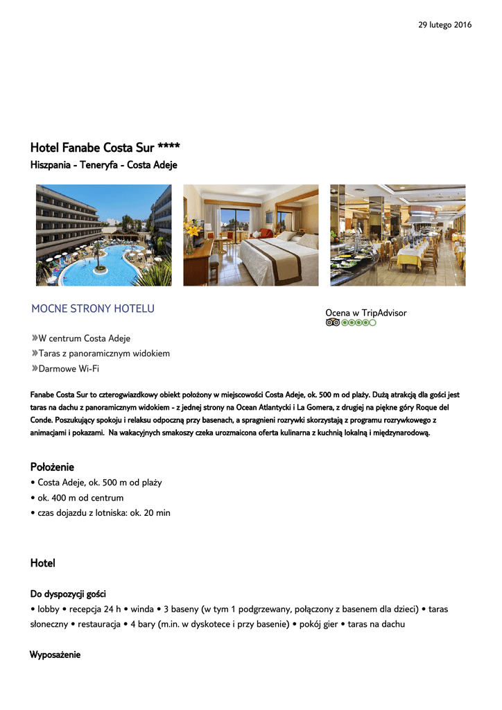 29 lutego 2016 Biuro Podrozy TU I TAM ul. Odrodzenia 3a 59-300 Lubin [email protected] 76 846 18 02 Hotel Fanabe Costa Sur **** Państwa konsultant: Krzysztof Raczkowiak e-mail: [email protected] Hiszpania - Teneryfa - Costa Adeje MOCNE STRONY HOTELU Ocena w TripAdvisor »W centrum Costa Adeje »Taras z panoramicznym widokiem »Darmowe Wi-Fi Fanabe Costa Sur to czterogwiazdkowy obiekt położony w miejscowości Costa Adeje, ok. 500 m od plaży. Dużą atrakcją dla gości jest taras na dachu z panoramicznym widokiem - z jednej strony na Ocean Atlantycki i La Gomera, z drugiej na piękne góry Roque del Conde. Poszukujący spokoju i relaksu odpoczną przy basenach, a spragnieni rozrywki skorzystają z programu rozrywkowego z animacjami i pokazami. Na wakacyjnych smakoszy czeka urozmaicona oferta kulinarna z kuchnią lokalną i międzynarodową. Położenie • Costa Adeje, ok. 500 m od plaży • ok. 400 m od centrum • czas dojazdu z lotniska: ok. 20 min Hotel Do dyspozycji gości • lobby • recepcja 24 h • winda • 3 baseny (w tym 1 podgrzewany, połączony z basenem dla dzieci) • taras słoneczny • restauracja • 4 bary (m.in. w dyskotece i przy basenie) • pokój gier • taras na dachu Wyposażenie • Wi-Fi (w całym hotelu, w cenie) • ręczniki kąpielowe (za kaucją) • leżaki, parasole (przy basenie, w cenie) Dodatkowe udogodnienia • sklep z pamiątkami • fryzjer • sala konferencyjna • minimarket • dyskoteka Karty Visa, MasterCard, American Express Kategoria lokalna 4 gwiazdki Dodatkowe informacje • hotel nie akceptuje zwierząt domowych • pakiet dla nowożeńców (butelka wina musującego i kosz owoców na powitanie; pakiet obowiązuje przy pobycie min. 5 nocy) Liczba pokojów 413 Pokoje Pokój dla dorosłego z dzieckiem (DSX1) • 2-3 os. • ok. 40 m2 • balkon • wanna • WC • klimatyzacja • TV sat. • telefon • sejf (płatny) • minibar (płatny) • Wi-Fi (w cenie) Pokój 2-osobowy (DZX1) • 1-4 os. • ok. 40 m2 • balkon • wanna • WC • klimatyzacja • TV sat. • telefon • sejf (płatny) • minibar (płatny) • Wi-Fi (w cenie) Pokój ekonomiczny (DZZ1) Pokoje ekonomiczne to dobry wybór dla osób, którym zależy na pobycie w hotelu w najniższej możliwej cenie. Pokoje mogą różnić się wielkością, lokalizacją lub wyposażeniem od tych znajdujących się w regularnej ofercie danego obiektu. Z reguły nie ma możliwości wymiany pokoju ekonomicznego na inny. Suita junior (JSX1) • 2-3 os. • ok. 60 m2 • balkon • wanna • WC • klimatyzacja • pokój dzienno-sypialny • TV sat. • telefon • sejf (płatny) • minibar (płatny) • Wi-Fi (w cenie) Wyżywienie Dwa posiłki • śniadanie i kolacja w formie bufetu All inclusive • śniadanie, obiad i kolacja w formie bufetu • napoje bezalkoholowe i lokalne napoje alkoholowe (9.00-24.00) • przekąski • po południu kawa, herbata, ciasta Pełne wyżywienie • śniadanie, obiad i kolacja w formie bufetu Dla dzieci • animacje dla dzieci • miniklub dla dzieci 4-12 lat • basen dla dzieci • plac zabaw • łóżeczko dziecięce (w cenie) • minidyskoteka • opieka nad dziećmi (na zapytanie, płatna) Sport i Wellness W cenie • siłownia • tenis (wypożyczenie sprzętu za kaucją) Płatne • jacuzzi • sauna • masaże • zabiegi kosmetyczne Rozrywka • wieczorne animacje • dyskoteka • pokazy • muzyka na żywo