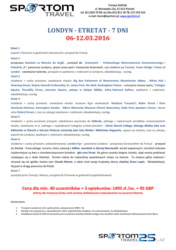 Tomasz Zieliński ul. Morawska 15a, 61-615 Poznań tel. (61) 820 70 69; tel./fax (61) 812 18 78; 515 550 526 e-mail: [email protected]; www.sportom.pl LONDYN - ETRETAT - 7 DNI 06-12.03.2016 Dzień 1 wyjazd z Poznania w godzinach wieczornych, przejazd do Francji. Dzień 2 przeprawa Kanałem La Manche do Anglii , przejazd do Greenwich - Królewskiego Obserwatorium Astronomicznego i Południk „0”, panorama Londynu, spacer przez park i miasteczko Greenwich, rejs statkiem po Tamizie, Tower Bridge i Tower of London - zwiedzanie twierdzy, przejazd na spotkanie z rodzinami w Londynie, obiadokolacja, nocleg. Dzień 3 śniadanie + suchy prowiant, zwiedzanie miasta: Big Ben, Parlament of Westminster, Westminster Abbey , White Hall i Downing Street, Stajnie Gwardii Królewskiej, St. James Park, the Mall, Buckingham Palace – uroczysta zmiana warty, Trafalgar Square, Piccadilly Circus, Leicester Square, zakupy w sklepie M&Ms, Soho, National Gallery, spotkanie z rodzinami, obiadokolacja, nocleg. Dzień 4 śniadanie + suchy prowiant, zwiedzanie miasta: museum figur woskowych Madame Tussaud’s, Baker Street i Dom Sherlocka Holmesa, Kensington Garden - Albert Memorial, Muzeum Historii Naturalnej, Hyde Park, Speakers Corner, słynna ulica Oxford Street, ( czas na zakupy) spotkanie z rodzinami, obiadokolacja, nocleg. Dzień 5 śniadanie + suchy prowiant, przejazd, całodzienna wycieczka do Oxfordu, jednego z najstarszych ośrodków uniwersyteckich świata, zwiedzanie m.in. jednego z największych kolegiów uniwersyteckich - Christ Church College, którego Wielka Sala oraz biblioteka w filmach o Harrym Potterze zaistniały jako Sala Wielka i Biblioteka Hogwartu, spacer po mieście, czas na zakupy, powrót do Londynu, spotkanie z rodzinami, obiadokolacja, nocleg Dzień 6 śniadanie + suchy prowiant, wykwaterowanie, London Eye - panorama Londynu - przeprawa Eurotunelem do Francji - przejazd do Etretat - francuskiego kurortu, który zasłynął z klifów morskich w Górnej Normandii, wśród wapiennych, morskich kolosów najsłynniejsze są dwa o charakterystycznym kształcie: Igła oraz Drzwi. Na górze urwiska biegnie ścieżka, skąd można podziwiać rozbijający się o skały Atlantyk. Etretat należy do najbardziej zjawiskowych miejsc na świecie. To miejsce gdzie malował i ukrywał się od zgiełku miasta sam Claude Monet, a także miał swoją kryjówkę słynny złodziej Arsen Lupin. Obiadokolacja. Wyjazd w drogę powrotna do Polski. Dzień 7 przejazd przez Francję i Niemcy, przyjazd do Poznania w godzinach popołudniowych. Cena dla min. 40 uczestników + 3 opiekunów: 1495 zł /os. + 95 GBP (oferty dla mniejszej liczby osób zostaną skalkulowane indywidualnie na życzenie Klienta) ŚWIADCZENIA: Transport autokarem LUX, opieka pilota, ubezpieczenie NNW + KL Noclegi oraz wyżywienie u sprawdzonych rodzin angielskich(4x śniadanie, 4x suchy prowiant, 4x obiadokolacja) Dodatkowa kwota 95 GBP przeznaczona jest na pokrycie kosztów biletów wstępu oraz wszelkich opłat walutowych dokonywanych przez Biuro.