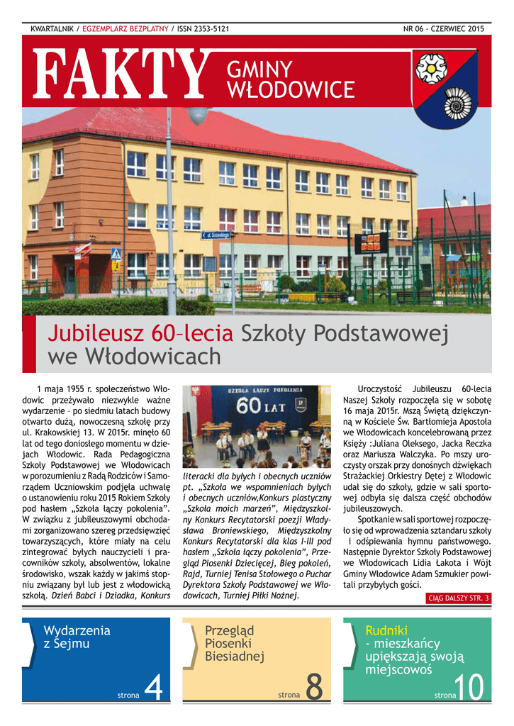 kwartalnik / egzemplarz bezpłatny / ISSN 2353-5121 Nr 06 - czerwieC 2015 GMINY WŁODOWICE Jubileusz 60–lecia Szkoły Podstawowej we Włodowicach 1 maja 1955 r. społeczeństwo Włodowic przeżywało niezwykle ważne wydarzenie – po siedmiu latach budowy otwarto dużą, nowoczesną szkołę przy ul. Krakowskiej 13. W 2015r. minęło 60 lat od tego doniosłego momentu w dziejach Włodowic. Rada Pedagogiczna Szkoły Podstawowej we Włodowicach w porozumieniu z Radą Rodziców i Samorządem Uczniowskim podjęła uchwałę o ustanowieniu roku 2015 Rokiem Szkoły pod hasłem „Szkoła łączy pokolenia”. W związku z jubileuszowymi obchodami zorganizowano szereg przedsięwzięć towarzyszących, które miały na celu zintegrować byłych nauczycieli i pracowników szkoły, absolwentów, lokalne środowisko, wszak każdy w jakimś stopniu związany był lub jest z włodowicką szkołą. Dzień Babci i Dziadka, Konkurs Wydarzenia z Sejmu literacki dla byłych i obecnych uczniów pt. „Szkoła we wspomnieniach byłych i obecnych uczniów,Konkurs plastyczny „Szkoła moich marzeń”, Międzyszkolny Konkurs Recytatorski poezji Władysława Broniewskiego, Międzyszkolny Konkurs Recytatorski dla klas I-III pod hasłem „Szkoła łączy pokolenia”, Przegląd Piosenki Dziecięcej, Bieg pokoleń, Rajd, Turniej Tenisa Stołowego o Puchar Dyrektora Szkoły Podstawowej we Włodowicach, Turniej Piłki Nożnej. Przegląd Piosenki Biesiadnej strona 4 strona 8 Uroczystość Jubileuszu 60-lecia Naszej Szkoły rozpoczęła się w sobotę 16 maja 2015r. Mszą Świętą dziękczynną w Kościele Św. Bartłomieja Apostoła we Włodowicach koncelebrowaną przez Księży :Juliana Oleksego, Jacka Reczka oraz Mariusza Walczyka. Po mszy uroczysty orszak przy donośnych dźwiękach Strażackiej Orkiestry Dętej z Włodowic udał się do szkoły, gdzie w sali sportowej odbyła się dalsza część obchodów jubileuszowych. Spotkanie w sali sportowej rozpoczęło się od wprowadzenia sztandaru szkoły i odśpiewania hymnu państwowego. Następnie Dyrektor Szkoły Podstawowej we Włodowicach Lidia Łakota i Wójt Gminy Włodowice Adam Szmukier powitali przybyłych gości. ciąg dalszy str. 3 Rudniki - mieszkańcy upiększają swoją miejscowoś 10 strona Numer 02 (6)/2015 Fakty Gminy Włodowice ogłoszenie K O M U N I KAT 31 maja 2015 roku odbyły się wybory do Rady Powiatowej Śląskiej Izby Rolniczej. Przedstawicielem z terenu Gminy Włodowice do Rady Powiatowej Śląskiej Izby Rolniczej został Pan Marek Wnuk. K O M U N I KAT o obowiązku posiadania numerów porządkowych Wójt Gminy Włodowice uprzejmie przypomina, iż na podstawie art.47b ustawy z dnia 17 maja 1989r - Prawo Geodezyjne i Kartograficzne (tj. Dz. U. z 2015r poz. 520) właściciele nieruchomości zabudowanych lub inne podmioty uwidocznione w ewidencji gruntów i budynków, które takimi nieruchomościami władają, mają obowiązek umieszczenia w widocznym miejscu na ścianie frontowej budynku tabliczki z numerem porządkowym. Na tabliczce oprócz numeru porządkowego zamieszcza się również nazwę ulicy, a w miejscowościach bez ulic nazwę miejscowości. W przypadku gdy budynek położony jest w głębi ogrodzonej nieruchomości, tabliczkę z numerem porządkowym umieszcza się również na ogrodzeniu. Takie rozwiązania w znaczącym stopniu ułatwiają prace służb porządkowych i ratunkowych. Jesienią br. służby Urzędu Gminy przeprowadzą kontrolę posiadania numeru porządkowego na posesjach. GMINY WŁODOWICE Egzemplarz bezpłatny - Kwartalnik Redaktor naczelnA: Sylwia Surowiec Skład redakcji: Małgorzata Konarska, Jolanta Janoska, Barbara Okraska, Elżbieta Trepka, Aneta Wieczorek Adres Redakcji: Urząd Gminy Włodowice ul. Krakowska 26 42-421 Włodowice WYDAWCA: GMINA WŁODOWICE ul. Krakowska 26, 42-421 Włodowice DRUK: media11.pl – Drukarnia Internetowa Al. Kołłątaja 73, 42-500 Będzin Redakcja nie odpowiada za treść ogłoszeń i reklam. Zastrzegamy sobie prawo skracania i adiustacji tekstów oraz zmiany ich tytułów. Materiałów niezamówionych Redakcja nie zwraca. Redakcja nie gwarantuje publikacji niezamówionych materiałów. Redakcja nie zawsze podziela poglądy i opinie zawarte w materiałach drukowanych w Faktach Gminy Włodowice. INFORMACJA KIOSKI Z PRACĄ Szukasz pracy? Jesteś bezrobotny i chcesz to zmienić? LOYD Spółka Akcyjna stworzyła oprogramowanie służące aktywizacji zawodowej mieszkańców, gdzie na bieżąco są aktualizowane oferty pracy z rynku: lokalnego, ogólnokrajowego oraz zza granicy. Osoby zainteresowane mogą skorzystać ze stanowisk komputerowych w Sali komputerowej w GOK Włodowice ( ul. Żarecka 59 ) oraz w Punkcie Filialnym Szkoły Podstawowej Włodowice w Zdowie ( ul. Topolowa 1 ). Zgłoś! Masz ciekawe hobby? Piszesz wiersze, albo coś zbierasz i chcesz zaprezentować swoją kolekcję. Zgłoś się do nas i podziel swoją pasją! Zainteresowanych prosimy o kontakt z Redakcją. 2 3 Fakty Gminy Włodowice Numer 02 (06)/2015 Jubileusz 60–lecia Uroczystość zaszczycili swoją obecnością, m.in.: Anna Nemś - Poseł na Sejm Rzeczypospolitej Polskiej, Stanisław Dąbrowa – Wicemarszałek Województwa Śląskiego, Cezary Barczyk - Członek Zarządu Rady Powiatu w Zawierciu, Dorota Wnuk – Radna Powiatu Zawierciańskiego, Maria Utracka – St. Wizytator Kuratorium Oświaty w Katowicach – absolwentka szkoły, Alojzy Leśniak – Przewodniczący Rady Gminy Włodowice, oraz Radni Gminy Włodowice, Małgorzata Konarska – Sekretarz Gminy Włodowice, Katarzyna Kochman – Skarbnik Gminy Włodowice, Absolwenci szkoły z różnych roczników, obecni oraz emerytowani Nauczyciele i Pracownicy Niepedagogiczni oraz Uczniowie Szkoły Podstawowej we Włodowicach wraz z Rodzicami, a także Mieszkańcy Włodowic i innych miejscowości. Po powitaniu Dyrektor szkoły przedstawiła historię powstania szkoły. Podkreśliła, że szkoła to nie mury czy jej wyposażenie, ale to przede wszystki