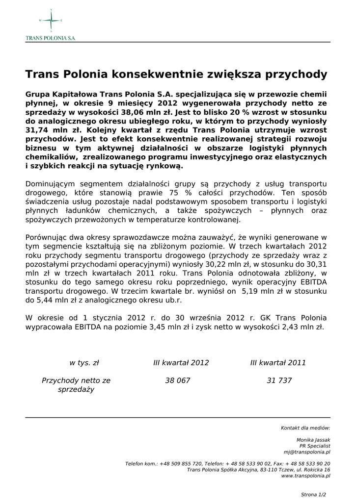 Trans Polonia konsekwentnie zwiększa przychody Grupa Kapitałowa Trans Polonia S.A. specjalizująca się w przewozie chemii płynnej, w okresie 9 miesięcy 2012 wygenerowała przychody netto ze sprzedaży w wysokości 38,06 mln zł. Jest to blisko 20 % wzrost w stosunku do analogicznego okresu ubiegłego roku, w którym to przychody wyniosły 31,74 mln zł. Kolejny kwartał z rzędu Trans Polonia utrzymuje wzrost przychodów. Jest to efekt konsekwentnie realizowanej strategii rozwoju biznesu w tym aktywnej działalności w obszarze logistyki płynnych chemikaliów, zrealizowanego programu inwestycyjnego oraz elastycznych i szybkich reakcji na sytuację rynkową. Dominującym segmentem działalności grupy są przychody z usług transportu drogowego, które stanowią prawie 75 % całości przychodów. Ten sposób świadczenia usług pozostaje nadal podstawowym sposobem transportu i logistyki płynnych ładunków chemicznych, a także spożywczych – płynnych oraz spożywczych przewożonych w temperaturze kontrolowanej. Porównując dwa okresy sprawozdawcze można zauważyć, że wyniki generowane w tym segmencie kształtują się na zbliżonym poziomie. W trzech kwartałach 2012 roku przychody segmentu transportu drogowego (przychody ze sprzedaży wraz z pozostałymi przychodami operacyjnymi) wyniosły 30,22 mln zł, w stosunku do 30,31 mln zł w trzech kwartałach 2011 roku. Trans Polonia odnotowała zbliżony, w stosunku do tego samego okresu roku poprzedniego, wynik operacyjny EBITDA transportu drogowego. W trzecim kwartale br. wyniósł on 5,19 mln zł w stosunku do 5,44 mln zł z analogicznego okresu ub.r. W okresie od 1 stycznia 2012 r. do 30 września 2012 r. GK Trans Polonia wypracowała EBITDA na poziomie 3,45 mln zł i zysk netto w wysokości 2,43 mln zł. w tys. zł Przychody netto ze sprzedaży III kwartał 2012 38 067 III kwartał 2011 31 737 Kontakt dla mediów: Monika Jassak PR Specialist [email protected] Telefon kom.: +48 509 855 720, Telefon: + 48 58 533 90 02, Fax: + 48 58 533 90 20 Trans Polonia Spółka Akcyjna, 83-110 Tczew, ul. Rokicka 16 www.transpolonia.pl Strona 1/2 EBITDA Zysk netto 3 448 2 427 4 845 3 448 Utrzymanie zeszłorocznych wyników w transporcie drogowym, przy jednoczesnym wzroście sprzedaży w transporcie intermodalnym, było możliwe dzięki przeprowadzonym inwestycjom w specjalistyczne jednostki transportowe, dedykowane do przewozu ładunków chemicznych i spożywczych, czyli ciągniki siodłowe, naczepy-cysterny, naczepy-podwozia oraz naczepy chłodnie. - „Poczynione inwestycje pozwoliły na wzrost, w stosunku do zeszłego roku, realizacji zleceń przy wykorzystaniu taboru własnego oraz elastycznego dostosowania usług do potrzeb klientów w zakresie logistyki ładunków. W zależności od odległości między miejscami docelowymi, jak również ilości przewożonego rodzaju ładunku, Trans Polonia od 2011 roku dodatkowo realizuje usługi transportu intermodalnego, przy wykorzystaniu również innych gałęzi transportu czyli transportu kolejowego oraz morskiego” – podsumował Dariusz Cegielski, Prezes Zarządu Trans Polonia S.A. Na wynikach segmentu transport intermodalny w III kwartale 2012 roku zaważył fakt, że ponoszone koszty stałe zaangażowania w ten segment działalności nie były równoważone przez regularne potoki ładunków (a w ślad za tym – przychodów i marży), obsługiwanych w tym segmencie. Tym samym - koszty dzierżawy tank kontenerów obciążyły wyniki tego segmentu, , co przełożyło się na wyniki finansowe całej Grupy. - „W odpowiedzi na zaobserwowaną w III kwartale niekorzystną tendencję w zakresie rentowności segmentu transportu intermodalnego bezzwłocznie podjęliśmy działania zmierzające do uelastycznienia struktury kosztów w tym segmencie, przyjmując, że niesatysfakcjonująca rentowność wymaga podjęcia szybkich zmian. Wzięliśmy pod uwagę fakt, iż przejściowo mogło się to odbić na wyhamowaniu dynamiki wzrostu udziału tego segmentu w całej działalności, jednak kroki te były niezbędne do poprawienia wyników w przyszłości” – informuje Krzysztof Luks, Dyrektor Finansowy Trans Polonia S.A. Kontakt dla mediów: Monika Jassak PR Specialist [email protected] Telefon kom.: +48 509 855 720, Telefon: + 48 58 533 90 02, Fax: + 48 58 533 90 20 Trans Polonia Spółka Akcyjna, 83-110 Tczew, ul. Rokicka 16 www.transpolonia.pl Strona 2/2 Powered by TCPDF (www.tcpdf.org)
