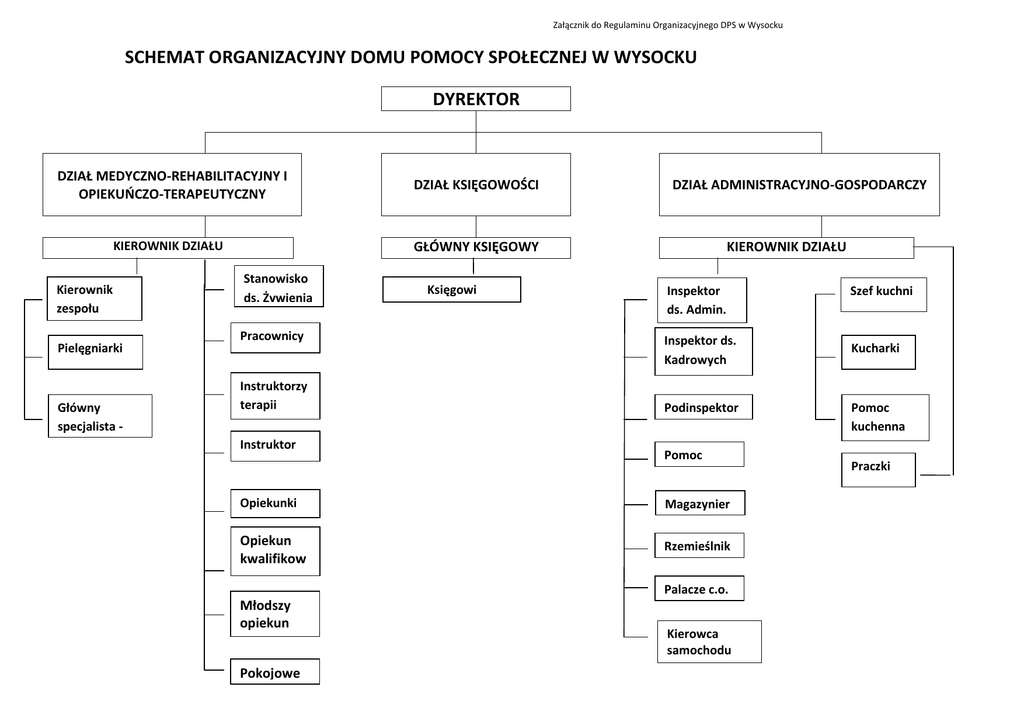 Załącznik do Regulaminu Organizacyjnego DPS w Wysocku SCHEMAT ORGANIZACYJNY DOMU POMOCY SPOŁECZNEJ W WYSOCKU DYREKTOR DZIAŁ MEDYCZNO-REHABILITACYJNY I OPIEKUŃCZO-TERAPEUTYCZNY KIEROWNIK DZIAŁU Kierownik zespołu pielęgniarek Pielęgniarki Główny specjalista fizjoterapeuta DZIAŁ KSIĘGOWOŚCI DZIAŁ ADMINISTRACYJNO-GOSPODARCZY GŁÓWNY KSIĘGOWY Stanowisko ds. Żywienia Pracownicy socjalni Instruktorzy terapii zajęciowej Instruktor ds. kultoświatowyc h Opiekunki Opiekun kwalifikow any w DPS Młodszy opiekun Pokojowe Księgowi KIEROWNIK DZIAŁU Inspektor ds. Admin. Gosp. Inspektor ds. Kadrowych Szef kuchni Podinspektor Pomoc kuchenna Pomoc biurowa Magazynier Rzemieślnik Palacze c.o. Kierowca samochodu Kucharki Praczki
