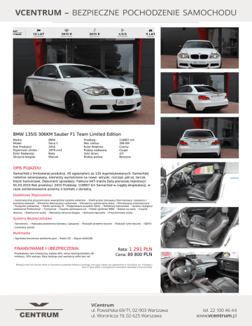 BMW 135iS 306KM Sauber F1 Team Limited Edition Marka: Model: Rok Produkcji: Pojemność silnika : Kolor Nadwozia: Skrzynia biegów: BMW Seria 1 2010 2979 cm3 Biały Manual Przebieg : Moc silnika : Kolor Wnętrza: Rodzaj nadwozia: Ilość drzwi: Rodzaj paliwa: 118907 km 306 KM Czarny Coupe 2/3 Benzyna OPIS POJAZDU: Samochód z limitowanej produkcji, 45 egzemplarz ze 135 wyprodukowanych. Samochód rzetelnie serwisowany, elementy wymienione na nowe: wtryski, rozrząd, pół oś, tarcze, klocki hamulcowe. Dokument sprzedaży: Faktura VAT-marża Data pierwszej rejestracji: 01.03.2010 Rok produkcji: 2010 Przebieg: 118907 km Samochód w ciągłej eksploatacji, w razie zainteresowania prosimy o kontakt z doradcą. Dodatkowe Wyposażenie ✓Automatycznie przyciemniane wewnętrzne lusterko wsteczne ✓Elektrycznie sterowany fotel kierowcy i pasażera z pamięcią ustawień ✓Elementy dekoracyjne carbonowe ✓Kierownica wykończona skórą ✓Klimatyzacja automatyczna ✓Komputer pokładowy ✓Pakiet sportowy M ✓Podgrzewane przednie fotele ✓Reflektory ksenonowe ✓System nawigacji satelitarnej Professional ✓Tempomat ✓Czujniki parkowania tył ✓Fotele sportowe BMW ✓Rękaw na narty ✓Czujnik deszczu ✓Elektryczne szyby ✓Manualna skrzynia biegów ✓Skórzana tapicerka ✓Przyciemniane szyby Systemy Bezpieczeństwa ✓Servotronic ✓Poduszka powietrzna kierowcy i pasażera ✓Poduszki przednie boczne ✓Poduszki tylne boczne ✓ISOFIX ✓Centralny zamek Multimedia ✓Sportowa kierownica wielofunkcyjna ✓Radio CD ✓Złącze AUX/USB FINANSOWANIE I UBEZPIECZENIA: Przykładowa rata miesięczna, wpłata 20%, okres leasingu/kredytu 48 miesięcy, 10% wykupu. Rata leasingu jest wartością netto bez vat. Rata: 1 291 Cena: 89 800 PLN PLN Niniejsza treść nie stanowi oferty w rozumieniu przepisów Kodeksu Cywilnego oraz opisu towaru ani zapewnienia w rozumieniu art. 4 Ustawy z dnia 27 lipca 2002r o szczególnych warunkach sprzedaży konsumenckiej. Powered by TCPDF (www.tcpdf.org)