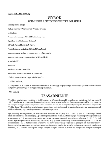 Sygn. akt I ACa 1375/14 WYROK W IMIENIU RZECZYPOSPOLITEJ POLSKIEJ Dnia 19 marca 2015 r. Sąd Apelacyjny w Warszawie I Wydział Cywilny w składzie: Przewodniczący: SSA Lidia Sularzycka Sędziowie: SA Roman Dziczek SO del. Paweł Iwaniuk (spr.) Protokolant: ref. staż. Michał Strzelczyk po rozpoznaniu w dniu 12 marca 2015 r. w Warszawie na rozprawie sprawy z powództwa M. C. (1) i E. C. przeciwko K. I. o zapłatę na skutek apelacji powodów od wyroku Sądu Okręgowego w Warszawie z dnia 6 czerwca 2014r., sygn. akt I C 427/13 I. oddala apelację, II. zasądza od M. C. (2) i E. C. solidarnie na rzecz K. I. kwotę 5400 (pięć tysięcy czterysta) zł tytułem zwrotu kosztów zastępstwa procesowego w postępowaniu apelacyjnym. I ACa 1375/14 UZASADNIENIE Wyrokiem z dnia 6 czerwca 2014 r. Sąd Okręgowy w Warszawie oddalił powództwo o zapłatę od K. I. na rzecz E. i M. C. (2) kwoty 300.000,00 zł stanowiącej sumę dwukrotności zadatku, danego przez powodów przy zawarciu umowy przedwstępnej sprzedaży lokalu z dnia 7 sierpnia 2012 r., dla którego Sąd Rejonowy dla Wrocławia-Krzyków IV Wydział Ksiąg Wieczystych prowadzi księgę wieczystą nr (...). Sąd zasądził również od powodów na rzecz pozwanych solidarnie kwotę 7.230,00 zł. tytułem zwrotu kosztów procesu. Sąd pierwszej instancji ustalił, że nieruchomość położona we W. przy ul. (...) de C. (...)we W. składa się z dwóch lokali mieszkalnych: oznaczonego (...) położonego na parterze budynku, stanowiącego własność pozwanej oraz lokalu oznaczonego nr (...), usytuowanego na pierwszym piętrze nieruchomości, stanowiącego własność E. i M. C. (2). Jak ustalał Sąd Okręgowy lokal mieszkalny oznaczony nr (...) został przekazany aktem darowizny przez J. i D. M. na rzecz ich córki – K. I.. Jednocześnie, ustanowili oni prawo dożywocia, polegające na przyjęciu ich na domowników i dostarczeniu im mieszkania, wyżywienia, utrzymania, światła i opału. Ze względu na brak porozumienia z rodzicami pozwanej, E. C. w dniu 29 sierpnia 2003 r. złożyła do sądu wniosek o podział do korzystania z części wspólnych budynku. W dniu 24 sierpnia 2010 r. J. M. zmarł, a w związku z podeszłym wiekiem i stanem zdrowia matki, pozwana zorganizowała jej przeprowadzkę, podejmując jednocześnie decyzję o sprzedaży lokalu. W dniu 07 sierpnia 2012 r. strony zawarły umowę sprzedaży lokalu mieszkalnego nr (...), położonego przy ul. (...) we W., dla którego Sąd Rejonowy dla Wrocławia-Krzyków we Wrocławiu prowadzi księgę wieczystą nr (...). Umowa przedwstępna zobowiązywała powodów do zakupu przedmiotowej nieruchomości do dnia 31 października 2012 r. za cenę 550.000,00 zł. Zabezpieczeniem wykonania powyższej umowy – jak ustalił sąd I Instancji – był zadatek w wysokości 150.000,00 zł, który został zapłacony przez powodów w całości. Pozwana zobowiązana była do sprzedaży przedmiotowej nieruchomości lokalowej w oznaczonej cenie do wskazanej daty, w razie zaś niewykonania zobowiązania, do zwrotu zadatku w podwójnej wysokości. Sprzedająca złożyła zapewnienie, iż nieruchomość nie jest obciążona żadnymi ograniczonymi prawami rzeczowymi, ani roszczeniami osób trzecich, jest wolna od jakichkolwiek ciężarów, obciążeń, roszczeń, hipotek oraz innych wad prawnych. Do października 2012 r. strony nie kontaktowały się ze sobą, zaś pismem z dnia 4 października 2012 r. powodowie poinformowali pozwaną o wyznaczeniu spotkania w kancelarii notarialnej we W. na dzień 25 października 2012 r. W dniu 23 października 2012 r. strony spotkały się w przedmiotowym mieszkaniu celem okazania i protokolarnego spisania liczników, w którym to spotkaniu brała udział również L. M.. Powodowie stwierdzili wówczas, iż oświadczenie matki pozwanej nie jest wystarczające i zażądali wykreślenia prawa dożywocia z księgi wieczystej nieruchomości, odwołując jednocześnie spotkanie wyznaczone u notariusza. W dniu 24 października 2012 r. pozwana złożyła do Sądu Rejonowego dla Wrocławia-Krzyków we Wrocławiu wniosek o dokonanie wpisu w księdze wieczystej przedmiotowej nieruchomości, poprzez wykreślenie prawa dożywocia ustanowionego na rzecz J. i D. M.. Wniosek zawierał oświadczenie D. M. z dnia 9 października 2012 r. o zrzeczeniu się prawa dożywocia. Sąd Okręgowy ustalił, że dla powodów działania pozwanej nie były wystarczające, w związku z czym pozwana zaproponowała podpisanie aneksu do umowy, w którym strony przedłużą termin do zawarcia umowy przyrzeczonej do dnia 12 listopada 2012 r. w celu wykreślenia wpisu w księdze wieczystej, jednak aneks ten nie został podpisany. W dniu 26 października 2012 r. pozwana zwróciła się do Sądu Rejonowego dla Wrocławia-Krzyków we Wrocławiu o przyspieszenie rozpoznania jej wniosku o wykreślenie prawa dożywocia z księgi wieczystej z uwagi na zbliżający się termin podpisania umowy. W dniu 29 października 2012 r. Sąd Rejonowy dla Wrocławia-Krzyków we Wrocławiu wykreślił prawo dożywocia, ustanowione na rzecz J. i D. M.. Dodatkowo, pozwana w dniu 30 października 2012 r. otrzymała od swojej matki – D. M. notarialne pełnomocnictwo w zakresie wykreślonego prawa dożywocia. Pozwana wraz z pośrednikiem nieruchomości stawiła się przed notariuszem w dniu 31 października 2012 r., natomiast powód stawił się bez powódki, oświadczając, iż do podpisania umowy nie dojdzie ze względu na wątpliwości w przedmiocie wygaśnięcia prawa dożywocia. Pozwana zaproponowała polubowne odstąpienie od umowy, zwracając cały zadatek, jednakże powód odmówił, tłumacząc, iż musi uzyskać w tej sprawie poradę prawną. Strony podpisały aneks do umowy przedłużający termin zawarcia umowy do dnia 12 listopada 2012 r. W wyznaczonym terminie powodowie nie stawili się. Pozwana w dniu 13 listopada 2013 r wezwała ich do przystąpienia do aktu notarialnego do dnia 30 listopada 2012 r. pod ryg