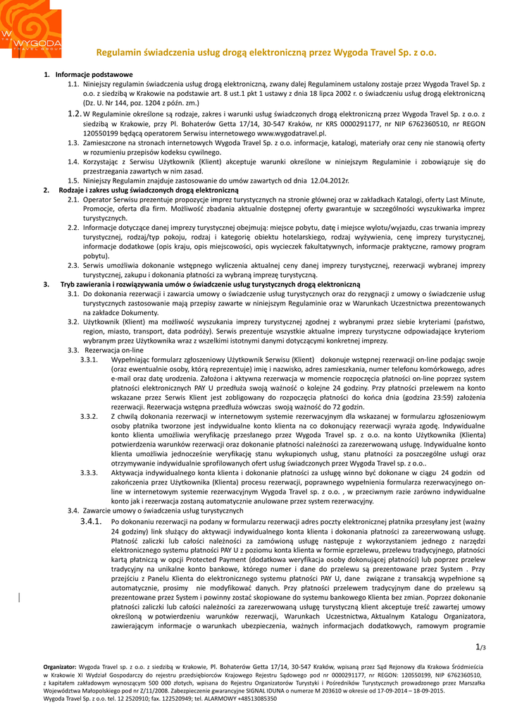 Regulamin świadczenia usług drogą elektroniczną przez Wygoda Travel Sp. z o.o. 1. Informacje podstawowe 1.1. Niniejszy regulamin świadczenia usług drogą elektroniczną, zwany dalej Regulaminem ustalony zostaje przez Wygoda Travel Sp. z o.o. z siedzibą w Krakowie na podstawie art. 8 ust.1 pkt 1 ustawy z dnia 18 lipca 2002 r. o świadczeniu usług drogą elektroniczną (Dz. U. Nr 144, poz. 1204 z późn. zm.) 1.2. W Regulaminie określone są rodzaje, zakres i warunki usług świadczonych drogą elektroniczną przez Wygoda Travel Sp. z o.o. z siedzibą w Krakowie, przy Pl. Bohaterów Getta 17/14, 30-547 Kraków, nr KRS 0000291177, nr NIP 6762360510, nr REGON 120550199 będącą operatorem Serwisu internetowego www.wygodatravel.pl. 1.3. Zamieszczone na stronach internetowych Wygoda Travel Sp. z o.o. informacje, katalogi, materiały oraz ceny nie stanowią oferty w rozumieniu przepisów kodeksu cywilnego. 1.4. Korzystając z Serwisu Użytkownik (Klient) akceptuje warunki określone w niniejszym Regulaminie i zobowiązuje się do przestrzegania zawartych w nim zasad. 1.5. Niniejszy Regulamin znajduje zastosowanie do umów zawartych od dnia 12.04.2012r. 2. Rodzaje i zakres usług świadczonych drogą elektroniczną 2.1. Operator Serwisu prezentuje propozycje imprez turystycznych na stronie głównej oraz w zakładkach Katalogi, oferty Last Minute, Promocje, oferta dla firm. Możliwość zbadania aktualnie dostępnej oferty gwarantuje w szczególności wyszukiwarka imprez turystycznych. 2.2. Informacje dotyczące danej imprezy turystycznej obejmują: miejsce pobytu, datę i miejsce wylotu/wyjazdu, czas trwania imprezy turystycznej, rodzaj/typ pokoju, rodzaj i kategorię obiektu hotelarskiego, rodzaj wyżywienia, cenę imprezy turystycznej, informacje dodatkowe (opis kraju, opis miejscowości, opis wycieczek fakultatywnych, informacje praktyczne, ramowy program pobytu). 2.3. Serwis umożliwia dokonanie wstępnego wyliczenia aktualnej ceny danej imprezy turystycznej, rezerwacji wybranej imprezy turystycznej, zakupu i dokonania płatności za wybraną imprezę turystyczną. 3. Tryb zawierania i rozwiązywania umów o świadczenie usług turystycznych drogą elektroniczną 3.1. Do dokonania rezerwacji i zawarcia umowy o świadczenie usług turystycznych oraz do rezygnacji z umowy o świadczenie usług turystycznych zastosowanie mają przepisy zawarte w niniejszym Regulaminie oraz w Warunkach Uczestnictwa prezentowanych na zakładce Dokumenty. 3.2. Użytkownik (Klient) ma możliwość wyszukania imprezy turystycznej zgodnej z wybranymi przez siebie kryteriami (państwo, region, miasto, transport, data podróży). Serwis prezentuje wszystkie aktualne imprezy turystyczne odpowiadające kryteriom wybranym przez Użytkownika wraz z wszelkimi istotnymi danymi dotyczącymi konkretnej imprezy. 3.3. Rezerwacja on-line 3.3.1. Wypełniając formularz zgłoszeniowy Użytkownik Serwisu (Klient) dokonuje wstępnej rezerwacji on-line podając swoje (oraz ewentualnie osoby, którą reprezentuje) imię i nazwisko, adres zamieszkania, numer telefonu komórkowego, adres e-mail oraz datę urodzenia. Założona i aktywna rezerwacja w momencie rozpoczęcia płatności on-line poprzez system płatności elektronicznych PAY U przedłuża swoją ważność o kolejne 24 godziny. Przy płatności przelewem na konto wskazane przez Serwis Klient jest zobligowany do rozpoczęcia płatności do końca dnia (godzina 23:59) założenia rezerwacji. Rezerwacja wstępna przedłuża wówczas swoją ważność do 72 godzin. 3.3.2. Z chwilą dokonania rezerwacji w internetowym systemie rezerwacyjnym dla wskazanej w formularzu zgłoszeniowym osoby płatnika tworzone jest indywidualne konto klienta na co dokonujący rezerwacji wyraża zgodę. Indywidualne konto klienta umożliwia weryfikację przesłanego przez Wygoda Travel sp. z o.o. na konto Użytkownika (Klienta) potwierdzenia warunków rezerwacji oraz dokonanie płatności należności za zarezerwowaną usługę. Indywidualne konto klienta umożliwia jednocześnie weryfikację stanu wykupionych usług, stanu płatności za poszczególne usługi oraz otrzymywanie indywidualnie sprofilowanych ofert usług świadczonych przez Wygoda Travel sp. z o.o.. 3.3.3. Aktywacja indywidualnego konta klienta i dokonanie płatności za usługę winno być dokonane w ciągu 24 godzin od zakończenia przez Użytkownika (Klienta) procesu rezerwacji, poprawnego wypełnienia formularza rezerwacyjnego online w internetowym systemie rezerwacyjnym Wygoda Travel sp. z o.o. , w przeciwnym razie zarówno indywidualne konto jak i rezerwacja zostaną automatycznie anulowane przez system rezerwacyjny. 3.4. Zawarcie umowy o świadczenia usług turystycznych 3.4.1. Po dokonaniu rezerwacji na podany w formularzu rezerwacji adres poczty elektronicznej płatnika przesyłany jest (ważny 24 godziny) link służący do aktywacji indywidualnego konta klienta i dokonania płatności za zarezerwowaną usługę. Płatność zaliczki lub całości należności za zamówioną usługę następuje z wykorzystaniem jednego z narzędzi elektronicznego systemu płatności PAY U z poziomu konta klienta w formie eprzelewu, przelewu tradycyjnego, płatności kartą płatniczą w opcji Protected Payment (dodatkowa weryfikacja osoby dokonującej płatności) lub poprzez przelew tradycyjny na unikalne konto bankowe, którego numer i dane do przelewu są prezentowane przez System . Przy przejściu z Panelu Klienta do elektronicznego systemu płatności PAY U, dane związane z transakcją wypełnione są automatycznie, prosimy nie modyfikować danych. Przy płatności przelewem tradycyjnym dane do przelewu są prezentowane przez System i powinny zostać skopiowane do systemu bankowego Klienta bez zmian. Poprzez dokonanie płatności zaliczki lub całości należności za zarezerwowaną usługę turystyczną klient akceptuje treść zawartej umowy określoną w potwierdzeniu warunków rezerwacji, Warunkach Uczestnictwa, Aktualnym K