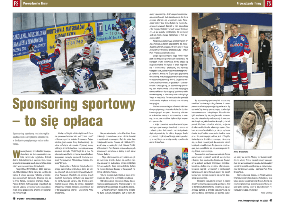 FS Prowadzenie firmy Prowadzenie firmy Sponsoring sportowy – to się opłaca Sponsoring sportowy jest niezwykle skutecznym narzędziem pomocnym w budowie pozytywnego wizerunku firmy. W naszej branży przedsiębiorstwa posługujące się tym narzędziem należą raczej do wyjątków. Jednak dobre doświadczenia i sukcesy firm, które promują się poprzez sport, z pewnością będą miały wpływ na zmianę tej sytuacji. Targi ISSA INTERCLEAN 2007 Warszawa. Odwiedzający targi zaraz po wejściu do hali nr 1 witani są przez hokeistę w niebiesko-czerwonych barwach. Okazuje się, że to Petr Tokoś, zawodnik znanego klubu – Polonii Bytom. Petr zaprasza wszystkich do wzięcia udziału w konkursach organizowanych przez producenta chemii profesjonalnej firmę Voigt. 46 Nr 2/2007 www.firmasprzatajaca.pl Co łączy Voigt’a z Polonią Bytom? Pytanie powinno brzmieć nie „co?”, lecz „kto”? – tłumaczą mi na stoisku firmowym. Odpowiedzią jest osoba Anny Brabańskiej i jej wiele mówiąca wizytówka. Z jednej strony widnieje Anna Brabańska, rzecznik prasowy, asystent zarządu PPUH Voigt Sp. z o.o. Na odwrocie wizytówki czytamy: Anna Brabańska prezes zarządu, kierownik drużyny żeńskiej Towarzystwo Miłośników Hokeja „Polonia” Bytom. – Lodowisko w Bytomiu to już od wczesnego dzieciństwa mój drugi dom. W wieku czterech lat zaczęłam trenować łyżwiar- stwo figurowe. Niestety po sześciu latach ciężkich treningów kontuzje nie pozwoliły mi kontynuować kariery. Nie trenowałam, miałam więcej czasu dla siebie. Zaczęłam chodzić na mecze hokeja i zakochałam się w tej dyscyplinie sportu – wspomina Anna Brabańska. Na potwierdzenie tych słów Pani Anna pokazuje prowadzone przez siebie kroniki z wycinkami prasowymi. Były to złote lata hokeja w Bytomiu. Polonia od 1984 do 1991 sześć razy wywalczyła tytuł Mistrza Polski. W kronikach Pani Prezes pełno odręcznych kolorowych obrazków, a każdy z nich sławi Polonię Bytom. – Moje kibicowanie to oczywiście nie tylko tworzenie kronik. Byłam na każdym meczu na naszym lodowisku, często jeździłam też na wyjazdy. Jako piętnastolatka byłam na meczu Pucharu Europy w Koszycach ra- zem z kibicami Polonii. Tak, to musiała być miłość, a skoro przetrwała do dziś, była to miłość prawdziwa. Od kibicowskiej miłości do klubu do poważnego zaangażowania finansowego w roli sponsora strategicznego droga była daleka. – Z Polonią Bytom nasza firma związana była, odkąd pamiętam. Był to taki do- raźny sponsoring. Jeśli czegoś konkretnego potrzebowali, była jakaś aukcja, to firma zawsze starała się wspomóc klub. Natomiast cztery lata temu byłam na meczu hokejowym gwiazd. Zagrali w nim zawodnicy z lat mojej młodości i wtedy wrócił ten bakcyl. Ja po prostu wiedziałam, że ten hokej jest we mnie i muszę zacząć coś w tym kierunku robić. Najpierw weszliśmy ze sponsoringiem firmy. Później zostałam zaproszona do zarządu jako członek zarządu. W tym roku w maju zostałam wybrana na prezesa klubu – mówi Pani Prezes Anna Brabańska. Dzięki sponsoringowi logo firmy Voigt jest na strojach sportowych hokeistów, na bandach i tafli lodowiska. Firma staje się rozpoznawalna nie tylko w skali regionalnej – w Bytomiu i okolicach, lecz również wszędzie tam, gdzie swoje mecze rozgrywają hokeiści. Hokej na Śląsku jest popularną dyscypliną. Mecze często transmitowane są w regionalnej telewizji TVP 3. Zdjęcia z meczów publikowane są w gazetach i czasopismach. Okazuje się, że sponsoring sportowy jest wielokrotnie tańszy niż tradycyjne formy reklamy. By osiągnąć podobny efekt marketingowy – mierzony obecnością loga Voigt w mediach, firma musiałaby ponieść 3-4-krotnie większe nakłady na reklamę tradycyjną. Nie bez znaczenia jest również fakt bardzo pozytywnego stosunku Polaków do firm inwestujących w sport. Jesteśmy złaknieni sukcesów naszych sportowców, a wiemy, że są one możliwe tylko dzięki wsparciu sponsorów. – Voigt poważnie wszedł w temat sponsoringu sportowego bardziej z serca niż z chęci zysku. Natomiast z radością dowiaduję się ostatnio, że kibice, kupując środki czystości, częściej wybierają nasze produkty z racji tego, że znają markę – podkreśla Anna Brabańska. By sponsoring sportowy był skuteczny, musi być to strategia długofalowa. Czasem pierwsze efekty pojawiają się po latach. By uprawiać tę formę sponsoringu, trzeba być konsekwentnym i cierpliwym. Filozofia Voigt’a wydawać by się mogła mało biznesowa, ale okazała się nadzwyczaj skuteczna. Nie liczyli na jakieś wielkie korzyści, chcieli pomóc klubowi: – Ludzie wiedzą, że ja nie działam w klubie dla własnego zysku. Szukam sponsorów dla klubu, a nie po to, by za chwilę kupić sobie nowe auto. Ludzie mnie przez to postrzegają: o Pani jest z Voigt’a, fantastyczne środki czyszczące, cieszymy się, że Pani z nami jest, bo właśnie takich ludzi potrzeba klubowi. To, jak mnie postrzegają inni, przekłada się na postrzeganie firmy, którą reprezentuję. Sponsoring sportowy pozwala się firmie pozytywnie wyróżnić spośród innych firm z branży lub środowiska lokalnego. Świadczy o dobrej kondycji finansowej przedsiębiorstwa, dodaje mu prestiżu. Ułatwia zdobywanie nagród i wyróżnień w konkursach biznesowych. W kryteriach oceny do takich konkursów zawsze znajduje się punkt: działania sponsorskie. – Polecam wszystkim firmom z naszej branży wejście w sponsoring sportowy. Jest to bardzo skuteczna forma reklamy, to się naprawdę opłaca, a przede wszystkim nic nie sprawia takiej satysfakcji jak pomoc klubo- FS Anna Brabańska wi, który się kocha. Miejmy też świadomość, że im więcej firm z naszej branży zaangażuje się we wspieranie sportu, tym bardziej wzrośnie prestiż całej branży, a na tym również bardzo nam zależy – zachęca Pani Anna Brabańska. Warto również dodać, że Voigt wspiera finans