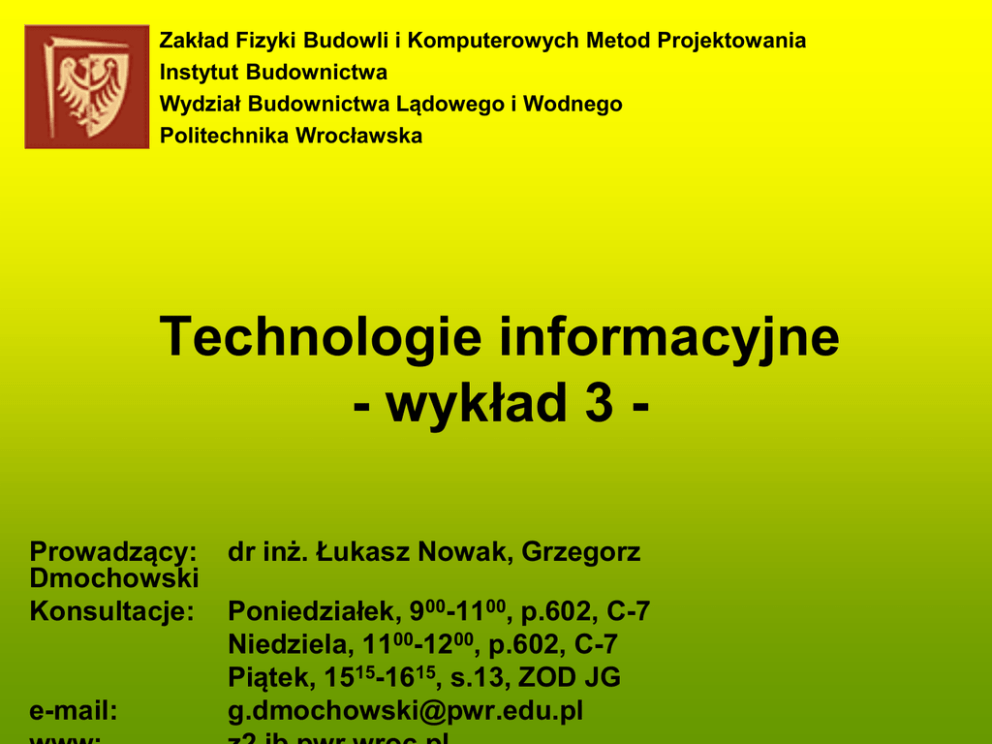 Zakład Fizyki Budowli i Komputerowych Metod Projektowania Instytut Budownictwa Wydział Budownictwa Lądowego i Wodnego Politechnika Wrocławska Technologie informacyjne - wykład 3 Prowadzący: Dmochowski Konsultacje: e-mail: dr inż. Łukasz Nowak, Grzegorz Poniedziałek, 900-1100, p.602, C-7 Niedziela, 1100-1200, p.602, C-7 Piątek, 1515-1615, s.13, ZOD JG [email protected] Podstawy systemów operacyjnych • • • • • • • Systemy operacyjne Pliki i foldery Atrybuty Standardy rozszerzeń Zestawy podstawowych komend Uruchamianie aplikacji Zarządzanie aplikacjami dr inż. Łukasz Nowak, Grzegorz Dmochowski System komputerowy System komputerowy to środowisko, w którym można wykonywać różnorodne zadania Hardware + Software = dr inż. Łukasz Nowak, Grzegorz Dmochowski System komputerowy System operacyjny System operacyjny (ang. operating system) jest programem, który pośredniczy między użytkownikiem komputera a sprzętem komputerowym. Jest niezbędny do prawidłowej pracy komputera i w pewnym sensie określa możliwości wykorzystania sprzętu i komfort pracy użytkownika. dr inż. Łukasz Nowak, Grzegorz Dmochowski Zadania systemu operacyjnego 1. Tworzyć wygodne i wydajne środowisko dla użytkownika systemu, 2. Zapewniać wydajną i bezawaryjną pracę wszystkich komponentów systemu komputerowego. W celu spełnienia tych zadań system operacyjny musi realizować pewne funkcje dr inż. Łukasz Nowak, Grzegorz Dmochowski Funkcje systemu operacyjnego • funkcja zarządzająca: zarządzanie pracą elementów systemu komputerowego, dostarczanie odpowiednich mechanizmów do użycia zasobów systemu i do pracy programów użytkowych, tworzenie środowiska do pracy innych programów. • funkcja dystrybucji zasobów: odpowiedni przydział (dystrybucja) zasobów poszczególnym programom, które zgłaszają potrzebę ich wykorzystania. programy użytkowe zgłaszają się do systemu operacyjnego z prośbą o przydzielenie im odpowiedniego zasobu. • funkcja sterująca: nadzorowanie działania programów użytkownika, przeciwdziałanie błędom i zapobiegania sytuacjom awaryjnym oraz nieprawidłowemu wykorzystaniu komputera. sterowanie pracą urządzeń wejścia-wyjścia i zapewnienie poprawnej współpracy jednostki centralnej z urządzeniami peryferyjnymi takimi jak klawiatura czy drukarka. dr inż. Łukasz Nowak, Grzegorz Dmochowski Struktura systemu operacyjnego Warstwa interfejsu (API) • zbiór poleceń (aplikacje <-> system operacyjny), • zestaw poleceń API systemu jest udokumentowany i udostępniany programistom. Warstwa jądra • prawidłowe wykorzystanie pamięci operacyjnej, • kontrola priorytetów wątków, • nadzór nad aktualnie wykonywanymi programami Warstwa sterowników urządzeń • fizyczna obsługa konkretnych urządzeń systemu komputerowego • niewielkie programy zwane sterownikami urządzeń dr inż. Łukasz Nowak, Grzegorz Dmochowski Rodzaje systemów operacyjnych Systemy wsadowe 1/6 • jedne z pierwszych systemów operacyjnych, • instalowane w pierwszych komputerach (urządzenia wejścia - czytniki kart perforowanych), • zasadnicze cechy wsadowego systemu operacyjnego: • • • brak kontroli użytkownika nad wykonywanymi zadaniami, wykonywanie przez jednostkę centralną tylko jednego zadania, bardzo długie okresy bezczynności jednostki centralnej (niska wydajność), • niskie wykorzystanie jednostki centralnej (przestoje spowodowane niską prędkością urządzeń wejściawyjścia), • aby podnieść wydajność takich systemów wprowadzono mechanizm, któremu nadano nazwę spooling. dr inż. Łukasz Nowak, Grzegorz Dmochowski Rodzaje systemów operacyjnych Systemy wieloprogramowe 2/6 • zastosowanie buforowania danych na dysku dało systemowi prawo wyboru!! • system operacyjny dysponuje magazynem zadań – wybiera zadania do wykonania tak, aby zmaksymalizować wydajność systemu: • • • • • wybrane zadania są umieszczane w pamięci operacyjnej, jednostka centralna rozpoczyna pracę nad jednym zadaniem, po pewnym czasie może okazać się, że wykonywane zadanie zażądało dostępu do dysku lub czytnika taśm, system operacyjny może odłożyć takie zadanie i pobrać do wykonania następne znajdujące się w pamięci operacyjnej, użytkownik nie miał możliwości ingerencji w wykonywany program w trakcie jego trwania. (musiał przewidzieć możliwe zachowania programu przed jego uruchomieniem) dr inż. Łukasz Nowak, Grzegorz Dmochowski Rodzaje systemów operacyjnych Systemy z podziałem czasu 3/6 • zwane też wielozadaniowymi (ang. multitasking) dzielą czas procesora między zadania umieszczone w pamięci, • jednostka centralna wykonuje jedno zadanie przez pewien czas, a następnie odkłada je i zabiera się za następne, • przełączenia między zadaniami występują na tyle szybko, że użytkownik może pracować z każdym z wykonywanych programów nie zauważając tych przełączeń, • użytkownik systemu komputerowego ma możliwość interakcji z systemem, • wydajny system operacyjny musi mieć: • • • bezpośredni dostępem do systemu plików, krótki czasem odpowiedzi, mechanizmy decyzyjne, zarządzania pamięcią, ochrony zadań, współpracy z dyskiem, synchronizacji zadań, komunikacji między zadaniami. dr inż. Łukasz Nowak, Grzegorz Dmochowski Rodzaje systemów operacyjnych Systemy równoległe 4/6 • są przystosowane do obsługi systemów komputerowych wyposażonych w więcej niż jeden procesor, • procesory te współpracują ze sobą wykorzystując wspólną szynę danych, zegar, pamięć i urządzenia wejścia-wyjścia, • zastosowanie systemów wieloprocesorowych może: • • • zwiększyć wydajność całego systemu, zmniejszyć koszty systemu poprzez wykorzystanie wspólnych urządzeń zewnętrznych, obudów, zasilaczy, podnieść niezawodność dzięki dublowaniu zadań. dr inż. Łukasz Nowak, Grzegorz Dmochowski Rodzaje systemów operacyjnych Systemy rozpros