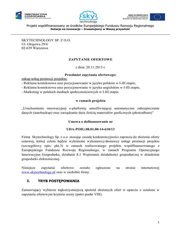 Projekt współfinansowany ze środków Europejskiego Funduszu Rozwoju Regionalnego Dotacje na innowacje – Inwestujemy w Waszą przyszłość SKYTECHNOLOGY SP. Z O.O. Ul. Głogowa 29/6 02-639 Warszawa ZAPYTANIE OFERTOWE z dnia: 20.11.2013 r. Przedmiot zapytania ofertowego: zakup usług promocji projektu: - Reklama kontekstowa oraz pozycjonowanie w języku polskim w I-III etapie, - Reklama kontekstowa oraz pozycjonowanie w języku angielskim w I-III etapie, - Marketing w polskich mediach społecznościowych w I-III etapie. w ramach projektu „Uruchomienie innowacyjnej e-platformy umożliwiającej automatyczne zabezpieczanie danych (autobackup) oraz zarządzanie duża ilością materiałów graficznych (photoalbum)” Umowa o dofinansowanie nr UDA-POIG.08.01.00-14-610/13 Firma Skytechnology Sp. z o.o. stosując zasadę konkurencyjności zaprasza do złożenia oferty cenowej, której celem będzie wyłonienie wykonawcy/dostawcy usługi promocji projektu (szczegółowy opis: pkt.3) w ramach realizowanego projektu współfinansowanego z Europejskiego Funduszu Rozwoju Regionalnego, w ramach Programu Operacyjnego Innowacyjna Gospodarka, działanie 8.1 Wspieranie działalności gospodarczej w dziedzinie gospodarki elektronicznej. Niniejsze zapytanie ofertowe zostało www.skytechnology.pl oraz w siedzibie firmy. I. ogłoszone na stronie internetowej TRYB POSTĘPOWANIA Zamawiający wybierze najkorzystniejszą spośród złożonych ofert w oparciu o ustalone w zapytaniu ofertowym kryteria oceny (patrz punkt VIII). 1 Projekt współfinansowany ze środków Europejskiego Funduszu Rozwoju Regionalnego Dotacje na innowacje – Inwestujemy w Waszą przyszłość II. INFORMACJE O ZAMAWIAJĄCYM SKYTECHNOLOGY SP. Z O.O. Ul. Głogowa 29/6 02-639 Warszawa NIP: 5213633370 REGON: 146200533 KRS: 0000426381 III. OPIS PRZEDMIOTU ZAPYTANIA OFERTOWEGO zakup usług promocji projektu: 1. Reklama kontekstowa oraz pozycjonowanie w jez. polskim: - SEO - pozycjonowanie serwisu prowadzenie stałych działań zmierzających do osiągniecia satysfakcjonujących i wysokich wyników obecności serwisu wśród wyników najważniejszych wyszukiwarek internetowych, w szczególności Google, - SEM (wybrane frazy kluczowe). 2. Reklama kontekstowa oraz pozycjonowanie w jez. angielskim: - SEO - pozycjonowanie serwisu prowadzenie stałych działań zmierzających do osiągniecia satysfakcjonujących i wysokich wyników obecności serwisu wśród wyników najważniejszych wyszukiwarek internetowych, w szczególności Google, - SEM (wybrane frazy kluczowe). 3. Marketing w polskich mediach społecznościowych: - działania w mediach społecznościach, profil na portalu Facebook, promocja e-usług wśród odbiorców indywidualnych, - działania e-PR oraz marketing wirusowy, - niestandardowe kampanie promocyjne prowadzone wspólnie z partnerami biznesowymi promocje, okazje itp. 4. Marketing tradycyjny (gadżety reklamowe, broszurki etc) na rynku polskim oraz amerykańskim. IV. TERMIN WYKONANIA PRZEDMIOTU ZAPYTANIA OFERTOWEGO Realizacja usługi powinna nastąpić w trzech etapach określonych terminami. Etap I: od dnia podpisania umowy z wykonawcą do dnia 31.01.2014r. zostaną wykonane / dostarczone wyszczególnione zadania: - Reklama kontekstowa oraz pozycjonowanie w języku polskim, - Reklama kontekstowa oraz pozycjonowanie w języku angielskim, 2 Projekt współfinansowany ze środków Europejskiego Funduszu Rozwoju Regionalnego Dotacje na innowacje – Inwestujemy w Waszą przyszłość - Marketing w polskich mediach społecznościowych. Etap II: 01.02.2014 do 31.05.2014r. zostaną wykonane / dostarczone wyszczególnione zadania: - Reklama kontekstowa oraz pozycjonowanie w języku polskim, - Reklama kontekstowa oraz pozycjonowanie w języku angielskim, - Marketing w polskich mediach społecznościowych. Etap III: od 01.06.2014r. do 31.10.2014r. zostaną wykonane / dostarczone wyszczególnione zadania: - Reklama kontekstowa oraz pozycjonowanie w języku polskim, - Reklama kontekstowa oraz pozycjonowanie w języku angielskim, - Marketing w polskich mediach społecznościowych. V. WYMAGANIA DOT. WYKONAWCY Wykonawca musi posiadać doświadczenie w prowadzeniu działań promocyjnych w kanale internetowym. VI. INNE ISTOTNE WARUNKI ZAPYTANIA OFERTOWEGO − Powyższe zapytanie ofertowe nie stanowi oferty zawarcia umowy ani też oferty prowadzenia negocjacji w tym celu i jest skierowane do wielu adresatów. − Zamawiający zastrzega sobie prawo do nieskorzystania z otrzymanej oferty bez podania przyczyny oraz do wystąpienia z zapytaniem dotyczącym dodatkowych informacji, dokumentów lub wyjaśnień. − W przypadku zakwalifikowania do dalszego postępowania, wybrany Wykonawca zostanie powiadomiony indywidualnie. − Z Wykonawcą, którego oferta zostanie wybrana jako najkorzystniejsza zostanie podpisana umowa pomiędzy nim a Zamawiającym w uzgodnionym przez strony terminie. − Zamawiający nie dopuszcza składania ofert częściowych. VII. PRZYGOTOWANIE OFERTY Wykonawca, który posiada możliwość wykonania/dostarczenia odpowiednio usługi zgodnie z opisem pkt.3 i jest zainteresowany realizacją zamówienia, powinien przygotować i złożyć do zamawiającego ofertę wg formularza ofertowego stanowiącego załącznik do niniejszego zapytania. Oferta powinna zawierać: a. Dane teleadresowe oferenta b. Datę sporządzenia oferty c. Cenę netto, kwotę VAT i cenę brutto 3 Projekt współfinansowany ze środków Europejskiego Funduszu Rozwoju Regionalnego Dotacje na innowacje – Inwestujemy w Waszą przyszłość d. Termin realizacji e. Termin ważności oferty f. Czytelny podpis wykonawcy wraz z pieczątką. Termin związania ofertą powinien wynosić nie mniej niż 60 dni od dnia upływu terminu składania ofert. VIII. KRYTERIUM OCENY OFERT Kryterium Waga (%) Cena 80% Doświadczenie 20% Punktacja 10 pkt – najniższa cena 8 pkt – druga najniższa cena 6 pkt – trzecia najniższa cena 4 pkt – pozostałe oferty 10 pkt - posiadanie