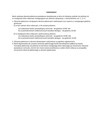 KOMUNIKAT Bank realizuje zlecenia płatnicze posiadacza niezwłocznie w dniu ich złożenia, jednak nie później niż w następnym dniu roboczym następującym po złożeniu dyspozycji, z zastrzeżeniem ust. 1, 2 i 3. 1. Zlecenia płatnicze w krajowym obrocie płatniczym realizowane są w oparciu o następujące godziny graniczne: 1) w tym samym dniu roboczym, o ile zostaną złożone: a) w placówce banku prowadzącej rachunek - do godziny 14:00 lub b) za pośrednictwem elektronicznych kanałów dostępu - do godziny 14:30; 2) w następnym dniu roboczym, jeżeli zostaną złożone: a) w placówce banku prowadzącej rachunek - po godzinie 14:00 lub b) za pośrednictwem elektronicznych kanałów dostępu - po godzinie 14:30. 2. Zlecenia płatnicze w obrocie dewizowym realizowane są zgodnie regulaminem. 3. Bank doprowadza do uznania rachunku płatniczego banku beneficjenta (odbiorcy) kwotą transakcji płatniczej nie później niż do końca następnego dnia roboczego po otrzymaniu zlecenia posiadacza rachunku; termin ten może zostać przedłużony o jeden dzień roboczy w przypadku otrzymania zlecenia płatniczego w postaci papierowej.