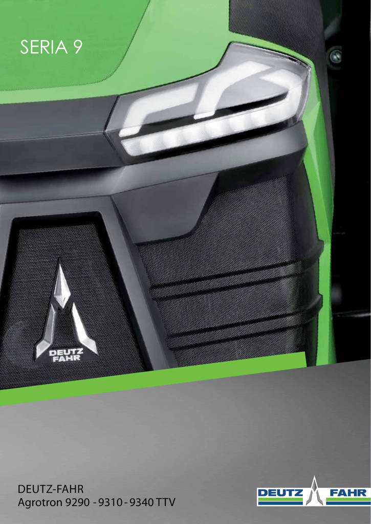 SERIA 9 DEUTZ-FAHR Agrotron 9290 - 9310 - 9340 TTV ZAPROJEKTOWANY Z MYŚLĄ O TOBIE. GWARANTUJE NAJLEPSZĄ WYDAJNOŚĆ. AGROTRON SERII 9 TTV Moc maksymalna (kW / KM) Według prognoz, do 2050 roku na świecie będzie żyło około 9 bilionów ludzi, którzy będą potrzebowali żywności i energii. Te dane mówią o ogromnych oczekiwaniach w stosunku do sektora rolniczego. Oczekiwany jest ogromny wzrost wydajności prowadzonej produkcji. Wyzwania przed jakimi staje nowoczesne rolnictwo wymagają stosowania nowej generacji ciągników rolniczych, co pozwala na osiągnięcie wymaganych wyników. Prace polowe będą prowadzone jeszcze bardziej intensywnie. Wszystkie operacje, od siewu do zbiorów muszą być zatem prowadzone z najwyższą możliwą wydajnością.Projektując nowe modele Serii 9 TTV, inżynierowie marki DEUTZ-FAHR stworzyli ultra-nowoczesny ciągnik rolniczy, wykorzystujący inteligentne systemy sterowania, wysoko-wydajny silnik gwarantujący najlepsze parametry użytkowe przy najwyższym komforcie i pełnej automatyzacji funkcji - wszystko przy zredukowanym zużyciu paliwa. Pakiet oświetlenia LED z reflektorami nowej generacji o mocy 47000 lumenów, innowacyjna kabina MaxiVision II wyposażona w nowocz- 9290 9310 9340 217 / 295 229 / 312 247 / 336 esny terminal sterowania: iMonitor 2 generacji z 12.8” monitorem z ekranem dotykowym, zaawansowany technologicznie silnik generujący moc w zakresie od 295 do 336 KM, wydajny i niezawodny układ napędu bezstopniowego TTV pozwalający na wykonywanie prac i jazdę z prędkościami od 0,2 do 60 km/h przy zredukowanych obrotach silnika, nowa oś przednia z układem amortyzacji oraz hamulcami z suchymi, zewnętrznymi tarczami, tylny podnośnik elektroniczny o udźwigu 12000 kg, przedni podnośnik elektroniczny, maska silnika otwierana elektrycznie po wciśnięciu przycisku oraz niesamowity design, opracowany wspólnie z biurem projektowym Italdesign Giugiaro - wszystko to sprawia, że nowa Seria 9 TTV to ciągnik jedyny w swoim rodzaju. Każdy z podzespołów nowej Serii 9 TTV to wysoka jakość i klasa sama w sobie. Oferta modeli Serii 9 TTV w marce DEUTZ-FAHR uzupełnia gamę produktów o ciągniki wysokiej mocy gwarantujące trwałość, niezawodność, wytrzymałość i najwyższy komfort. 04-05 ŚWIATŁA LED DOBRA WIDOCZNOŚĆ GWARANTUJE PEŁNE BEZPIECZEŃSTWO I PRECYZJĘ. NOWE ŚWIATŁA LED O MOCY 47000 LUMENÓW ZAMIENIĄ NOC W DZIEŃ. 06-07 KABINA KABINA MAXIVISION II. WEJDŹ I POCZUJ NAJWYŻSZY KOMFORT. Regulowany fotel operatora w pół-skórze z amortyzacją pneumatyczną. Komfortowy, składany fotel pasażera z pasem bezpieczeństwa. Nowoczesne materiały oraz innowacyjny design wnętrza kabiny modeli Serii 9 TTV sprawia, że czas spędzony w kabinie ciągnika to czysta przyjemność. MaxiVision II oferuje dużą przestrzeń zarówno dla operatora jak i pasażera. Panoramiczna szyba przednia oraz duże szyby drzwi zapewniają doskonałą widoczność w każdym z kierunków. Kabina wyposażona jest także w szklany szyber-dach. Nowy kształt maski silnika nie ogranicza widoczności na przestrzeń przed ciągnikiem. Układ amortyzacji pneumatycznej gwarantuje skuteczną redukcję wstrząsów. Komora silnika została w modelach Serii 9 TTV całkowicie odseparowana od kabiny, dzięki temu hałas, wibracje i temperatura nie docierają do przedziału pasażerskiego. Poziom hałasu we wnętrzu ograniczono do 69 dB. Operator ma do dyspozycji nowy panel wskaźników InfoCenter. Wszystkie informacje pokazywane są poprzez wskazania zegarów analogowych oraz informacji na wyświetlaczu ciekłokrystalicznym. Dodatkowo, operator może dostosować informacje wyświetlane na panelu centralnym zegarów w zależności do własnych potrzeb. Kabinę wyposażono w zamykane schowki - duży schowek na napoje, zamykany schowek na drobne przedmioty i dokumenty oraz uchwyt na smartfon wykonany z miękkiego tworzywa i umieszczony na słupku kabiny. Modele Serii 9 TTV oferują przedni podnośnik elektroniczny, dlatego też joystick i podłokietnik wyposażono w nowe przyciski i pokrętła sterowania. iMonitor 2 generacji stanowi doskonałe centrum sterowania wszystkimi funkcjami ciągnika, może także obsługiwać maszyny z wykorzystaniem standardu ISOBUS oraz system rolnictwa precyzyjnego AGROSKY. Panel sterowania reflektorami roboczymi na słupku kabiny. Panel sterowania układem automatycznej klimatyzacji. 08-09 STEROWANIE NAJWIĘKSZA PRĘDKOŚĆ, PRECYZJA I SKUTECZNOŚĆ W KAŻDYCH WARUNKACH. Trzy obwody hydrauliki sterowane za pomocą joysticka krzyżowego z dodatkowym przełącznikiem i przyciskami programowalnymi. Aktywacja napędu wałka (lub wałków) za pomocą przycisków na podłokietniku... Nowe modele Serii 9 TTV to maszyny zaawansowane technologicznie - także po względem łatwości sterowania. Najczęściej używane funkcje ciągnika mogą być w pełni zautomatyzowane. Co więcej, operator może tworzyć i w prosty sposób wywoływać całe profile ustawień podstawowych funkcji ciągnika. Wszystkie przyrządy sterownicze umieszczono w zasięgu ręki operatora. Dzięki temu operator może w pełni skoncentrować się na wykonywanej pracy. Przeprojektowany, przejrzysty i czytelny nowy panel wskaźników InfoCenter dostarcza wszystkie niezbędne informacje na temat parametrów pracy ciągnika. Dodatkowo, operator może dostosować informacje jakie wyświetlane są na ekranie pomiędzy zegarami do własnych potrzeb. Potencjometry do sterowania parametrów pracy podnośników. Prędkość jazdy (do przodu i do tyłu), po dwa tempomaty w obydwu kierunkach, dwa obwody układu hydraulicznego, programy Comfortip i ruch ramion podnośników: przedniego i tylnego sterowane są za pomocą nowego joysticka wielofunkcyjnego, który został zintegrowany z podłokietnikiem. Joystick i przełączniki sterowania pozostałymi sześcioma obwodami hydrauliki, pokrętło regulacji zakresu obrotów silnika i szybkości skrzyni biegów, przyciski aktyw