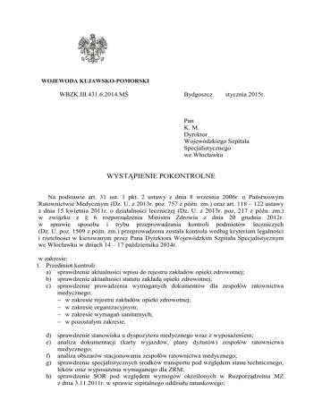 WOJEWODA KUJAWSKO-POMORSKI WBZK.III.431.6.2014.MŚ Bydgoszcz stycznia 2015r. Pan K. M. Dyrektor Wojewódzkiego Szpitala Specjalistycznego we Włocławku WYSTĄPIENIE POKONTROLNE Na podstawie art. 31 ust. 1 pkt. 2 ustawy z dnia 8 września 2006r. o Państwowym Ratownictwie Medycznym (Dz. U. z 2013r. poz. 757 z późn. zm.) oraz art. 118 – 122 ustawy z dnia 15 kwietnia 2011r. o działalności leczniczej (Dz. U. z 2013r. poz. 217 z późn. zm.) w związku z § 6 rozporządzenia Ministra Zdrowia z dnia 20 grudnia 2012r. w sprawie sposobu i trybu przeprowadzania kontroli podmiotów leczniczych (Dz. U. poz. 1509 z późn. zm.) przeprowadzona została kontrola według kryterium legalności i rzetelności w kierowanym przez Pana Dyrektora Wojewódzkim Szpitalu Specjalistycznym we Włocławku w dniach 14 – 17 października 2014r. w zakresie: 1. Przedmiot kontroli: a) sprawdzenie aktualności wpisu do rejestru zakładów opieki zdrowotnej; b) sprawdzenie aktualności statutu zakładu opieki zdrowotnej; c) sprawdzenie prowadzenia wymaganych dokumentów dla zespołów ratownictwa medycznego: − w zakresie rejestru zakładów opieki zdrowotnej; − w zakresie organizacyjnym; − w zakresie wymagań sanitarnych; − w pozostałym zakresie. d) sprawdzenie stanowiska u dyspozytora medycznego wraz z wyposażeniem; e) analiza dokumentacji (karty wyjazdów, plany dyżurów) zespołów ratownictwa medycznego; f) analiza obszarów stacjonowania zespołów ratownictwa medycznego; g) sprawdzenie specjalistycznych środków transportu pod względem stanu technicznego, leków oraz wyposażenia wymaganego dla ZRM; h) sprawdzenie SOR pod względem wymogów określonych w Rozporządzeniu MZ z dnia 3.11.2011r. w sprawie szpitalnego oddziału ratunkowego; 2. Okres objęty kontrolą: lata 2013-2014r. W wyniku przeprowadzonej kontroli kontrolowaną działalność ocenia się: pozytywnie z uchybieniami, na podstawie następujących ustaleń: W ramach systemu PRM udzielane są świadczenia zdrowotne w zakresie ratownictwa medycznego na terenie działania zespołów ratownictwa medycznego w razie wypadku, urazu, nagłego zachorowania lub nagłego pogorszenia stanu zdrowia, udzielenia bezzwłocznej pomocy medycznej w miejscu zdarzenia osobom, które uległy wypadkowi lub nagle zachorowały, a także transportu tych chorych do oddziałów ratunkowych z miejsc zdarzeń. W 2013r. zespoły ratownictwa medycznego (typu „S” i typu „P”) wyjeżdżały 21 900 razy do różnego rodzaju zdarzeń. Obszar działania obejmuje: miasto Włocławek, w którym obsługiwana liczba ludności wynosi – 115 825 mieszkańców oraz powiat włocławski z wyłączeniem gminy Lubanie, w których obsługiwana liczba ludności wynosi – 82 550 mieszkańców. Łączna ilość obsługiwanych mieszkańców – 198 375. Na 1 ZRM przypada 24 797 mieszkańców (średnia za województwo – 24 112). W omawianym okresie ZRM wykonały 21 900 interwencji do różnego rodzaju zdarzeń, co w przeliczeniu na jeden ZRM przypada 2 737 interwencji (średnia za woj. – 2 019), natomiast dziennie 7,5 interwencji (średnia za woj. – 5,53). Obszar działania obejmuje miasto Włocławek – 115 825 mieszkańców, miasta miejskogminne: Brześć Kujawski – 11 621, Lubraniec – 9 874, Chodecz – 6 248, Izbica Kujawska – 7 903, Lubień Kujawski – 7 559 i Kowal – 3 539 oraz gminy: Włocławek – 6 956, Kowal – 4 007, Choceń – 8 118, Baruchowo – 3 562, Boniewo – 3 548 oraz Fabianki – 9 615. Telefoniczne zgłoszenia na numery 112 lub 999 są automatycznie łączone z dyspozytorem medycznym we Włocławku. Dyspozytor medyczny usytuowany jest przy wejściu do części socjalnej zespołów ratownictwa medycznego, pomieszczenie o pow. 15 m2 w budynku przy ul. Lunewil 15 we Włocławku. Do dyspozycji dyspozytorów jest: szatnia, pokój śniadaniowy, dyżurka, sanitariaty, prysznic. Stanowisko dyspozytora wyposażone jest m.in. w łącze przewodowe i bezprzewodowe z zespołami ratownictwa medycznego z możliwością selektywnego wywoływania, łącza informatyczne, dostęp do sieci komputerowej wewnętrznej z dostępem do internetu, telefony komórkowe, telefon alarmowy 999 nr (054) 232-44-00, fax.- (054) 232-69-70. Dyspozytorzy medyczni zgodnie z art. 27 ust. 4 ustawy o PRM prowadzą następującą dokumentację medycznych czynności ratunkowych: dziennik pracy pogotowia ratunkowego, karta zlecenia wyjazdu pogotowia ratunkowego, księga raportów dyspozytorskich. W tym miejscu dyspozytor medyczny przejmuje kontrolę nad danym zgłoszeniem. Zespoły wyjazdowe podstawowe „P” przy podejmowaniu decyzji na miejscu zdarzenia mogą korzystać z konsultacji telefonicznej z lekarzem zespołu specjalistycznego „S”. Obszar działania obsługuje 8 zespołów ratownictwa medycznego, w tym: 4 – zespoły specjalistyczne „S” oraz 4 zespoły podstawowe „P”. W roku 2013 ZRM podległe pod Wojewódzki Szpital Specjalistyczny we Włocławku wyjeżdżały do 21 900 wezwań, w których występowało zagrożenie życia, co w porównaniu do 2012 roku, ilość wyjazdów zmniejszyła się o 2,9% , tj. z 22 553 w 2012r. do 21 900 w 2013r. (o 653 wyjazdy mniej). W miastach powyżej 10 tys. mieszkańców odnotowano 15 611 interwencji, mniej o 326, tj. o 2,05% niż w 2012r. (w 2012r. - 15 937), natomiast poza miastami powyżej 10 tys. mieszkańców odnotowano 6 289 interwencji, mniej o 327 tj. o 4,94% (w 2012r. – 6 616). Zespoły ratownictwa medycznego w miastach powyżej 10 tys. mieszkańców do 14 699 zdarzeń wyjeżdżały w czasie krótszym niż 15 minut, mniej o 517 (3,4%) niż w 2012r. – 15 216, natomiast poza miastami powyżej 10 tys. mieszkańców do 5 888 zdarzeń wyjeżdżały w czasie krótszym niż 20 minut, mniej o 367 (5,87%) niż w 2012r. – 6 255. W roku 2013r. o 231 zwiększyła się ilość wyjazdów do zdarzeń w przedziale 16-25 i więcej minut, tj. o 21,35%, w porównaniu do roku 2012 (z 1 082 w 2012r. do 1313 w 2013r.). Wskaźnik 