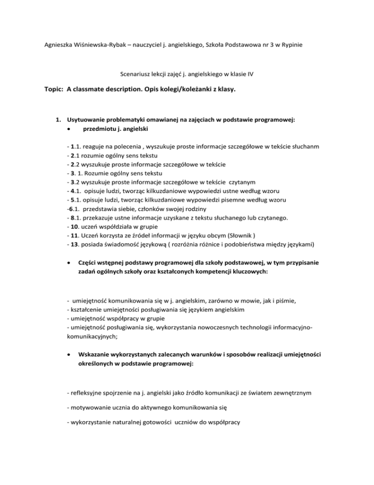 Agnieszka Wiśniewska-Rybak – nauczyciel j. angielskiego, Szkoła Podstawowa nr 3 w Rypinie Scenariusz lekcji zajęć j. angielskiego w klasie IV Topic: A classmate description. Opis kolegi/koleżanki z klasy. 1. Usytuowanie problematyki omawianej na zajęciach w podstawie programowej: przedmiotu j. angielski - 1.1. reaguje na polecenia , wyszukuje proste informacje szczegółowe w tekście słuchanm - 2.1 rozumie ogólny sens tekstu - 2.2 wyszukuje proste informacje szczegółowe w tekście - 3. 1. Rozumie ogólny sens tekstu - 3.2 wyszukuje proste informacje szczegółowe w tekście czytanym - 4.1. opisuje ludzi, tworząc kilkuzdaniowe wypowiedzi ustne według wzoru - 5.1. opisuje ludzi, tworząc kilkuzdaniowe wypowiedzi pisemne według wzoru -6.1. przedstawia siebie, członków swojej rodziny - 8.1. przekazuje ustne informacje uzyskane z tekstu słuchanego lub czytanego. - 10. uczeń współdziała w grupie - 11. Uczeń korzysta ze źródeł informacji w języku obcym (Słownik ) - 13. posiada świadomość językową ( rozróżnia różnice i podobieństwa między językami) Części wstępnej podstawy programowej dla szkoły podstawowej, w tym przypisanie zadań ogólnych szkoły oraz kształconych kompetencji kluczowych: - umiejętność komunikowania się w j. angielskim, zarówno w mowie, jak i piśmie, - kształcenie umiejętności posługiwania się językiem angielskim - umiejętność współpracy w grupie - umiejętność posługiwania się, wykorzystania nowoczesnych technologii informacyjnokomunikacyjnych; Wskazanie wykorzystanych zalecanych warunków i sposobów realizacji umiejętności określonych w podstawie programowej: - refleksyjne spojrzenie na j. angielski jako źródło komunikacji ze światem zewnętrznym - motywowanie ucznia do aktywnego komunikowania się - wykorzystanie naturalnej gotowości uczniów do współpracy 2. uzasadnienie celowości realizacji tematu: Opis postaci - przedstawienie kolegi/koleżanki w sposób szczegółowy, zawierający opis wyglądu zewnętrznego, charakteru, sposobu bycia itd. z za pomocą poznanych przymiotników; 3. Powiązanie z wcześniejszą wiedzą, doświadczeniami / lub umiejętnościami uczniów oraz z zagadnieniami poruszanymi na innych przedmiotach, zajęciach: Uczniowie znają już 12 podstawowych przymiotników opisujących ludzi, Znają odmiany podstawowych czasowników „być”, „mieć” Umieją użyć konstrukcji przymiotnik + rzeczownik Znają pytania na które odpowiada rzeczownik i przymiotnik (j. polski) Znają podstawowe słowa opisujące wygląd zewnętrzny Znają i stosują podstawowe zasady poprawności tekstów pisanych w j. angielskim 4. Cel zajęć dla nauczyciela. Uczeń: Zna przymiotniki opisujące ludzi Posługuje się odmianą podstawowych czasowników /być/ mieć/ Zapisuje poprawnie strukturę przymiotnik= rzeczownik Znajduje błędy zapisane w przykładowych zdaniach Wskazuje opisane sposoby na ilustracji Umie w 6 zdaniach opisać kolegę/ koleżankę 5. Cel lekcji w języku zrozumiałym dla ucznia: Na dzisiejszej lekcji , pracując indywidualnie i grupie opiszesz swojego kolegę/ koleżankę, by doskonalić umiejętność dostrzegania szczegółów wyglądu postaci. 6. Kryteria osiągania celów/ wymagania Lp Elementy opisu postaci podlegające ocenie punktacja 1. Realizacja tematu: zawarcie wszystkich niezbędnych informacji, to znaczy: Gilr/boy Height Hair Eyes Good AT personality - za każdy element ( 6-) 2. 3. Poprawna odmiana czasownika być/ mieć Użycie poprawnej konstrukcji przymiotnik +rzeczownik Fonetyka, ( przestrzeganie poprawności wymowy fonetycznej, dopuszczalne 2 błędy fonetyczne) (1- ) (1 - ) 4. Uzyskane punkty ( 1- ) Razem punkty: 9 - 7. 8. 9. 10. Propozycja pytania kluczowego: Dlaczego każdy z nas jest inny? Formy pracy : indywidualna, grupowa Metody pracy : tekst, wzór, obrazki, praktyczna - opis kolegi/ koleżanki środki dydaktyczne: prezentacja tablica, wzór opisu postaci, szare arkusze papieru, karta pracy dla uczniów z zestawem kryteriów oceny opisu postaci oraz zadaniem do wykonania, naklejki, numery grup i numery losów 7. Bibliografia: - Sylvia Wheeldon , ,Workbook’. Podręcznik do języka angielskiego dla klasy 4, wyd. OXFORD - Sylwia Wheeldon, Paul Shipton, Materiały ćwiczeniowe z jęz. angielskiego dla klasy 4, Wyd., OXFORD - WWW. Szlifuj swój angielski.pl Przebieg lekcji: 1. Powitanie uczniów, oraz gości 2. Wprowadzenie/ zapis daty i tematu zajęć 3. Powtórzenie odmiany czasowników być/ mieć, poznanych przymiotników oraz konstrukcji przymiotnik + rzeczownik 4. Pokazanie celu dla ucznia, zbadanie zrozumienia celu przez uczniów 5. Zadanie pytania kluczowego: Dlaczego każdy z nas jest inny?- ustalenie odpowiedzi ( burza mózgów 6. Pokazanie obrazka, wysłuchanie nagrania, wskazanie opisanych osób 7. Prezentacja zdań z błędami- wyszukiwanie nieprawidłowości zapisanych zdań 8. Otrzymacie przykładowego tekstu opisu osoby – uzupełnianie tabeli informacyjnej dotycz. Opisywanej postaci 9. Ustalenie z uczniami kryteriów oceny opisu postaci ( kary pracy i wypisane na szarym dużym papierze) ustalenie punktacji 10. Dobranie się w grupy, ustalenie osoby odpowiedzialnej za grupę( Lidera) 11. Losowanie grup przeciwnych , wspólne ustalenie opisywanej osoby 12. Praca w grupach- opisywanie kolegi/ koleżanki 13. Prezentowanie opisu, 14. Znajdowanie osoby opisującej, przydzielanie punktów przez grupy przeciwne 15. Podsumowanie lekcji. Wykorzystanie techniki niedokończonego zdania: Na dzisiejszej lekcji………………………………………………………………………………………. 16. Zadanie i omówienie pracy domowej – opis osoby z rodziny, mamy, taty, siostry, brata – do wyboru 17. Podziękowanie za pracę i udział w lekcji, zakończenie zajęć.