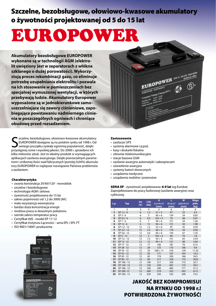 Szczelne, bezobsługowe, ołowiowo-kwasowe akumulatory o żywotności projektowanej od 5 do 15 lat Akumulatory bezobsługowe EUROPOWER wykonane są w technologii AGM (elektrolit uwięziony jest w separatorach z włókna szklanego o dużej porowatości). Wykorzystują proces rekombinacji gazu, co eliminuje potrzebę uzupełniania elektrolitu i pozwala na ich stosowanie w pomieszczeniach bez specjalnej wymuszonej wentylacji, w których przebywają ludzie. Akumulatory Europower wyposażone są w jednokierunkowe samouszczelniające się zawory ciśnieniowe, zapobiegające powstawaniu nadmiernego ciśnienia w poszczególnych ogniwach i chroniące obudowę przed rozsadzeniem. S zczelne, bezobsługowe, ołowiowo-kwasowe akumulatory EUROPOWER dostępne są na polskim rynku od 1998 r. Od samego początku zyskały ogromną popularność, dzięki przystępnej cenie i wysokiej jakości. Do 2008 r. sprzedano ich kilka milionów sztuk. Jest to idealny produkt w wymagających aplikacjach zasilania awaryjnego. Dzięki powtarzalnym parametrom i znikomej ilości wad fabrycznych (poniżej 0,04%) akumulatory EUROPOWER to najlepsze rozwiązanie Państwa problemów z zasilaniem. Charakterystyka • zwarta konstrukcja 2V/6V/12V - monoblok • szczelne i bezobsługowe • technologia AGM i żelowa • żywotność projektowana do 15 lat • zakres pojemności od 1,2 do 3000 [Ah] • mała rezystancja wewnętrzna • bardzo duża koncentracja energii • możliwa praca w dowolnym położeniu • szeroki zakres temperatur pracy • Certyfikat VdS - model EP 17-12 • Certyfikat Instytutu Łączności - seria EPL i EPL FT • ISO 9001/14001 producenta Zastosowania • zasilacze UPS • systemy alarmowe i p.poż. • kasy i drukarki fiskalne • siłownie telekomunikacyjne • stacje bazowe GSM • zasilanie awaryjne automatyki i zabezpieczeń • oświetlenie awaryjne • systemy baterii słonecznych • urządzenia medyczne • urządzenia mobilne i przenośne SERIA EP - żywotność projektowana: 6-9 lat wg Eurobat. Zaprojektowane do pracy buforowej (zasilanie awaryjne) oraz cyklicznej. L.p. Typ Un [V] C20 [Ah] 1 1 2 3 4 5 6 7 8 9 10 11 12 13 14 15 16 17 18 19 20 21 22 2 EP 1,2 - 6 EP 3 - 6 EP 4,5 - 6 EP 7 - 6 EP 12 - 6 EP 1,2 - 12 EP 2,3 - 12 EP 3,6 - 12 EP 5 - 12 EP 7,2 - 12 EP 12 - 12 EP 17 - 12 EP 28 - 12 EP 33 - 12 EP 42 - 12 EP 65 - 12 EP 90 - 12 EP 100 - 12 EP 120 - 12 EP 160 - 12 EP 200 -12 EP 230 - 12 3 6 6 6 6 6 12 12 12 12 12 12 12 12 12 12 12 12 12 12 12 12 12 4 1.2 3 4.5 7 12 1.2 2.3 3.6 5 7.2 12 17 28 33 42 65 90 100 120 160 200 230 H wysokość [mm] 5 51 + 5 60 + 6 102 + 5 94 + 6 94 + 6 53 + 6 60 + 5 60 + 6 102 + 4 93 + 5 94 + 4 166 125 168 + 11 171 174 217 217 239 240 219 220 L długość [mm] 6 97 134 70 151 151 97 178 134 90 151 151 181 175 210 197 350 329 329 407 483 522 522 W głębokość [mm] 7 25 34 48 34 50 45 34 67 70 65 98 76 166 129 165 166 172 172 173 171 202 240 Waga jedn. [kg] 8 0.3 0.65 0.91 1.26 1.98 0.59 0.94 1.35 1.8 2.54 3.94 6.15 9.6 11.25 14.3 24.5 30.8 32.7 39.5 51.2 61.5 72.5 JAKOŚĆ BEZ KOMPROMISU! NA RYNKU OD 1998 r.! POTWIERDZONA ŻYWOTNOŚĆ! SERIA EV - żywotność projektowana: 6-9 lat wg Eurobat. Przeznaczone do pracy w zasilaczach UPS. Przy standardowych gabarytach serii EP charakteryzują się znacznie mniejszą rezystancją wewnętrzną, dzięki czemu mają większą pojemność i bardzo dobre charakterystyki rozładowania stałą mocą i dużym prądem. L.p. 1 1 2 3 4 5 6 7 Typ 2 EV 6 - 12 EV 9 - 12 EV 15 - 12 EV 22 - 12 EV 33 - 12 EV 50 - 12 EV 75 - 12 Un [V] C10 [Ah] 3 12 12 12 12 12 12 12 4 5.5 8 13 20 31 48 73 H wysokość [mm] 5 94 + 6 94 + 6 94 + 4 166 125 171 174 L długość [mm] 6 151 151 151 181 175 197 350 W głębokość [mm] 7 51 65 98 76 166 165 166 Waga jedn. [kg] 8 2.1 2.75 4.2 6.5 10 15.3 24.75 SERIA EPL FTN (FRONT TERMINAL) – żywotność projektowana: ponad 12 lat wg Eurobat. Zaprojektowane do instalacji w szafach 19” i 23”. Dzięki czołowo wyprowadzonym końcówkom biegunowym są łatwe w montażu i obsłudze. Wyposażone w System Centralnego Odgazowania, są idealne jako rezerwowe źródło zasilania w siłowniach telekomunikacyjnych (48VDC). L.p. Typ Un [V] C10 [Ah] 1 1 2 3 4 5 6 2 EPL 26 - 12FTN EPL 50 - 12FTN EPL 85 - 12FTN EPL 100 - 12FTN EPL 125 - 12FTN EPL 155 - 12FTN 3 12 12 12 12 12 12 4 26 50 85 100 125 155 H wysokość [mm] 5 146.5 200 270 287 270 270 L długość [mm] 6 350 390 390 390 558 558 W głębokość [mm] 7 97 105 105 105 125 125 Waga jedn. [kg] 8 9.3 21 31 33.5 45 52.5 Akumulatory EPL FTN dostępne są także w technologii żelowej (EPL FTNG). SERIA EPL - żywotność projektowana: ponad 12 lat wg Eurobat. Zaprojektowane do pracy buforowej (zasilanie awaryjne) w aplikacjach wymagających bardzo długiej żywotności. L.p. 1 1 2 3 4 5 6 7 8 9 10 Typ 2 EPL 7,2 - 12 EPL 12 - 12 EPL 17 - 12 EPL 28 - 12 EPL 42 - 12 EPL 65 - 12 EPL 85 - 12 EPL 110 - 12 EPL 150 - 12 EPL 210 - 12 Un [V] C20 [Ah] 3 12 12 12 12 12 12 12 12 12 12 4 7.2 12 17 28 42 65 85 110 150 210 H wysokość [mm] 5 93 + 5 94 + 4 166 125 171 174 217 239 240 220 L długość [mm] 6 151 151 181 175 197 350 329 407 483 522 W głębokość [mm] 7 65 98 76 166 165 166 172 173 171 240 Waga jedn. [kg] 8 2.6 4.1 6.15 9.7 14.6 25 31.2 40 51.8 73.2 SERIA UPS - żywotność projektowana: 10-12 lat wg Eurobat. Przeznaczone do pracy buforowej (zasilanie awaryjne). Są to odpowiedniki akumulatorów DYNASTY (dawny Johnson Controls). Przy takich samych gabarytach mają większą pojemność oraz lepsze charakterystyki rozładowania stałą mocą i stałym prądem. L.p. 1 1 2 3 4 Typ 2 UPS 12 - 55 UPS 12 - 80 UPS 12 - 90 UPS 12 - 110 Un [V] C10 [Ah] 3 12 12 12 12 4 53 78 88 108 H wysokość [mm] 5 215 215 215 227 L długość [mm] 6 228 260 305 330 W głębokość [mm] 7 139 173 173 173 Waga jedn. [kg] 8 17.8 26 29.8 34.8 SERIA EXL - żywotność projektowana: 15 lat. Ogniwa o napięciu 2[V] i dużych pojemnościach, zaprojektowane z myślą o systemach wymagających wysok