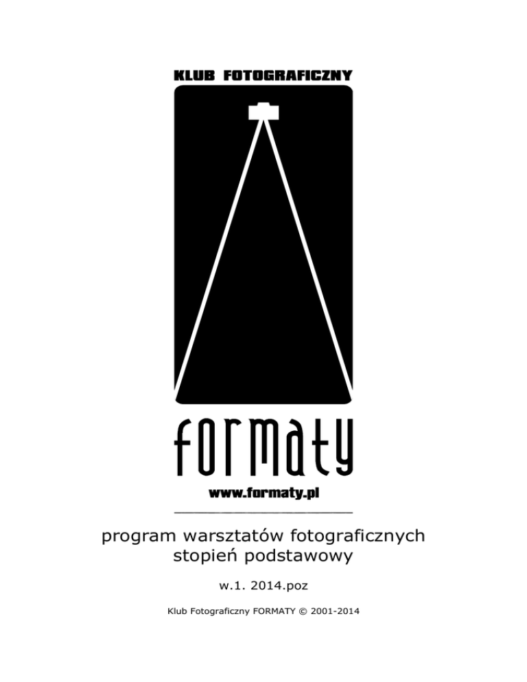 program warsztatów fotograficznych stopień podstawowy w.1. 2014.poz Klub Fotograficzny FORMATY © 2001-2014 ZAJĘCIA PIERWSZE Podstawy fotografii w praktyce cz. I • rodzaje i typy aparatów fotograficznych • matryca w aparacie cyfrowym jako materiał światłoczuły • rodzaje obiektywów • ochrona i czyszczenie obiektywów Zajęcia praktyczne z oświetleniem studyjnym • obsługa lamp studyjnych • oświetlenie twarzy wykorzystując różne właściwości światła ZAJĘCIA DRUGIE Podstawy fotografii cz. II • parametry ekspozycji: czas, przysłona, ISO • tryby pracy aparatów fotograficznych (P, Av (A), Tv (S), M) • głębia ostrości i jej zastosowanie • rodzaje pomiarów światła w aparatach fotograficznych • barwoczułość, „balans bieli” • obsługa sprzętu studyjnego Praktyczne zastosowanie trybów pracy aparatu • ćwiczenia w studio: wykorzystanie trybów Av, Tv, M w praktyce • (temat samodzielny – „Bliska osoba”) ZAJĘCIA TRZECIE Wstęp do kompozycji obrazu fotograficznego • „złoty podział” • „mocne” punkty obrazu • rodzaje kompozycji i ich zastosowanie • kontrast barwny Portret charakterystyczny • zastosowanie technik specjalnych low-key, high-key • (temat samodzielny – „Linia prosta”) • zastosowanie pędzla świetlnego ZAJĘCIA CZWARTE Fotografia architektury • wstęp do fotografii architektury • sposoby korygowania perspektywy • projekcja slajdów Fotografia nocna • fotografia nocna – zagadnienia techniczne • sprzęt niezbędny przy fotografowaniu na długich czasach ZAJĘCIA PIĄTE Sesja plenerowa „miasto nocą” Fotografia pejzażowa • zagadnienia techniczne • pejzaż fotograficzny jako zjawisko estetyczne – prezentacja multimedialna • długie czasy naświetlania – malowanie światłem - ćwiczenie Sesja plenerowa „Pejzaż” - osobny plener wyjazdowy ZAJĘCIA SZÓSTE Idee i założenia fotoreportażu • fotoreportaż jako zjawisko estetyczne • techniczne aspekty fotografii reporterskiej • prawo prasowe, prawa autorskie i prawa pokrewne • (temat samodzielny - „Dookoła mnie”) Magia fotografii analogowej • podstawowe ciemniowe procesy fotograficzne • wywoływanie negatywów czarno-białych • obróbka materiału negatywowego – pokaz ZAJĘCIA SIÓDME Makrofotografia – małe jest piękne • zagadnienia techniczne • potrzebne akcesoria: soczewki, pierścienie, obiektywy makro • ćwiczenia w studio • (temat samodzielny – „Blisko, jak najbliżej”) „Ciemnia” - niesamowita wędrówka w nieznane • obsługa powiększalnika fotograficznego • proces pozytywowy • rodzaje papierów fotograficznych • praca w ciemni – luksografia jako pierwszy obraz • wykonanie prawidłowej odbitki fotograficznej • zmiany kontrastowości, „maskowanie” odbitek ZAJĘCIA ÓSME Filtry fotograficzne – tajemnica ukryta w szkiełkach • rodzaje filtrów fotograficznych i ich zastosowanie • filtry UV, połówkowe, szare neutralne, polaryzacyjne, efektowe • zasady mieszania barwnych świateł Sesja fotograficzna • praca w studio z zastosowaniem filtrów oświetleniowych • (temat samodzielny - „Kolorowy świat”) ZAJĘCIA DZIEWIĄTE Programy graficzne • rodzaje zapisu obrazu cyfrowego – JPEG, TIFF • RAW – cyfrowy negatyw i inne formy zapisu plików fotograficznych • podstawy obróbki fotografii w programach graficznych • tworzenie panoram i montaż zdjęć ZAJĘCIA DZIESIĄTE Fotografia reklamowa - „Moda” • przygotowanie do sesji fotograficznej z modelką Fotografia katalogowa przedmiotów • podstawowe sposoby oświetlania różnorakich powierzchni przedmiotów – ćwiczenie • fotografia przedmiotów ze szkła i metalu ZAJĘCIA JEDENASTE Sesja fotograficzna „Moda” • sesja fotograficzna z udziałem wizażysty i modelek ZAJĘCIA DWUNASTE Praktyczne zastosowanie lampy błyskowej • wypełnianie flashem czyli praktyczne wykorzystanie lampy błyskowej • funkcje lampy błyskowej – TTL, multi, manual • wpływ zmiany kąta głowicy lampy błyskowej na fotografowany obraz Podsumowanie zajęć oraz prezentacja i ocena prac uczestników Przygotowanie prac do wystawy Klub Fotograficzny FORMATY © 2001-2014