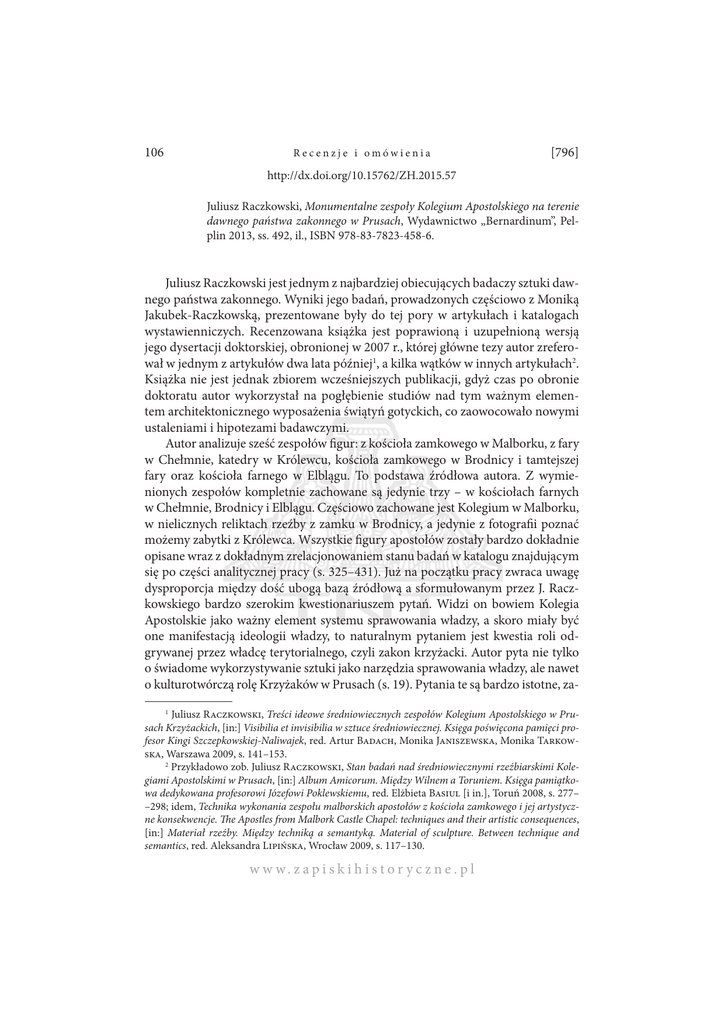 106 Recenzje i omówienia [796] http://dx.doi.org/10.15762/ZH.2015.57 Juliusz Raczkowski, Monumentalne zespoły Kolegium Apostolskiego na terenie dawnego państwa zakonnego w Prusach, Wydawnictwo „Bernardinum”, Pelplin 2013, ss. 492, il., ISBN 978-83-7823-458-6. Juliusz Raczkowski jest jednym z najbardziej obiecujących badaczy sztuki dawnego państwa zakonnego. Wyniki jego badań, prowadzonych częściowo z Moniką Jakubek-Raczkowską, prezentowane były do tej pory w artykułach i katalogach wystawienniczych. Recenzowana książka jest poprawioną i uzupełnioną wersją jego dysertacji doktorskiej, obronionej w 2007 r., której główne tezy autor zreferował w jednym z artykułów dwa lata później1, a kilka wątków w innych artykułach2. Książka nie jest jednak zbiorem wcześniejszych publikacji, gdyż czas po obronie doktoratu autor wykorzystał na pogłębienie studiów nad tym ważnym elementem architektonicznego wyposażenia świątyń gotyckich, co zaowocowało nowymi ustaleniami i hipotezami badawczymi. Autor analizuje sześć zespołów figur: z kościoła zamkowego w Malborku, z fary w Chełmnie, katedry w Królewcu, kościoła zamkowego w Brodnicy i tamtejszej fary oraz kościoła farnego w Elblągu. To podstawa źródłowa autora. Z wymienionych zespołów kompletnie zachowane są jedynie trzy – w kościołach farnych w Chełmnie, Brodnicy i Elblągu. Częściowo zachowane jest Kolegium w Malborku, w nielicznych reliktach rzeźby z zamku w Brodnicy, a jedynie z fotografii poznać możemy zabytki z Królewca. Wszystkie figury apostołów zostały bardzo dokładnie opisane wraz z dokładnym zrelacjonowaniem stanu badań w katalogu znajdującym się po części analitycznej pracy (s. 325–431). Już na początku pracy zwraca uwagę dysproporcja między dość ubogą bazą źródłową a sformułowanym przez J. Raczkowskiego bardzo szerokim kwestionariuszem pytań. Widzi on bowiem Kolegia Apostolskie jako ważny element systemu sprawowania władzy, a skoro miały być one manifestacją ideologii władzy, to naturalnym pytaniem jest kwestia roli odgrywanej przez władcę terytorialnego, czyli zakon krzyżacki. Autor pyta nie tylko o świadome wykorzystywanie sztuki jako narzędzia sprawowania władzy, ale nawet o kulturotwórczą rolę Krzyżaków w Prusach (s. 19). Pytania te są bardzo istotne, zaJuliusz Raczkowski, Treści ideowe średniowiecznych zespołów Kolegium Apostolskiego w Prusach Krzyżackich, [in:] Visibilia et invisibilia w sztuce średniowiecznej. Księga poświęcona pamięci profesor Kingi Szczepkowskiej-Naliwajek, red. Artur Badach, Monika Janiszewska, Monika Tarkowska, Warszawa 2009, s. 141–153. 2 Przykładowo zob. Juliusz Raczkowski, Stan badań nad średniowiecznymi rzeźbiarskimi Kolegiami Apostolskimi w Prusach, [in:] Album Amicorum. Między Wilnem a Toruniem. Księga pamiątkowa dedykowana profesorowi Józefowi Poklewskiemu, red. Elżbieta Basiul [i in.], Toruń 2008, s. 277– –298; idem, Technika wykonania zespołu malborskich apostołów z kościoła zamkowego i jej artystyczne konsekwencje. The Apostles from Malbork Castle Chapel: techniques and their artistic consequences, [in:] Materiał rzeźby. Między techniką a semantyką. Material of sculpture. Between technique and semantics, red. Aleksandra Lipińska, Wrocław 2009, s. 117–130. 1 w w w. z a p i s k i h i s t o r y c z n e . p l [797] Recenzje i omówienia 107 rysowują bowiem od razu kontekst powstania tych zabytków i ich funkcjonowania w świadomości członków Zakonu. J. Raczkowski jest przekonany, że „badania nad monumentalnymi Kolegiami idą więc w parze z badaniami nad całymi średniowiecznymi dziejami Prus i wraz z nimi wiodą ku kwestii kształtowania się własnej tożsamości i etosu Zakonu – jako korporacji duchowej, ale także (a może przede wszystkim) jako terytorialnego zwierzchnika” (s. 19). Omawiana praca, ze względu na swój ograniczony zakres tematyczny, nie mogła rozstrzygnąć tak zasadniczych problemów, ale na pewno dodała do dyskusji nowych argumentów. Zdaniem autora najwcześniejszym i najważniejszym Kolegium w Prusach było to znajdujące się w kościele zamkowym w Malborku. Genezy całego dwupoziomowego układu świątyni autor, idąc za Szczęsnym Skibińskim3, upatruje w paryskiej Sainte-Chapelle i wiąże z osobą wielkiego mistrza Luthera, księcia brunszwickiego. Odrzuca sugerowane przez Mariana Arszyńskiego czeskie pośrednictwo w transferze idei do Prus4. Na malborskie nawiązanie do paryskiej kaplicy należy, jego zdaniem, spojrzeć jako na wzorzec „nie tyle dla pałacowego oratorium, ile dla kościoła państwowego, którym kościół mariacki – serce rezydencji malborskiej – stał się od momentu przeniesienia tu siedziby wielkich mistrzów w 1309 roku” (s. 107). Zdanie to jest prawidłowe i ugruntowane w literaturze przedmiotu, ale korekty wymagają tu data i zastosowany czas przeszły dokonany. Dotychczasowe badania pokazują bowiem, że mimo wysiłków władz Zakonu w drugiej połowie XIV i pierwszej połowie XV w. kościół zamkowy nie stał się centralnym kościołem dla Zakonu czy choćby w państwie zakonnym w Prusach. Przytoczyć tu można choćby wspominaną przez autora w innym miejscu kwestię malborskiego skarbca relikwiarzowego, który był raczej skromny i pozbawiony jedności ideowej. Krzyżakom bardzo zależało, aby Malbork stał się żywym ośrodkiem pielgrzymkowym. Uczynienie z kościoła malborskiego duchowego centrum Zakonu było najprawdopodobniej koncepcją Luthera z Brunszwiku, a może i jego poprzednika Wernera von Orselna (zginął 18 XI 1330 r.). Mogło to się dokonać dopiero w momencie, kiedy Malbork zaczął rzeczywiście spełniać funkcję stołeczną, więc najszybciej po 1324 r., czyli elekcji wielkiego mistrza Wernera. Jedną z konsekwencji przyjęcia tej koncepcji jest dyskutowana szeroko i wspomniana także przez autora kwestia późniejszego datowania prowadzącej do ko