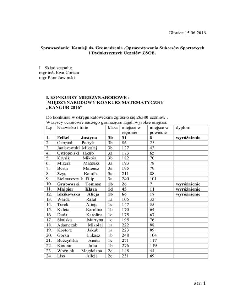 Gliwice 15.06.2016 Sprawozdanie Komisji ds. Gromadzenia ,Opracowywania Sukcesów Sportowych i Dydaktycznych Uczniów ZSOE. I. Skład zespołu: mgr inż. Ewa Cimała mgr Piotr Jaworski I. KONKURSY MIĘDZYNARODOWE : MIĘDZYNARODOWY KONKURS MATEMATYCZNY „KANGUR 2016” Do konkursu w okręgu katowickim zgłosiło się 26380 uczniów . Wszyscy uczniowie naszego gimnazjum zajęli wysokie miejsca: L.p Nazwisko i imię klasa miejsce w miejsce w regionie powiecie 1. Felkel Justyna 3b 31 8 2. Cierpiał Patryk 3b 86 25 3. Janiszewski Mikołaj 3b 127 43 4. Ostropolski Jakub 3a 173 65 5. Krysik Mikołaj 3b 182 70 6. Mizera Mateusz 3a 193 78 7. Borth Mateusz 3a 195 79 8. Szyc Kamila 3e 211 88 9. Stelmaszczuk Filip 3a 240 101 10. Grabowski Tomasz 1b 26 7 11. Majgier Klara 1d 45 11 12. Idzikowska Alicja 1b 66 17 13. Warda Rafał 1a 105 33 14. Turek Alicja 1c 147 55 15. Kaleta Karolina 1b 170 64 16. Duda Karolina 1c 175 67 17. Skalska Martyna 1c 195 76 18. Adamczak Mikołaj 1a 222 88 19. Kostorz Jakub 1a 223 89 20. Gorka Łukasz 1b 248 104 21. Buczyńska Aneta 1c 271 117 22. Kindrat Julia 1b 276 119 23. Woźniak Magdalena 2d 148 44 24. Liss Alicja 2c 231 69 dyplom wyróżnienie wyróżnienie wyróżnienie wyróżnienie str. 1 II. KONKURSY OGÓLNOPOLSKIE Polsko- Ukraiński Konkurs Fizyczny „Lwiątko” Felkel Justyna (3b) Cierpiał Patryk(3b) Szyc Kamila (3e) Ogólnopolski Konkurs Chemiczny „Albus” L.p Nazwisko i imię klasa miejsce 1. Duda Karolina 1c 6 2. Skalska Martyna 1c 8 3. Chludzińska Katarzyna 1c 14 4. Pęczek Dominika 1c 15 5. Turek Alicja 1c 19 6. Wawszczak Alicja 1c 21 Ogólnopolska Olimpiada OLIMPUS Kozubowska Hanna –dyplom laureata miejsce 9 III. KONKURSY MIĘDZYSZKOLNE Konkurs Powiatowy ”Młody Einstein” / IV miejsce/ Cierpiał Patryk(3b) Krysik Mikołaj(3b) Miejski Konkurs „Eureka” Cierpiał Patryk (3b) – III miejsce XXII Konkurs Chemiczny o puchar Dyrektora GCE Cierpiał Patryk (3b) – II miejsce Liga Matematyczno-Przyrodnicza -II etap IV. Felkel Justyna (3b) Cierpiał Patryk(3b) Janiszewski Mikołaj(3b) SUKCESY SPORTOWE Lekkoatletyka Zawody szkolne Rejonowe Drużynowe Zawody Lekkoatletyczne - 1 m-ce zespół chłopców, 2 m-ce zespół dziewcząt Wojewódzkie Drużynowe Zawody Lekkoatletyczne 1m-ce chłopcy po raz pierwszy w historii miasta i szkoły str. 2 Zawody klubowe Halowe Mistrzostwa Śląska WeronikaMisińska1 m-ce w chodzie na 2 km Wiktoria Sobór 2 m-ce w skoku w dal Jakub Ostropolski3 m-ce na 1000 m Dawid Mysiuk5 m-ce na 600 m Przełajowe Mistrzostwa Śląska- Dawid Mysiuk 1 m-ce, Jakub Kucharczyk 7 m-ce Międzywojewódzkie Mistrzostwa Młodzików w Biegach Przełajowych- 3 m-ce Dawid Mysiuk, 5 m-ce Jakub Kucharski Mistrzostwa Śląska Juniorów Złoty medal : sztafeta 4 x 400 m/ Pachole, Ostropolski, Mizera, Przeradzki/ Srebrny medal : Jakub Ostropolski na 400 m Mistrzostwa Śląska Młodzików Złoty medal Weronika Misińska chód na 3 km Srebrny medal Dawid Mysiuk na 600 m 4 m-ce Wiktoria Sobór na 100 m i w skoku w dal 4 m-ce Kamil Sabliński w pchnięciu kulą Opiekunowie i trenerzy lekkoatletów : Mirosława Matusz i Adam Śniegórski. Koszykówka Zawody szkolne: V m-ce Gimnazjalna Liga koszykówki dziewcząt Mistrzostwo Gliwic w koszykówce chłopców Zawody klubowe: VI mce w wojewódzkiej lidze młodzików- klasa 1A III mce w międzynarodowym turnieju w Żyrardowie- klasa 1A II mce na turnieju między wojewódzkim kadetów w Rawiczu- Salachna Tymon 3D, Sabliński Kamil 2A Siatkówka II miejsce w Mistrzostwach Gliwic w siatkówce plażowej dziewcząt; III miejsce w Mistrzostwach Gliwic w siatkówce dziewcząt; II miejsce w Mistrzostwach Gliwic w siatkówce plażowej chłopców III miejsce w Mistrzostwach Gliwic w siatkówce dziewcząt; str. 3 Piłka nożna I m-ce w Mistrzostwach Gliwic w halowej piłce nożnej dziewcząt. Zwycięski zespół grał w składzie: Kasia Szklarkowska-kapitan, Szuwalska Julia, Klepacz Magda, Łaba Anita, Pieprzyk Martyna, Bartoń Natalia, Halinowska Anna, Misińska Weronika. Opiekunem zespołu był Adam Śniegórski. Biegi na orientację II miejsce w zawodach powiatowych Wojewódzkiej Gimnazjady Młodzieży Szkolnej orientacji sportowej chłopców II miejsce Jakub Kucharczyk w zawodach powiatowych Wojewódzkiej Gimnazjady Młodzieży Szkolnej II miejsce Martyna Pieprzyk w Gliwickiej Młodzieżowej Lidze Biegu na Orientację II miejsce Jakub Kucharczyk w Gliwickiej Młodzieżowej Lidze biegu na Orientację Pływanie Kapias Michał - V miejsce Zimowych Mistrzostw Polski Juniorów 16 letnich w Pływaniu na 100m zmiennym Marzec 2016 Mistrz Śląska Juniorów 16-18 letnich na 50m stylem grzbietowym. Kała Mikołaj -VII miejsce Zimowych Mistrzostw Polski Juniorów 16 letnich w Pływaniu na dystansie 200m stylem klasycznym Marzec 2016. II miejsce indywidualnie w finale Wojewódzkim igrzysk Młodzieży szkolnej na dystansie 100m stylem klasycznym Stradomski Patryk –XVI miejsce Zimowych Mistrzostw Polski Juniorów 16 letnich w Pływaniu na dystansie 200m stylem klasycznym Marzec 2016. I miejsce indywidualnie w finale Wojewódzkim igrzysk Młodzieży szkolnej na dystansie 50m stylem grzbietowym Kokot Angelika-XVII miejsce Zimowych Mistrzostw Polski Juniorów 16 letnich w Pływaniu na dystansie 200m stylem grzbietowym Marzec 2016. II miejsce indywidualnie w finale Wojewódzkim igrzysk Młodzieży szkolnej na dystansie 50m stylem grzbietowym Sugier Sonia-III miejsce indywidualnie w finale Wojewódzkim igrzysk Młodzieży szkolnej na dystansie 50m stylem dowolnym Mikołaj Janiszewski-XXII miejsce Zimowych Mistrzostw Polski Juniorów 16 letnich w Pływaniu na dystansie 100m stylem klasycznym Marzec 2016 III miejsce indywidualnie w finale Wojewódzkim Igrzysk Młodzieży Szkolnej na dystansie 50m stylem klasycznym Kossakowska Dominika-VIII miejsce Głównych Mistrzostw Polski w Pływaniu na dystansie 200m stylem dowolnym maj 2016. str. 4 Mistrzyni Polski Juniorów 15 letnich na 200 stylem dowolnym, wicemistrzyni na dystansie 400 i 10
