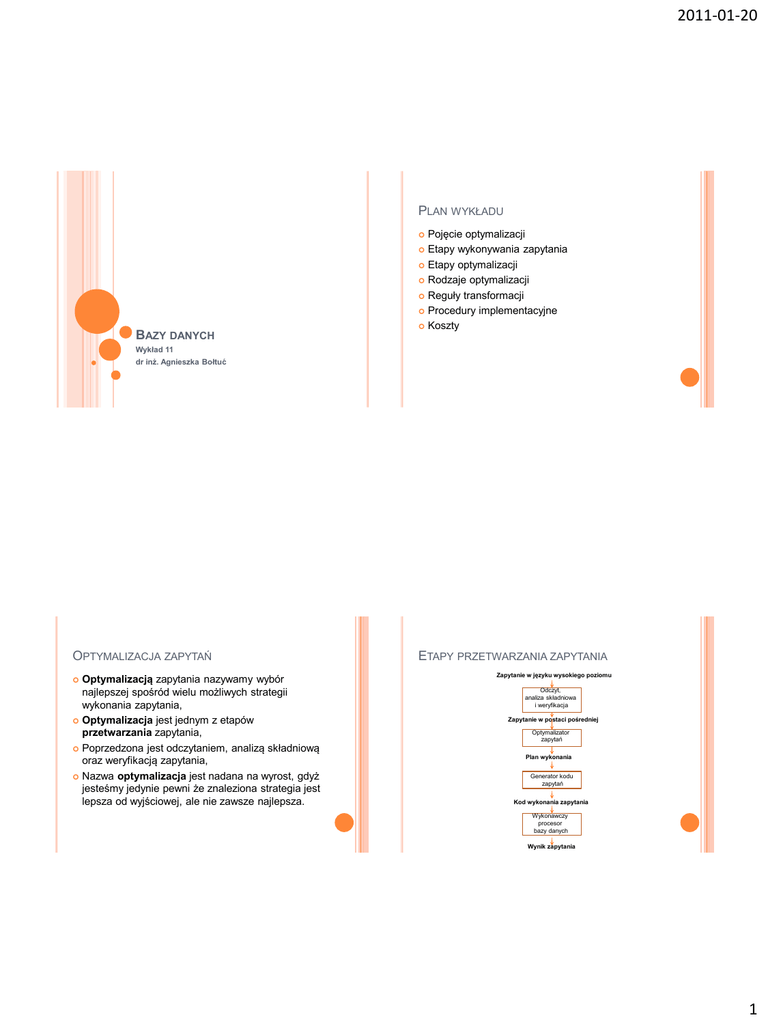 2011-01-20 PLAN WYKŁADU Pojęcie optymalizacji Etapy wykonywania zapytania Etapy optymalizacji Rodzaje optymalizacji Reguły transformacji Procedury implementacyjne Koszty BAZY DANYCH Wykład 11 dr inż. Agnieszka Bołtuć OPTYMALIZACJA ZAPYTAŃ Optymalizacją zapytania nazywamy wybór najlepszej spośród wielu możliwych strategii wykonania zapytania, Optymalizacja jest jednym z etapów przetwarzania zapytania, Poprzedzona jest odczytaniem, analizą składniową oraz weryfikacją zapytania, Nazwa optymalizacja jest nadana na wyrost, gdyż jesteśmy jedynie pewni że znaleziona strategia jest lepsza od wyjściowej, ale nie zawsze najlepsza. ETAPY PRZETWARZANIA ZAPYTANIA Zapytanie w języku wysokiego poziomu Odczyt, analiza składniowa i weryfikacja Zapytanie w postaci pośredniej Optymalizator zapytań Plan wykonania Generator kodu zapytań Kod wykonania zapytania Wykonawczy procesor bazy danych Wynik zapytania 1 2011-01-20 KLASYFIKACJA METOD OPTYMALIZACJI PRZYKŁAD Zapytanie SQL: Statyczna Dynamiczna SELECT Nazwisko FROM Dostawy JOIN Handlowcy WHERE nr_czesci=1; Wyrażenie w postaci algebry relacyjnej: Optymalizacja pojedynczego zapytania Optymalizacja zbioru zapytań π Nazwisko (σnr_czesci= 1(Dostawy PRZYKŁAD - REALIZACJA PRZYKŁAD - REALIZACJA Bezpośrednia – bez optymalizacji Złączenie tabel względem nr_czesci – wymaga odczytu dla każdej dostawy tabeli handlowcy, zapisania złączonych krotek na dysk, Restrykcja na otrzymanym po złączeniu wyniku do krotek z numerem części równym 1, Rzutowanie wyniku na atrybut Nazwisko. Z optymalizacją Restrykcja na relacji Dostawy do krotek odnoszących się do części nr 1, Złączenie wyniku kroku 1 z relacja Handlowcy, Rzutowanie wyniku kroku 2 na atrybut Nazwisko, Jeśli tabela Dostawy zawiera 10000 krotek a tabela Handlowcy 100, zaś tylko 50 krotek dotyczy części nr 1 to zapytanie to wymaga ponad 1000000 operacji wejścia- wyjścia. = Handlowcy)) Jeśli tabela Dostawy zawiera 10000 krotek a tabela Handlowcy 100 , zaś tylko 50 krotek dotyczy części nr 1 to zapytanie to wymaga ponad 10000 operacji wejściawyjścia. Wynik można poprawić zakładając indeks na pole nr_części w tabeli Dostawy. Wówczas liczba operacji wyniosłaby 150. 2 2011-01-20 ETAPY PROCESU OPTYMALIZACJI ETAP 1 – SFORMUŁOWANIE ZAPYTANIA 1. Sformułowanie zapytania w wewnętrznej reprezentacji Konwersja zapytania do pewnej reprezentacji wewnętrznej, która bardziej nadaje się do obróbki maszynowej, Wybór formalizmu na którym ta postać będzie się opierała: musi dawać możliwość reprezentacji dowolnych żądań, powinien być neutralny, 4. Plany realizacji zapytania i wybór najefektywniejszego rozwiązania Najczęściej wybiera się tzw. drzewo zapytania, ale także formalizmy algebry relacyjnej czy rachunku relacyjnego, ETAP 2 – PRZEKSZTAŁCENIE ETAP 3 – WYBÓR KANDYDATÓW Język SQL pozwala formułować zapytania na wiele sposobów, zaś wydajność zapytania nie powinna zależeć od postaci w jakiej zostało zapisane przez użytkownika, Etap ten polega na przekształceniu aktualnej postaci wewnętrznej do równoważnej mu postaci kanonicznej, Celem przekształcenia jest znalezienie wydajniejszej reprezentacji, Aby dokonać przekształcenia optymalizator używa tzw. reguł transformacji. 2. Przekształcenie do postaci kanonicznej 3. Wybór kandydatów do procedur implementacyjnych Na tym etapie zapada decyzja o sposobie wykonania przekształconego zapytania, Na wyrażenie stanowiące zapytanie należy spojrzeć jak na szereg operacji złączenia, restrykcji, etc. z pewnymi współzależnościami pomiędzy nimi, Dla każdej takiej operacji optymalizator posiada zestaw wcześniej zdefiniowanych procedur implementacyjnych, Z każdą procedurą związany jest wzór do obliczania kosztu wskazujący koszt jej realizacji (najczęściej w jednostkach we-wy), Optymalizator wybiera jedną lub więcej procedur implementujących każdą z operacji – ten proces nazywa się wyborem ścieżki dostępu. 3 2011-01-20 ETAP 4 – PLANY I WYBÓR TRANSFORMACJA WYRAŻEŃ Tworzony jest zbiór różnych planów wykonania zapytania oraz wybierany jest najlepszy, Nie należy tworzyć wszystkich możliwych planów dla danego zapytania, bo wiąże się to ze zwiększeniem kosztu znalezienia najlepszego, Wybór najefektywniejszego planu dokonuje się na bazie jego kosztu będącego sumą kosztów poszczególnych procedur – może to stanowić problem, gdyż koszty w dużej mierze zależą od rozmiaru danych. RESTRYKCJE I RZUTY RESTRYKCJE I RZUTY Sekwencja restrykcji z operatorem AND pojedyncza restrykcja Restrykcje i rzuty Rozdzielność Przemienność i łączność Idempotentność Skalarne wyrażenia obliczeniowe Wyrażenia warunkowe Przekształcenia semantyczne Restrykcja rzutu rzut restrykcji (A [rzut]) WHERE restrykcja (A WHERE restrykcja_1) WHERE restrykcja_2 A WHERE restrykcja_1 AND restrykcja_2 Sekwencja rzutów oprócz ostatniego (A WHERE restrykcja) [rzut] pomijanie wszystkich (A [rzut_1]) [rzut_2] A [rzut_2] 4 2011-01-20 ROZDZIELNOŚĆ ROZDZIELNOŚĆ Operator restrykcji jest rozdzielny względem sumy przecięcia i różnicy, a także złączenia jeśli warunek restrykcji dla dwóch argumentów operatora JOIN jest co najwyżej dwiema różnymi restrykcjami połączonymi operatorami AND, Operator rzutu jest rozdzielny względem sumy i przecięcia, nie różnicy, jest też rozdzielny względem złączenia jeśli wszystkie atrybuty złączenia znajdują się w rzucie. Operator monadyczny (jednoargumentowy) f jest rozdzielny względem operatora diadycznego , jeżeli f(A B) = f(A) f(B) dla każdego A i B. PRZEMIENNOŚĆ I ŁĄCZNOŚĆ Operator diadyczny jest przemienny PRZEMIENNOŚĆ I ŁĄCZNOŚĆ , jeżeli Operator diadyczny jest łączny A B=B A A dla każdego A i B. dla każdego A,B i C. Przemienne są: suma, przecięcie i złączenia, nie jest różnica i iloraz. (B C) = (A B) , jeżeli C Łączne są: suma, przecięcie i złączenia, nie jest r