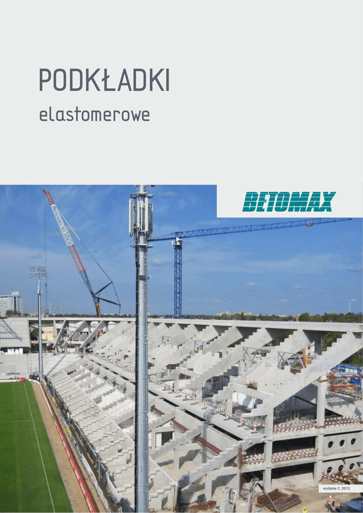 PODKŁADKI elastomerowe wydanie 2, 2013 Podkładki elastomerowe Szanowni Państwo, Sprzedażą podkładek i łożysk elastomerowych niemieckiej firmy LESCHUPLAST zajmujemy się od 2005 roku. Przez cały ten czas staramy się, aby oferowane przez nas produkty były najwyżej jakości oraz spełniały założenia normowe. Podkładki i łożyska elastomerowe LESCHUPLAST zdobyły uznanie na rynku. Ciszą się wielkim uznaniem wśród inwestorów, projektantów i wykonawców. Szeroka gama rodzajów i ciągłe poszerzanie asortymentu pozwala nam dobrać wspólnie z Klientem optymalne technicznie i ekonomicznie rozwiązanie. Jesteśmy przekonani, że przekazując w Państwa ręce niniejszy katalog ułatwimy Państwu dokonanie wyboru właściwego rozwiązania technicznego. W razie wątpliwości nasi doradcy techniczni są do Państwa dyspozycji na każdym etapie realizacji. Będziemy wdzięczni za wszelkie uwagi dotyczące zarówno zawartości merytorycznej jak również formy graficznej i sposobu przedstawienia informacji. Wybierając BETOMAX wybieracie solidnego partnera i zadowolenie z dobrej inwestycji. Betomax Polska S.A. ŁOŻYSKA KONSTRUKCYJNE elastomerowe PODKŁADKI DYSTANSOWE AKCESORIA i akcesoria zbrojarskie szalunkowe wydanie 1, 2011 wydanie 2, 2013 Okładka: Stadion Legii w Warszawie 2 wydanie 1, 2011 spis treści 1. Informacje ogólne 5 2. Podkładki elastomerowe n Podkładki niezbrojone typ N15, N20 n Podkładki niezbrojone typ N3 n Podkładki niezbrojone typ R5 n Podkładki niezbrojone typ TD 21 S n Podkładki niezbrojone ślizgowe typ NEG n Podkładki niezbrojone ślizgowe typ TDG 27 SZ n Podkładki zbrojone ślizgowe 13 typ B1EG n Podkładki tłumiące typ SD i TD 21 SD 3. Folie ślizgowe n Folie ślizgowe typ TG 1 A n Folie ślizgowe typ TG 5 POM 4. Instrukcje i wskazówki montażowe n Instrukcja montażu n Przykłady zastosowania n Zasady doboru 5. Szkody spowodowane brakiem stosowania podkładek elastomerowych 6. Aprobaty, badania 49 57 65 66 3 Podkładki elastomerowe spis treści 7. Referencje 8. Galeria 4 67 68 INFORMACJE OGÓLNE 5 Podkładki elastomerowe INFORMACJE OGÓLNE Profil firmy OGÓLNE INFORMACJE Wzajemne oparcie belek i innych elementów realizować można jako podparcie: na sucho, na zaprawie, poprzez podkładki twarde lub poprzez podkładki elastyczne (czyli podkładki elastomerowe). Bezpośrednie oparcie elementu na elemencie stosowane jest zwykle w przypadku opierania elementów lekkich. Trzeba mieć świadomość, że stykające się powierzchnie nigdy nie są idealnie gładkie, dlatego należy liczyć się z niezgodnością płaszczyzn podparcia i obciążenia oraz miejscowymi dociskami. Ugięcie elementu opieranego oraz obrót na podporze, prowadzą do koncentracji naprężeń na krawędzi. σ Koncentracja naprężeń na krawędzi prowadzi często do uszkodzenia i wykruszania krawędzi. Częściowo można temu zapobiec przez podcięcie górnej krawędzi podporowej. Nierówności płaszczyzn oparcia można zlikwidować poprzez warstwę zaprawy grubości 10-20mm. Ponieważ jest to podparcie niepodatne, istnieje możliwość wystąpienia wykruszeń jak przy oparciach bezpośrednich. Wykruszeń tych można uniknąć, cofając warstwę zaprawy od krawędzi elementu podpierającego o 15-20mm. Ale i to rozwiązanie nie spełnia wszystkich wymagań co do wykonania prawidłowego złącza elementów konstrukcyjnych w nowoczesnym budownictwie. 15‐20mm 6 zaprawa INFORMACJE OGÓLNE Kolejnym sposobem używanym bo wykonywania złączy konstrukcyjnych elementów budowlanych były i niekiedy jeszcze są stosowane – papy. Papa zapewnia możliwość przesuwu elementu podpieranego lecz tak jak i w przypadku zaprawy połączenie to jest złączem niepodatnym, więc także dochodzi do uszkodzeń konstrukcji. papa Budowa i właściwości podkładek elastomerowych Coraz częściej jako elementy pośredniego podparcia stosuje się podkładki elastyczne zwane podkładkami elastomerowymi. Są one stosunkowo młodym produktem i od około 30 lat wykorzystywane są do oparcia elementów prefabrykowanych oraz wykonywania tzw. przegubów w elementach monolitycznych. Zadaniem podkładek elastomerowych jest wyrównanie naprężeń w styku, zapewnienie swobodnego obrotu elementów na podporze oraz radykalne zmniejszenie sił poziomych wywołanych: skurczem, oddziaływaniem temperatury i odkształceniem ustroju. Jak sama nazwa wskazuje „podkładki elastomerowe” wykonywane są z elastomeru. Elastomerami określa się grupę tworzyw naturalnych i syntetycznych wykazujących dużą zdolność do odkształceń i rozciągliwości, z jednoczesnym zachowaniem cech sprężystych w szerokim zakresie temperatur. Elastomer jest tworzywem o specyficznej budowie cząsteczkowej. Ta budowa powoduje, że wraz ze zwiększeniem się obciążenia maleje podatność materiału, a co za tym idzie wzrasta gęstość materiału i jego nośność. Elastomery zachowują zdolność do powrotu do formy sprzed odkształcenia z niewielkim odkształceniem plastycznym (tzn. zachowują się prawie sprężyście). Jest to bardzo istotna cecha pozwalająca stosować te materiały w obiektach budowlanych bez konieczności ich wymiany w całym okresie eksplatacji budowli. Na podkładki elastyczne najczęściej stosuje się kauczuki syntetyczne i tu możemy wymienić takie rodzaje kauczuku jak: n kauczuk chloroprenowy (CR) n kauczuk etylenowo – propylenowo - dienowy (EPDM) n kauczuk poliuretanowy (PU) n kauczuk naturalny (NR) n kompozyt poliuretanowo-gumowy Kauczuki te nie są wrażliwe na występujące w budownictwie zmiany temperatur. Kauczuki sztuczne podlegają procesowi starzenia, co może prowadzić do wzrostu ich twardości i modułu sprężystości. Kauczuk naturalny ulega w tych warunkach degradacji, cechującej się zmniejszeniem wytrzymałości na rozciąganie. Procesy te są jednak bardzo powolne - rozłożone na dziesiątki lat. Pod wpływem warunków otoczenia (tlen, ozon, promieniowanie UV) następuje ty
