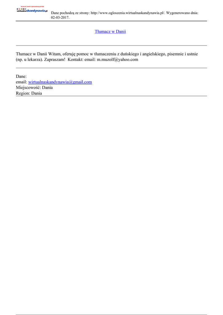 Dane pochodzą ze strony: http://www.ogloszenia.wirtualnaskandynawia.pl/. Wygenerowano dnia: 02-03-2017. Tłumacz w Danii Tłumacz w Danii Witam, oferuję pomoc w tłumaczeniu z duńskiego i angielskiego, pisemnie i ustnie (np. u lekarza). Zapraszam! Kontakt: email: [email protected] Dane: email: [email protected] Miejscowość: Dania Region: Dania