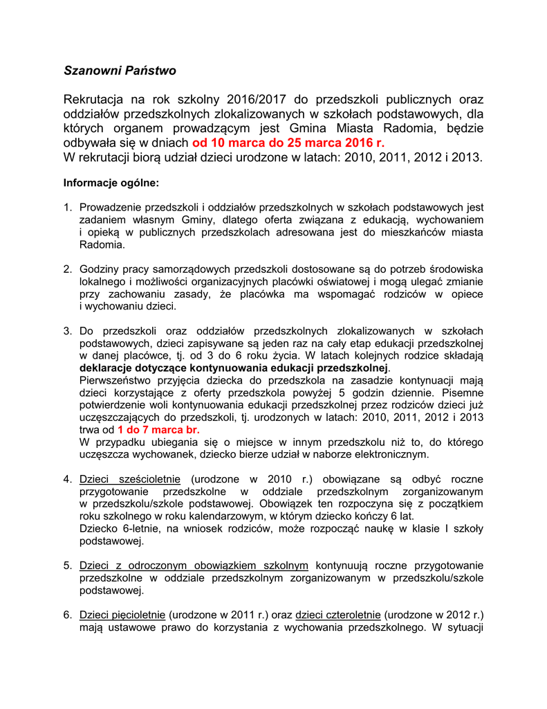 Szanowni Państwo Rekrutacja na rok szkolny 2016/2017 do przedszkoli publicznych oraz oddziałów przedszkolnych zlokalizowanych w szkołach podstawowych, dla których organem prowadzącym jest Gmina Miasta Radomia, będzie odbywała się w dniach od 10 marca do 25 marca 2016 r. W rekrutacji biorą udział dzieci urodzone w latach: 2010, 2011, 2012 i 2013. Informacje ogólne: 1. Prowadzenie przedszkoli i oddziałów przedszkolnych w szkołach podstawowych jest zadaniem własnym Gminy, dlatego oferta związana z edukacją, wychowaniem i opieką w publicznych przedszkolach adresowana jest do mieszkańców miasta Radomia. 2. Godziny pracy samorządowych przedszkoli dostosowane są do potrzeb środowiska lokalnego i możliwości organizacyjnych placówki oświatowej i mogą ulegać zmianie przy zachowaniu zasady, że placówka ma wspomagać rodziców w opiece i wychowaniu dzieci. 3. Do przedszkoli oraz oddziałów przedszkolnych zlokalizowanych w szkołach podstawowych, dzieci zapisywane są jeden raz na cały etap edukacji przedszkolnej w danej placówce, tj. od 3 do 6 roku życia. W latach kolejnych rodzice składają deklaracje dotyczące kontynuowania edukacji przedszkolnej. Pierwszeństwo przyjęcia dziecka do przedszkola na zasadzie kontynuacji mają dzieci korzystające z oferty przedszkola powyżej 5 godzin dziennie. Pisemne potwierdzenie woli kontynuowania edukacji przedszkolnej przez rodziców dzieci już uczęszczających do przedszkoli, tj. urodzonych w latach: 2010, 2011, 2012 i 2013 trwa od 1 do 7 marca br. W przypadku ubiegania się o miejsce w innym przedszkolu niż to, do którego uczęszcza wychowanek, dziecko bierze udział w naborze elektronicznym. 4. Dzieci sześcioletnie (urodzone w 2010 r.) obowiązane są odbyć roczne przygotowanie przedszkolne w oddziale przedszkolnym zorganizowanym w przedszkolu/szkole podstawowej. Obowiązek ten rozpoczyna się z początkiem roku szkolnego w roku kalendarzowym, w którym dziecko kończy 6 lat. Dziecko 6-letnie, na wniosek rodziców, może rozpocząć naukę w klasie I szkoły podstawowej. 5. Dzieci z odroczonym obowiązkiem szkolnym kontynuują roczne przygotowanie przedszkolne w oddziale przedszkolnym zorganizowanym w przedszkolu/szkole podstawowej. 6. Dzieci pięcioletnie (urodzone w 2011 r.) oraz dzieci czteroletnie (urodzone w 2012 r.) mają ustawowe prawo do korzystania z wychowania przedszkolnego. W sytuacji nieprzyjęcia dziecka do żadnego z przedszkoli/oddziałów przedszkolnych zlokalizowanych w szkołach podstawowych wskazanych we wniosku o przyjęcie, Prezydent Miasta Radomia wskaże rodzicom inne przedszkole lub oddział przedszkolny w szkole podstawowej, który przyjmie dziecko. 7. Dzieci trzyletnie (urodzone w 2013 r.) mogą uczestniczyć w postępowaniu rekrutacyjnym, ale w sytuacji nieprzyjęcia dziecka do żadnego z wskazanych we wniosku przedszkoli Prezydent Miasta Radomia nie ma obowiązku wskazywania innego przedszkola, które przyjmie dziecko. 8. Wzorem lat ubiegłych rekrutacja będzie odbywała się przy wsparciu systemu elektronicznego z wykorzystaniem jednolitych kryteriów naboru do wszystkich przedszkoli publicznych i oddziałów zlokalizowanych w szkołach podstawowych. Wnioski złożone w terminie rekrutacji są traktowane jednakowo (o przyjęciu nie decyduje kolejność zgłoszeń). Adres strony dla rodziców: www.oswiatawradomiu.pl - zakładka Nabór do przedszkoli (strona będzie aktywna: - od 8 marca godz. 8.00 - zapoznanie z ofertami przedszkoli publicznych oraz zlokalizowanych w szkołach podstawowych, - od 10 marca godz. 8.00 - nabór elektroniczny do przedszkoli i oddziałów zlokalizowanych w szkołach podstawowych. 9. Elektroniczny system ewidencji wniosków będzie dostępny w internecie na stronie: www.oswiatawradomiu.pl – zakładka Nabór do przedszkoli od 10 marca godz. 8.00 do 25 marca do godz. 12.00. Rodzice mogą ubiegać się o przyjęcie dziecka do maksymalnie 3 wybranych przez siebie przedszkoli/szkół podstawowych. Ich listę układają według swoich preferencji. Przedszkole/szkoła podstawowa umieszczone na liście na najwyższej pozycji jest przedszkolem/szkołą podstawową tzw. „pierwszego wyboru”. 10. Ewidencja wniosków o przyjęcie dzieci do przedszkoli/oddziałów przedszkolnych w szkołach podstawowych prowadzona jest w podziale na grupy wiekowe trzy-, cztero-, pięcio- i sześciolatków, wskazane przez dyrektorów w ofertach przedszkoli oraz szkół podstawowych. 11. Do przedszkola, w uzasadnionych przypadkach i w miarę wolnych miejsc w placówce, mogą uczęszczać dzieci, które ukończyły 2,5 roku (rocznik 2014) oraz dzieci spoza Radomia. Rodzice tych dzieci mogą starać się o zapisanie ich do przedszkoli po 1 września 2016 r. Zasady i terminarz rekrutacji: • 1 marca godz. 8.00 - 7 marca 2016 r. do godz. 15.00 - składanie w przedszkolach przez rodziców/prawnych opiekunów deklaracji kontynuacji edukacji przedszkolnej przez dziecko w danym przedszkolu oraz w szkołach podstawowych - deklaracji kontynuacji rocznego przygotowania przedszkolnego przez 6-latki, których rodzice podjęli decyzję o ponownym realizowaniu przez dziecko obowiązkowego przygotowania przedszkolnego. Dzieci kontynuujące edukację przedszkolną w dotychczasowym przedszkolu nie biorą udziału w rekrutacji elektronicznej. Deklarację dotyczącą dalszego uczęszczania dziecka do danego przedszkola/oddziału zlokalizowanego w szkole podstawowej można otrzymać w wyżej wymienionych placówkach. • 8 marca 2016 r. godz. 8.00 - publikacja oferty przedszkoli publicznych oraz szkół podstawowych na rok szkolny 2016/2017 na stronie internetowej: www.oswiatawradomiu.pl - zakładka: Nabór do przedszkoli • 10 marca godz. 8.00 – 25 marca 2016 r. do godz. 12.00 - rekrutacja elektroniczna dzieci przystępujących do naboru. • 22 kwietnia 2016 r. godz. 12.00 - ogłoszenie list dzieci zakwalifikowanych do przedszkoli oraz oddziałów zlokalizowanych w szkołach podstawowych (wyniki na