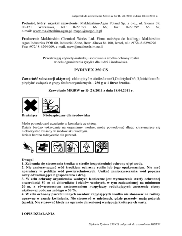 Załącznik do zezwolenia MRiRW Nr R- 28 /2011 z dnia 18.04.2011 r. Podmiot, który uzyskał zezwolenie: Makhteshim-Agan Poland Sp. z o.o., ul. Sienna 39, 00-121 Warszawa, tel.: 0-22 395 66 66; fax: 0-22 395 66 67, e-mail: www.makhteshim-agan.pl, [email protected] Producent: Makhteshim Chemical Works Ltd. Firma należąca do holdingu Makhteshim Agan Industries POB 60, Industrial Zone, Beer -Sheva 84 100, Izrael, tel.: /972/-8-6296996 Fax: /972/-8-6296909, e-mail. [email protected] Przestrzegaj etykiety-instrukcji stosowania środka ochrony roślin w celu ograniczenia ryzyka dla ludzi i środowiska. PYRINEX 250 CS Zawartość substancji aktywnej: chloropiryfos /tiofosforan-O,O-dietylu-O-3,5,6-trichloro-2pirydylu/ związek z grupy fosforoorganicznych - 250 g w 1 litrze środka. Zezwolenie MRiRW nr R- 28/2011 z dnia 18.04.2011 r. Drażniący Niebezpieczny dla środowiska Może powodować uczulenie w kontakcie ze skórą. Działa bardzo toksycznie na organizmy wodne, może powodować długo utrzymujące się niekorzystne zmiany w środowisku wodnym. Działa bardzo toksycznie dla pszczół. Uwaga! 1. Zabrania się stosowania środka w strefie bezpośredniej ochrony ujęć wody. 2. Nie zanieczyszczać wód środkiem ochrony roślin lub jego opakowaniem. Nie myć aparatury w pobliżu wód powierzchniowych. Unikać zanieczyszczania wód poprzez rowy odwadniające z gospodarstw i dróg. 3. W celu ochrony organizmów wodnych konieczne jest wyznaczenie strefy ochronnej o szerokości 50 m od zbiorników i cieków wodnych, w tym zadawnionej na minimum 20 m, z równoczesnym zastosowaniem rozpylaczy redukujących znoszenie cieczy użytkowej podczas zabiegu o 50 %. 4. W celu ochrony pszczół i innych owadów zapylających środka nie stosować na rośliny uprawne w czasie kwitnienia. Nie stosować w miejscach, gdzie pszczoły mają pożytek (spadź). Nie stosować kiedy na uprawie chronionej występują kwitnące chwasty. I OPIS DZIAŁANIA Etykieta Pyrinex 250 CS, załącznik do zezwolenia MRiRW Środek owadobójczy w formie zawiesiny mikrokapsuł w cieczy do rozcieńczania wodą, o działaniu kontaktowym, żołądkowym i gazowym, przeznaczony do zwalczania szkodników w rzepaku ozimym i jarym. Na roślinie działa powierzchniowo. Środek przeznaczony do stosowania przy użyciu opryskiwaczy polowych. II ZAKRES STOSOWANIA, TERMINY I DAWKI ROŚLINY ROLNICZE Rzepak ozimy Chowacz brukwiaczek (zabieg zwalcza również słodyszka rzepakowego w przypadku bardzo wczesnych nalotów) Zalecana dawka: 0,75-1,0 l/ha Opryskiwać w 7-10 dni po pierwszych nalotach szkodnika, tuż przed kwitnieniem (BBCH 2039-57). Środek niszczy również jaja i młode larwy obecne już w roślinie. Słodyszek rzepakowy, chowacz czterozębny (zabieg przeciwko słodyszkowi zwalcza również chowacza czterozębnego). Zalecana dawka: 0,75-1,0 l/ha. Opryskiwać w fazie zwartego kwiatostanu, po wystąpieniu chrząszczy na plantacji (BBCH 50-57). Zalecana ilość wody: 150-400 l/ha. Zalecane opryskiwanie: średniokropliste. Rzepak jary Słodyszek rzepakowy Zalecana dawka: 0,75-1,0 l/ha Opryskiwać po wystąpieniu chrząszczy na plantacji, w fazach od wzrostu pędu do zwartego kwiatostanu (BBCH 30-57). Zalecana ilość wody: 150-400 l/ha. Zalecane opryskiwanie: średniokropliste. UWAGI: Środek działa najskuteczniej w temperaturze powyżej 15 oC. Unikać znoszenia cieczy użytkowej na sąsiednie kwitnące rośliny. III OKRES KARENCJI Okres od dnia ostatniego zabiegu do dnia zbioru i przeznaczenia do konsumpcji RZEPAK OZIMY I RZEPAK JARY - 70 DNI IV OKRES PREWENCJI DLA PSZCZÓŁ Okres zapobiegający zatruciu NIE DOTYCZY V OKRES PREWENCJI DLA LUDZI I ZWIERZĄT Okres zapobiegający zatruciu NIE DOTYCZY VI SPORZĄDZANIE CIECZY UŻYTKOWEJ Etykieta Pyrinex 250 CS, załącznik do zezwolenia MRiRW Przed przystąpieniem do sporządzenia cieczy użytkowej dokładnie ustalić potrzebną jej ilość. Odmierzoną ilość środka wlać do zbiornika opryskiwacza napełnionego częściowo wodą (z włączonym mieszadłem). Opróżnione opakowania przepłukać trzykrotnie wodą, a popłuczyny wlać do zbiornika wody z cieczą użytkową. Następnie zbiornik opryskiwacza uzupełnić wodą do potrzebnej ilości. Po wlaniu środka do zbiornika opryskiwacza nie wyposażonego w mieszadło hydrauliczne ciecz mechanicznie wymieszać. Po pracy aparaturę dokładnie wymyć. VII PRZECHOWYWANIE Przechowywać z dala od źródeł ciepła. Przechowywać wyłącznie w oryginalnym opakowaniu w temperaturze nie przekraczającej 0oC i 30oC. Chronić przed dziećmi. Nie przechowywać razem z żywnością, napojami i paszami dla zwierząt. VIII WARUNKI BEZPIECZNEGO STOSOWANIA ŚRODKA OCHRONY ROŚLIN Nie jeść i nie pić podczas stosowania produktu. Nosić odpowiednią odzież ochronną i odpowiednie rękawice ochronne. Unikać zanieczyszczenia skóry W razie połknięcia niezwłocznie zasięgnij porady lekarza - pokaż opakowanie lub etykietę. Resztki cieczy użytkowej rozcieńczyć wodą i wypryskać na powierzchni poprzednio opryskiwanej. Wodę użytą do mycia aparatury wypryskać na powierzchni uprzednio opryskiwanej, stosując te same środki ochrony osobistej. Środek i opakowanie usuwać jako odpad niebezpieczny. Opróżnione opakowania po środku zwrócić do sprzedawcy, u którego środek został zakupiony. Używać odpowiednich pojemników zapobiegających skażeniu środowiska. Zabrania się spalania opakowań po środku ochrony roślin we własnym zakresie. Uwaga! ZABRANIA SIĘ WYKORZYSTYWANIA OPRÓŻNIONYCH OPAKOWAŃ PO ŚRODKACH OCHRONY ROŚLIN DO INNYCH CELÓW, W TYM TAKŻE TRAKTOWANIA ICH JAKO SUROWCE WTÓRNE. IX ANTIDOTUM Objawy zatrucia Pocenie, bóle głowy, osłabienie, zawroty głowy, mdłości, bóle żołądka, wymioty, zwężenie źrenic, zaburzenie wzroku, drżenie mięśni. Pierwsza pomoc Jeśli wystąpiły jakiekolwiek spośród wyżej wymienionych objawów, zwłaszcza jeśli znana jest przyczyna skażenia: przerwać pracę, zdjąć zanieczyszczon