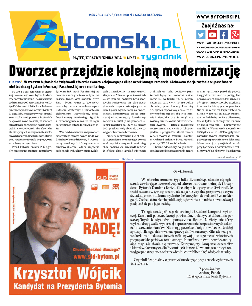www. twitter.com/BytomskiPL www.youtube.com/user/redbytomski www. facebook.pl/bytomski.pl PIĄTEK, 17 października 2014 www. google.pl/bytomski.pl NR 37 Dworzec przejdzie kolejną modernizację W czerwcu bytomianie świętowali otwarcie dworca kolejowego po długo oczekiwanym remoncie. Niebawem stacja zostanie wyposażona w elektroniczny System Informacji Pasażerskiej oraz monitoring. Po wielu latach zaniedbań w pierwszej połowie tego roku bytomski dworzec doczekał się liftingu holu i przejścia podziemnego pod peronami. Polskie Koleje Państwowe i Polskie Linie Kolejowe przeznaczyły na ten cel łącznie 1,6 mln zł. W ciągu kilku miesięcy dworzec zmienił się w środku nie do poznania. Budowlańcy wykonali nowe posadzki, na ścianach zamontowali nowoczesne panele, rozebrali i na nowo wykonali cały sufit w holu, a także wyczyścili wielką mozaikę z kolorowych kamieni na jednej ze ścian. Dzięki temu stacja wreszcie stała się pozytywną wizytówką naszego miasta. Przed kilkoma dniami PLK ogłosiły przetarg na montaż i rozbudowę Systemu Informacji Pasażerskiej na dworcach w całym kraju, w tym i na naszym dworcu oraz stacjach Bytom Karb i Bytom Północny. Jego wykonawca będzie miał za zadanie zaprojektować, dostarczyć i zamontować elektroniczne wyświetlacze, megafony i kamery monitoringu. Zgodnie z harmonogramem ma to nastąpić najpóźniej do listopada przyszłego roku. W ramach zamówienia na peronach bytomskiego dworca pojawi się 36 wyświetlaczy krawędziowych, 6 wyświetlaczy tunelowych i 3 wyświetlacze tunelowe zbiorcze. Będą to urządzenia podobne do tych, jakie w minionych la- tach zainstalowano na największych stacjach w Polsce ― np. w Katowicach. Za ich pomocą podróżni będą mogli szybko zorientować się jakie pociągi w najbliższym czasie wjadą na perony. Oprócz wyświetlaczy na dworcu zostaną zamontowane tablice informacyjne i nowe zegary. Ponadto wykonawca zainstaluje na peronach 40 kamer monitoringu, które na bieżąco będą przekazywały obraz do dworcowego centrum monitorowania. Niestety zamówienie nie obejmuje wyposażenia holu naszego dworca w ekrany informacyjne i monitoring, choć dopiero co przeszedł remont. W efekcie, chcąc uzyskać informacje o aktualnym ruchu pociągów pasażerowie będą zmuszeni od razu skierować się do tunelu lub na perony, natomiast odnowiony hol nie będzie chroniony przez kamery. Rzecznicy obu spółek zapewniają jednak, że firmy współpracują ze sobą w tej sprawie i niewykluczone, że urządzenia zostaną zainstalowane także we wnętrzu dworca. ― Istnieje możliwość rozszerzenia zamówienia o tablice odjazdów i przyjazdów zlokalizowaną w holu dworca w Bytomiu ― poinformował nas Bartłomiej Sarna, rzecznik prasowy PKP S.A. we Wrocławiu. Obecnie odnowiony hol jest funkcjonalnie upośledzony. Co prawda można w nim się schronić przed złą pogodą i wygodnie zaczekać na pociąg, lecz poza plakatami z rozkładem jazdy, nie oferuje on innego sposobu uzyskania informacji o bieżących połączeniach. Nie da się w nim też kupić biletów, bo nie ma w nim kas, ani nawet automatów. ― Podobnie, jak inne biletomaty, ten w Bytomiu chcemy zainstalować do końca tego roku ― poinformował nas Michał Wawrzaszek, rzecznik Kolei Śląskich. ― Od PKP Energetyki i od zarządcy dworca otrzymaliśmy propozycję rozpatrzenia nowej lokalizacji biletomatu, tj. przy wejściu do tunelu przy hydrancie i pomieszczeniu technicznym. W najbliższych dniach przez Oświadczenie W ostatnim numerze tygodnika Bytomski.pl ukazało się ogłoszenie zawierające oszczerstwa pod adresem zarówno moim jak i Prezydenta Bytomia Damiana Bartyli. Chciałbym kategorycznie stwierdzić, że treści zawarte w tym ogłoszeniu nie maja nic wspólnego z prawdą o czym świadczą choćby dokumenty, które dostarczyłem do redakcji Bytomskiego.pl. Osoba, która zleciła publikację ogłoszenia nie miała nawet odwagi podpisać się pod jego treścią. To ogłoszenie jest częścią brudnej i brutalnej kampanii wyborczej. Kampanii podczas, której powinniśmy pokazywać dokonania poszczególnych kandydatów i pomysły na Bytom. Niestety, niektórzy wybrali drogę walki wyborczej poprzez rzucanie bezpodstawnych oskarżeń i szerzenie kłamstw. Nie mogę pozostać obojętny wobec zaistniałej sytuacji, dlatego skierowałem sprawę do Prokuratury. Nikt nie ma prawa bezkarnie atakować innych osób używając do tego metod właściwych propagandzie państwa totalitarnego. Kłamstwo, nawet powtórzone tysiąc razy, nie stanie się prawdą. Zatrzymajmy kampanie oszczerstw i kłamstw. Oceńmy co dla Bytomia jest lepsze. Nowe miejsca pracy i rozwój gospodarczy czy zacietrzewienie i chorobliwa chęć zdobycia władzy. Czytelników prosimy o przemyślane decyzje przy urnach wyborczych 16.11.2014 r. Z poważaniem Andrzej Panek I Zastępca Prezydenta Bytomia 2 piątek, 17 października2014 www.bytomski.pl Dworzec przejdzie kolejną modernizację Zarejestrowali listy, chwalą się kandydatami naszego pracownika przeprowadzona zostanie ekspertyza dot. nowej lokalizacji, a następnie odbędzie się spotkanie przedstawicieli PKP Energetyki, zarządcy dworca oraz firmy montażowej w sprawie ustaleń instalacji biletomatu ― wyjaśnia Wawrzaszek. PKP Intercity realizujące połączenia dalekobieżne nie planuje ustawienia swojego urządzenia, natomiast planuje nawiązać współpracę z Kolejami Śląskimi w kwestii sprzedaży biletów za pośrednictwem sieci dystrybucji naszego regionalnego przewoźnika. ― Do tego czasu podróżni mogą kupić bilet na pokładzie pociągu, bez ponoszenia jakichkolwiek dodatkowych opłat. Wygodny sposób zakupu to też nasza sprzedaż internetowa ― bilet z Internetu pasażer może wydrukować lub zapisać np. w komórce czy na tablecie ― proponuje Marta Ziemska z Intercity. W sprawie wyposażenia naszej głównej stacji zamierza zainterweniować poseł Jacek Brzezinka. Jego zdaniem montaż 
