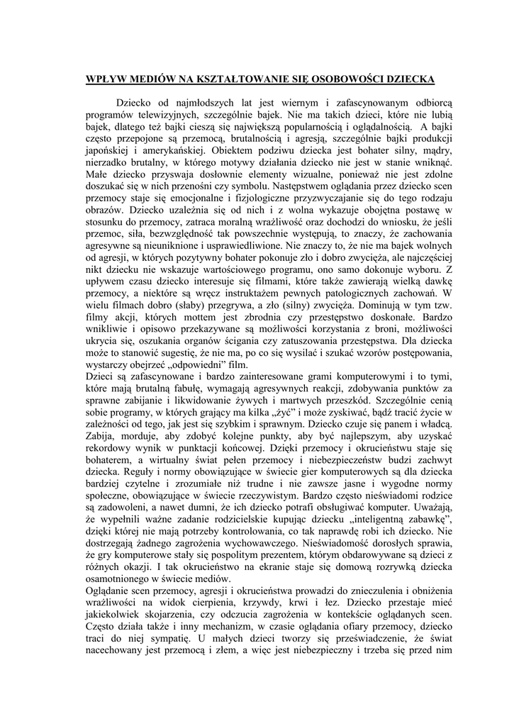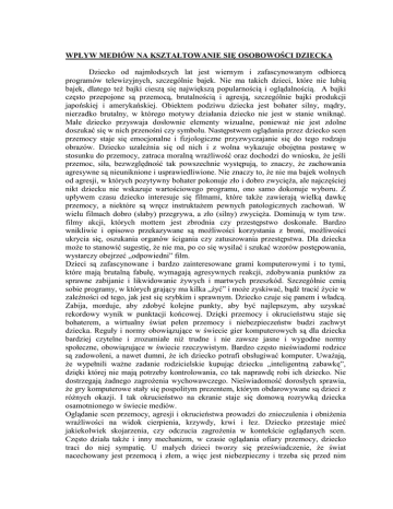WPŁYW MEDIÓW NA KSZTAŁTOWANIE SIĘ OSOBOWOŚCI DZIECKA Dziecko od najmłodszych lat jest wiernym i zafascynowanym odbiorcą programów telewizyjnych, szczególnie bajek. Nie ma takich dzieci, które nie lubią bajek, dlatego też bajki cieszą się największą popularnością i oglądalnością. A bajki często przepojone są przemocą, brutalnością i agresją, szczególnie bajki produkcji japońskiej i amerykańskiej. Obiektem podziwu dziecka jest bohater silny, mądry, nierzadko brutalny, w którego motywy działania dziecko nie jest w stanie wniknąć. Małe dziecko przyswaja dosłownie elementy wizualne, ponieważ nie jest zdolne doszukać się w nich przenośni czy symbolu. Następstwem oglądania przez dziecko scen przemocy staje się emocjonalne i fizjologiczne przyzwyczajanie się do tego rodzaju obrazów. Dziecko uzależnia się od nich i z wolna wykazuje obojętna postawę w stosunku do przemocy, zatraca moralną wrażliwość oraz dochodzi do wniosku, że jeśli przemoc, siła, bezwzględność tak powszechnie występują, to znaczy, że zachowania agresywne są nieuniknione i usprawiedliwione. Nie znaczy to, że nie ma bajek wolnych od agresji, w których pozytywny bohater pokonuje zło i dobro zwycięża, ale najczęściej nikt dziecku nie wskazuje wartościowego programu, ono samo dokonuje wyboru. Z upływem czasu dziecko interesuje się filmami, które także zawierają wielką dawkę przemocy, a niektóre są wręcz instruktażem pewnych patologicznych zachowań. W wielu filmach dobro (słaby) przegrywa, a zło (silny) zwycięża. Dominują w tym tzw. filmy akcji, których mottem jest zbrodnia czy przestępstwo doskonałe. Bardzo wnikliwie i opisowo przekazywane są możliwości korzystania z broni, możliwości ukrycia się, oszukania organów ścigania czy zatuszowania przestępstwa. Dla dziecka może to stanowić sugestię, że nie ma, po co się wysilać i szukać wzorów postępowania, wystarczy obejrzeć „odpowiedni” film. Dzieci są zafascynowane i bardzo zainteresowane grami komputerowymi i to tymi, które mają brutalną fabułę, wymagają agresywnych reakcji, zdobywania punktów za sprawne zabijanie i likwidowanie żywych i martwych przeszkód. Szczególnie cenią sobie programy, w których grający ma kilka „żyć” i może zyskiwać, bądź tracić życie w zależności od tego, jak jest się szybkim i sprawnym. Dziecko czuje się panem i władcą. Zabija, morduje, aby zdobyć kolejne punkty, aby być najlepszym, aby uzyskać rekordowy wynik w punktacji końcowej. Dzięki przemocy i okrucieństwu staje się bohaterem, a wirtualny świat pełen przemocy i niebezpieczeństw budzi zachwyt dziecka. Reguły i normy obowiązujące w świecie gier komputerowych są dla dziecka bardziej czytelne i zrozumiałe niż trudne i nie zawsze jasne i wygodne normy społeczne, obowiązujące w świecie rzeczywistym. Bardzo często nieświadomi rodzice są zadowoleni, a nawet dumni, że ich dziecko potrafi obsługiwać komputer. Uważają, że wypełnili ważne zadanie rodzicielskie kupując dziecku „inteligentną zabawkę”, dzięki której nie mają potrzeby kontrolowania, co tak naprawdę robi ich dziecko. Nie dostrzegają żadnego zagrożenia wychowawczego. Nieświadomość dorosłych sprawia, że gry komputerowe stały się pospolitym prezentem, którym obdarowywane są dzieci z różnych okazji. I tak okrucieństwo na ekranie staje się domową rozrywką dziecka osamotnionego w świecie mediów. Oglądanie scen przemocy, agresji i okrucieństwa prowadzi do znieczulenia i obniżenia wrażliwości na widok cierpienia, krzywdy, krwi i łez. Dziecko przestaje mieć jakiekolwiek skojarzenia, czy odczucia zagrożenia w kontekście oglądanych scen. Często działa także i inny mechanizm, w czasie oglądania ofiary przemocy, dziecko traci do niej sympatię. U małych dzieci tworzy się przeświadczenie, że świat nacechowany jest przemocą i złem, a więc jest niebezpieczny i trzeba się przed nim bronić. W późniejszym wieku utrwala się u dziecka wiara, że zjawiska przemocy jest wpisane w otaczającą rzeczywistość i w zachowania ludzkie, a więc jest powszechnie akceptowane. Kolejnym skutkiem oglądania programów zawierających drastyczne treści jest utrwalanie stłumionych potrzeb agresji, czego efektem jest skłonność do zabaw agresywnych, bójek i konfliktów z rówieśnikami. Innym skutkiem jest mniejsza kreatywność dziecka, czyli mniejsze otwarcie na poszukiwanie sposobów rozwiązywania trudności interpersonalnych. Potrzeby dziecka związane z oglądaniem scen przemocy wynikają z zaburzonej już sfery emocjonalnej. Reakcją na stres, bunt, ucieczkę od rzeczywistości jest szukanie rozrywki w programach zawierających treści agresywne i brutalne. Nie mając zrównoważonych pozytywnych wzmocnień, agresję i przemoc uznaje dziecko, jako sposób na zaspokojenie wewnętrznych potrzeb. Powoduje to wyobcowanie i zahamowanie rozwoju społecznego. Im bardziej dziecko ocenia, ze świat mediów jest realistyczny, tym większe jest prawdopodobieństwo, że ono te wzorce będzie próbowało naśladować. Przedstawione czynniki i sytuacje mają bezpośredni wpływ na kształtowanie się niewłaściwych cech osobowości dziecka, są przyczyną powstawania nieprzystosowania społecznego oraz zjawisk patologii społecznej, szczególnie przestępczości. Dane statystyczne dotyczące wzrostu zachowań patologicznych dzieci i młodzieży budzą poważny niepokój naukowców, ludzi zajmujących się edukacją i wychowanie dzieci i młodzieży oraz opinii społecznej. Dużym błędem byłoby twierdzenie, że media mają tylko negatywny wpływ na kształtowanie się osobowości dziecka. Mogą mieć bardzo pozytywny i korzystny wpływ na dzieci pod warunkiem, że rodzice będą stosować pewne zasady postępowania. Do najważniejszych należy zaliczyć: Pozwalanie na oglądanie tylko programów dla dzieci odpowiednich dla ich wieku oraz możliwości intelekt