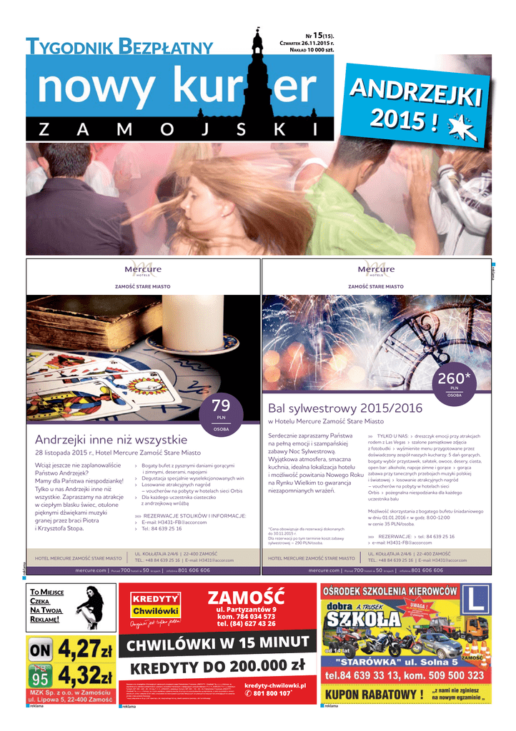 Nr 15(15). Czwartek 26.11.2015 r. Nakład 10 000 szt. Tygodnik Bezpłatny ANDRZEJKI 2015 ! reklama ZAMOŚĆ STARE MIASTO ZAMOŚĆ STARE MIASTO 260* PLN 79 PLN Andrzejki inne niż wszystkie OSOBA 28 listopada 2015 r., Hotel Mercure Zamość Stare Miasto Wciąż jeszcze nie zaplanowaliście Państwo Andrzejek? Mamy dla Państwa niespodziankę! Tylko u nas Andrzejki inne niż wszystkie. Zapraszamy na atrakcje w ciepłym blasku świec, otulone pięknymi dźwiękami muzyki granej przez braci Piotra i Krzysztofa Stopa. reklama HOTEL MERCURE ZAMOŚĆ STARE MIASTO mercure.com | Ponad › Bogaty bufet z pysznymi daniami gorącymi i zimnymi, deserami, napojami › Degustacja specjalnie wyselekcjonowanych win › Losowanie atrakcyjnych nagród – voucherów na pobyty w hotelach sieci Orbis › Dla każdego uczestnika ciasteczko z andrzejkową wróżbą ›››› REZERWACJE STOLIKÓW I INFORMACJE: › E-mail: [email protected] › Tel.: 84 639 25 16 UL. KOŁŁĄTAJA 2/4/6 | 22-400 ZAMOŚĆ TEL.: +48 84 639 25 16 | E-mail: [email protected] 700 hoteli w 50 krajach | infolinia 801 606 606 OSOBA Bal sylwestrowy 2015/2016 w Hotelu Mercure Zamość Stare Miasto Serdecznie zapraszamy Państwa na pełną emocji i szampańskiej zabawy Noc Sylwestrową. Wyjątkowa atmosfera, smaczna kuchnia, idealna lokalizacja hotelu i możliwość powitania Nowego Roku na Rynku Wielkim to gwarancja niezapomnianych wrażeń. reklama ›››› REZERWACJE: › tel.: 84 639 25 16 › e-mail: [email protected] HOTEL MERCURE ZAMOŚĆ STARE MIASTO To Miejsce Czeka Na Twoją Reklamę! reklama Możliwość skorzystania z bogatego bufetu śniadaniowego w dniu 01.01.2016 r. w godz. 8:00-12:00 w cenie 35 PLN/osoba. *Cena obowiązuje dla rezerwacji dokonanych do 30.11.2015 r. Dla rezerwacji po tym terminie koszt zabawy sylwestrowej – 290 PLN/osoba. mercure.com | reklama ››› TYLKO U NAS: › dreszczyk emocji przy atrakcjach rodem z Las Vegas › szalone pamiątkowe zdjęcia z fotobudki › wyśmienite menu przygotowane przez doświadczony zespół naszych kucharzy: 5 dań gorących, bogaty wybór przystawek, sałatek, owoce, desery, ciasta, open bar: alkohole, napoje zimne i gorące › gorąca zabawa przy tanecznych przebojach muzyki polskiej i światowej › losowanie atrakcyjnych nagród – voucherów na pobyty w hotelach sieci Orbis › pożegnalna niespodzianka dla każdego uczestnika balu Ponad UL. KOŁŁĄTAJA 2/4/6 | 22-400 ZAMOŚĆ TEL.: +48 84 639 25 16 | E-mail: [email protected] 700 hoteli w 50 krajach | infolinia 801 606 606 2 www.kurierzamojski.pl Bezpłatne USG w Zamościu Roztoczańska szkoła Ultrasonografii prowadzi rejestrację telefoniczną na bezpłatne badania USG, które odbędą się w grudniu. Na badania należy zapisywać się wyłącznie telefonicznie, w godzinach 8:00 do 16:00 w dni robocze: Panowie będą mogli zapisać się 1 grudnia na bezpłatne badanie USG jąder. Badania jąder będą przeprowadzane w dniach 12 i 13 grudnia w Hotelu Artis. Osoby, które leczą tarczycę, mają stwierdzone zmiany tarczycy, wskazanie do biopsji lub już mają wykonaną biopsję, mogą zapisać się 3 grudnia na USG tarczycy. Badania będą wykonywane w Hotelu Jubilat w dniach 12-13 grudnia. tel. 84 638 80 90, 84 638 80 91, 84 638 55 12. Aktualnie trwają zapisy na bezpłatne USG narządów kobiecych (jajniki, macica) oraz USG ciąży. Badania będą przeprowadzane w Hotelu Artis w dniach 9-11 grudnia. Zachęcamy do skorzystania z możliwości wykonania wysokiej jakości bezpłatnych badań USG. 30 listopada rozpocznie się rejestracja na badanie USG jamy brzusznej. Badania odbędą się w dniach 7-11 grudnia w Hotelu Jubilat. ◘ Okienko Literackie Szanowni Poeci, Pisarze i Wy Wielcy Grafomani Chwytajcie za poetyckie pióra, lub prozaiczne długopisy. Nowy Kurier Zamojski otwiera dla Was swoje Okienko literackie. Ślijcie do nas na adres [email protected] swoje teksty. Czekamy na Waszą twórczość. Różną, ale nie każdą. Wybór będzie stricte subiektywny. Jesień Życia Gdy nadejdzie nasza jesień życia To nie bądź smutny czy smutna Choć ta jesień dla Was Staje się okrutna Głowę do góry A piersi do przodu I pomyśl sobie Kiedy się było młodym Były różne rozrywki Z podskokami do góry Praca, różne obowiązki I życie bezpieczne I każdy z nas myślał Że to trwać będzie wiecznie Ale to wszystko powoli się kończy Nastaje nasza jesień życia I przychodzi czas naszej rozłąki Życie nie trwa wiecznie Trzeba się z tym pogodzić Bo tylko raz w życiu Człowiek może się narodzić Seniorka Marianna Adamczyk Zamość, 9.11.2015r. Ważne telefony w Zamościu Telefony alarmowe 84 677 63 00 Pogotowie 999 Powiatowy Urząd Pracy 84 638 33 31 Straż Pożarna 998 Urząd Celny 84 748 48 82 Policja 997 Urząd Miasta 84 639 20 84 Pogotowie Wodno-Kanalizacyjne 994 Urząd Gminy 84 639 29 59 ZUS 84 639 60 95 Pogotowie ciepłownicze 993 Kino Stylowy 84 639 23 13 Galeria Twierdza 84 530 05 01 Pogotowie gazowe 992 Starostwo Powiatowe 84 530 09 00 Pogotowie energetyczne 991 84 639 33 29 Straż Miejska 968 Pomoc drogowa 981 Urząd Skarbowy Urząd Stanu Cywilnego Prokuratura Rejonowa 84 677 12 56 Książnica Zamojska 84 638 58 72 Szpital Wojewódzki 84 677 33 33 Zamojski Szpital Niepubliczny 84 677 50 00 Sąd Rejonowy 84 639 29 77 Ogród zoologiczny 84 639 34 79 Apteka 24H 84 677 32 24 Pogotowie Komputerowe 573 488 999 Komenda Miejska Policji 84 677 14 17 84 677 14 62 reklama Biuro ogłoszeń i reklamy: Tomasz Krywionek Plac Stefanidesa 6 [email protected] tel.: 730 210 777 DTP: IMP-IT Za treść ogłoszeń i reklam Redakcja nie ponosi odpowiedzialności. Zastrzegamy sobie prawo do publikowania danych osobowych laureatów konkursów i krzyżówek. facebook.com /kurierzamojski Druk: Drukarnia Warszawa, ul. Matuszewska 14, 03-876 Warszawa reklama Wydawca: Agnieszka Ciurysek Kurier Zamojski www.kurierzamojski.pl Adres do korespondencji: Nowy Kurier Zamojski skrytka pocztowa 206 22-400 Zamość e-mail: [