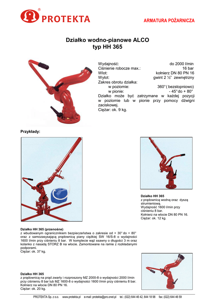 ARMATURA POśARNICZA Działko wodno-pianowe ALCO typ HH 365 Wydajność: do 2000 l/min Ciśnienie robocze max.: 16 bar Wlot: kołnierz DN 80 PN 16 Wylot: gwint 2 ½” zewnętrzny Zakres obrotu działka: w poziomie: 360° ( bezstopniowo) w pionie: - 45° do + 80° Działko może być zatrzymane w każdej pozycji w poziomie lub w pionie przy pomocy dźwigni zaciskowej. Ciężar: ok. 9 kg. Przykłady: Działko HH 365 z prądownicą wodną oraz dyszą strumieniową. Wydajność 1600 l/min przy ciśnieniu 8 bar. Kołnierz na wlocie DN 80 PN 16. Ciężar: ok. 12 kg. Działko HH 365 (przenośne) z wbudowanym ogranicznikiem bezpieczeństwa o zakresie od + 30° do + 80° oraz z samozasysającą prądownicą piany ciężkiej SW 16/S-8 o wydajności 1600 l/min przy ciśnieniu 8 bar. W komplecie wąż ssawny o długości 3 m oraz kolanko z nasadą STORZ B na wlocie. Zamontowane na ramie z rozkładanymi podporami. Ciężar: ok. 37 kg. Działko HH 365 z prądownicą na prąd zwarty i rozproszony MZ 2000-8 o wydajności 2000 l/min przy ciśnieniu 8 bar lub MZ 1600-8 o wydajności 1600 l/min przy ciśnieniu 8 bar. Kołnierz na wlocie DN 80 PN 16. Ciężar: ok. 20 kg. PROTEKTA Sp. z o.o. www.protekta.pl e-mail: [email protected] tel.: (022) 644 46 42, 644 18 98 fax: (022) 644 46 59 ARMATURA POśARNICZA Wykresy zasięgów rzutu działka HH 365 1) z prądownicą wodną („turbo”) na prąd zwarty i rozproszony MZ 2000-8 dla wydajności nominalnej 2000 l/min przy ciśnieniu roboczym 8 bar. Wysokość rzutu [m] Zasięg rzutu [m] Diagram obowiązujący dla nieruchomego powietrza (brak wiatru) i ustawienia prądownicy na prąd zwarty. 2) z prądownicą wodną („turbo”) na prąd zwarty i rozproszony MZ 1600-8 dla wydajności nominalnej 1600 l/min przy ciśnieniu roboczym 8 bar. Wysokość rzutu [m] Zasięg rzutu [m] Diagram obowiązujący dla nieruchomego powietrza (brak wiatru) i ustawienia prądownicy na prąd zwarty. PROTEKTA Sp. z o.o. www.protekta.pl e-mail: [email protected] tel.: (022) 644 46 42, 644 18 98 fax: (022) 644 46 59 ARMATURA POśARNICZA 3) z prądownicą wodno-pianową SW 16/S-8 dla wydajności nominalnej 1600 l/min przy ciśnieniu roboczym 8 bar, dla wody. Wysokość rzutu [m] 40 35 30 25 20 15 10 5 0 0 5 10 15 20 25 30 35 40 Zasięg rzutu [m] W przypadku podawania piany zasięgi rzutu są o ok. 8% mniejsze niż dla wody. 4) z prądownicą wodno-pianową SW 16-8 dla wydajności nominalnej 1600 l/min przy ciśnieniu roboczym 8 bar, dla wody. Wysokość rzutu [m] Zasięg rzutu [m] W przypadku podawania piany zasięgi rzutu są o ok. 8% mniejsze niż dla wody. PROTEKTA Sp. z o.o. www.protekta.pl e-mail: [email protected] tel.: (022) 644 46 42, 644 18 98 fax: (022) 644 46 59 ARMATURA POśARNICZA Wykresy zasięgów rzutu działka HH 365 z prądownicą wodno-pianową SW 16-8 dla wydajności nominalnej 1600 l/min przy ciśnieniu roboczym 8 bar, dla wody. Wysokość rzutu [m] Zasięg rzutu [m] W przypadku podawania piany zasięgi rzutu są o ok. 8% mniejsze niż dla wody. PROTEKTA Sp. z o.o. www.protekta.pl e-mail: [email protected] tel.: (022) 644 46 42, 644 18 98 fax: (022) 644 46 59