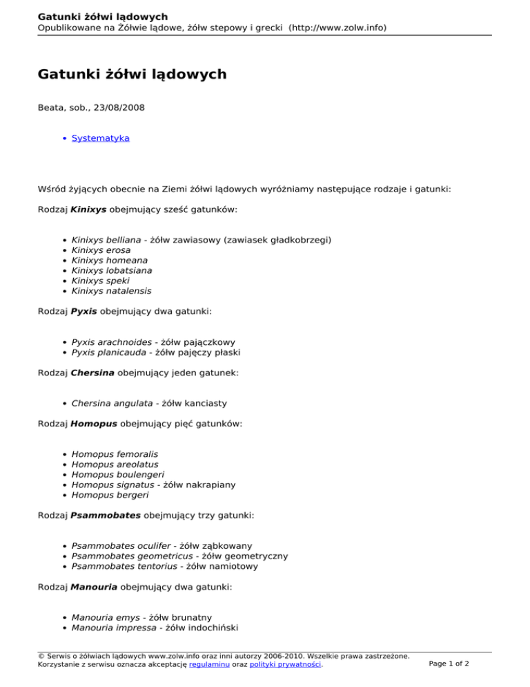 Gatunki żółwi lądowych Opublikowane na Żółwie lądowe, żółw stepowy i grecki (http://www.zolw.info) Gatunki żółwi lądowych Beata, sob., 23/08/2008 Systematyka Wśród żyjących obecnie na Ziemi żółwi lądowych wyróżniamy następujące rodzaje i gatunki: Rodzaj Kinixys obejmujący sześć gatunków: Kinixys Kinixys Kinixys Kinixys Kinixys Kinixys belliana - żółw zawiasowy (zawiasek gładkobrzegi) erosa homeana lobatsiana speki natalensis Rodzaj Pyxis obejmujący dwa gatunki: Pyxis arachnoides - żółw pajączkowy Pyxis planicauda - żółw pajęczy płaski Rodzaj Chersina obejmujący jeden gatunek: Chersina angulata - żółw kanciasty Rodzaj Homopus obejmujący pięć gatunków: Homopus Homopus Homopus Homopus Homopus femoralis areolatus boulengeri signatus - żółw nakrapiany bergeri Rodzaj Psammobates obejmujący trzy gatunki: Psammobates oculifer - żółw ząbkowany Psammobates geometricus - żółw geometryczny Psammobates tentorius - żółw namiotowy Rodzaj Manouria obejmujący dwa gatunki: Manouria emys - żółw brunatny Manouria impressa - żółw indochiński © Serwis o żółwiach lądowych www.zolw.info oraz inni autorzy 2006-2010. Wszelkie prawa zastrzeżone. Korzystanie z serwisu oznacza akceptację regulaminu oraz polityki prywatności. Page 1 of 2 Gatunki żółwi lądowych Opublikowane na Żółwie lądowe, żółw stepowy i grecki (http://www.zolw.info) Rodzaj Indotestudo obejmujący trzy gatunki: Indotestudo forstenii - żółw celebeski Indotestudo elongata - żółw żółtogłowy (żółw podługowaty) Indotestudo travancorica - żółw trawankurski Rodzaj Geochelone obejmujący jedenaście gatunków: Geochelone Geochelone Geochelone Geochelone Geochelone Geochelone Geochelone Geochelone Geochelone Geochelone Geochelone carbonaria - żółw leśny chilensis- żółw argentyński (żółw chilijski) denticulata - żółw żabuti elegans - żółw gwiaździsty gigantea - żółw olbrzymi nigra - żółw słoniowy pardalis - żółw lamparci (żółw plamisty) platynota - żółw birmański radiata - żółw promienisty sulcata - żółw pustynny yniphora - żółw madagaskarski Rodzaj Gopherus obejmujący cztery gatunki: Gopherus Gopherus Gopherus Gopherus agassizii polyphemus - żółw norowy berlandieri - żółw teksaski flavomarginatus - meksykański żółw norowy Rodzaj Malacochersus obejmujący jeden gatunek: Malacochersus tornieri - żółw Torniera (żółw szczelinowy) Rodzaj Testudo obejmujący sześć gatunków: Testudo Testudo Testudo Testudo Testudo Testudo hermanni - żółw grecki graeca - żółw śródziemnomorski (żółw mauretański, żółw iberyjski) horsfieldi - żółw stepowy kleinmanni - żółw egipski marginata - żółw obrzeżony weissingeri - żółw peloponeski Bibliografia: [1] Praschag R.: Żółwie lądowe, Świat książki, Warszawa 2004 [2] http://www.chelonia.org [3] http://pl.wikipedia.org Adres źródła: http://www.zolw.info/zolwie-ladowe/systematyka-i-gatunki/gatunki-zolwi-ladowych © Serwis o żółwiach lądowych www.zolw.info oraz inni autorzy 2006-2010. Wszelkie prawa zastrzeżone. Korzystanie z serwisu oznacza akceptację regulaminu oraz polityki prywatności. Powered by TCPDF (www.tcpdf.org) Page 2 of 2
