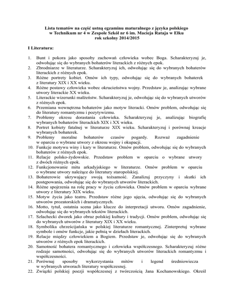 Lista tematów na część ustną egzaminu maturalnego z języka polskiego w Technikum nr 4 w Zespole Szkól nr 6 im. Macieja Rataja w Ełku rok szkolny 2014/2015 I Literatura: 1. 2. 3. 4. 5. 6. 7. 8. 9. 10. 11. 12. 13. 14. 15. 16. 17. 18. 19. 20. 21. 22. Bunt i pokora jako sposoby zachowań człowieka wobec Boga. Scharakteryzuj je, odwołując się do wybranych bohaterów literackich z różnych epok. Zbrodniarze w literaturze. Scharakteryzuj ich, odwołując się do wybranych bohaterów literackich z różnych epok. Różne portrety kobiet. Omów ich typy, odwołując się do wybranych bohaterek z literatury XIX i XX wieku. Różne postawy człowieka wobec okrucieństwa wojny. Przedstaw je, analizując wybrane utwory literackie XX wieku. Literackie wizerunki małżeństw. Scharakteryzuj je, odwołując się do wybranych utworów z różnych epok. Przemiana wewnętrzna bohaterów jako motyw literacki. Omów problem, odwołując się do literatury romantyzmu i pozytywizmu. Problemy okresu dorastania człowieka. Scharakteryzuj je, analizując biografię wybranych bohaterów literackich XIX i XX wieku. Portret kobiety fatalnej w literaturze XIX wieku. Scharakteryzuj i porównaj kreacje wybranych bohaterek. Problemy moralne bohaterów czasów pogardy. Rozważ zagadnienie w oparciu o wybrane utwory z okresu wojny i okupacji. Funkcje motywu winy i kary w literaturze. Omów problem, odwołując się do wybranych bohaterów z różnych epok. Relacje polsko-żydowskie. Przedstaw problem w oparciu o wybrane utwory z dwóch różnych epok. Funkcjonowanie mitu arkadyjskiego w literaturze. Omów problem w oparciu o wybrane utwory należące do literatury staropolskiej. Bohaterowie ukrywający swoją tożsamość. Zanalizuj przyczyny i skutki ich postępowania, odwołując się do wybranych utworów literackich. Różne spojrzenia na rolę pracy w życiu człowieka. Omów problem w oparciu wybrane utwory z literatury XIX wieku. Motyw życia jako teatru. Przedstaw różne jego ujęcia, odwołując się do wybranych utworów prozatorskich i dramatycznych. Motto, tytuł, ostatnia scena jako klucze do interpretacji utworu. Omów zagadnienie, odwołując się do wybranych tekstów literackich. Szlachecki dworek jako obraz polskiej kultury i tradycji. Omów problem, odwołując się do wybranych utworów z literatury XIX i XX wieku. Symbolika chrześcijańska w polskiej literaturze romantycznej. Zinterpretuj wybrane symbole i omów funkcje, jakie pełnią w dziełach literackich. Relacje między człowiekiem a Bogiem. Przedstaw je, odwołując się do wybranych utworów z różnych epok literackich. Samotność bohatera romantycznego i człowieka współczesnego. Scharakteryzuj różne rodzaje samotności, odwołując się do wybranych utworów literackich romantyzmu i współczesności. Porównaj sposoby wykorzystania mitów i legend średniowiecza w wybranych utworach literatury współczesnej. Związki polskiej poezji współczesnej z twórczością Jana Kochanowskiego. Określ charakter tych związków, analizując wybrane utwory liryczne. 23. Odwołując się do wybranych utworów pozytywizmu, przedstaw różne sposoby przekazywania prawdy historycznej w literaturze tej epoki. 24. Różne sposoby ukazywania bohaterskiej śmierci w literaturze. Scharakteryzuj je na przykładzie wybranych utworów z dwóch epok literackich. 25. Pycha jako czynnik determinujący działania człowieka. Określ jej źródła i konsekwencje, analizując wybrane utwory dramatyczne. 26. Analizując wybrane utwory poetyckie i prozatorskie Młodej Polski, przedstaw różnorodne sposoby wykorzystania motywu zmierzchu w literaturze tej epoki. 27. Scharakteryzuj i porównaj osobowości wybranych bohaterów literackich, będących autorami pamiętników (dzienników, listów). 28. Idealiści i marzyciele w zderzeniu z rzeczywistością - zmieniają świat czy świat ich zmienia? Rozważ problem, odwołując się do wybranych bohaterów literackich. 29. Omów funkcje motywu śmierci na przykładzie wybranych utworów literackich z rożnych epok. 30. Literackie wizerunki matek. Scharakteryzuj je, odwołując się do wybranych utworów z różnych epok. 31. Jak pojmowano służbę ojczyźnie w różnych epokach literackich? Przedstaw zagadnienie odwołując się do wybranych utworów literackich. 32. Historia jako czynnik determinujący ludzki los. Omów problem, odwołując się do wybranych powieści XIX i XX wieku. 33. Literatura terenem poszukiwań wartości uniwersalnych. Omów zagadnienie, odwołując się do wybranych utworów z różnych epok. 34. Przedstaw funkcjonowanie motywu wędrówki w czasie i przestrzeni, odwołując się do wybranych utworów różnych epok. 35. W oparciu o wybrane utwory dramaturgiczne i prozatorskie omów różne sposoby mówienia o wolności. 36. Antysemityzm i holokaust w literaturze polskiej. Przedstaw problem, odwołując się do wybranych utworów literackich. 37. W oparciu o wybrane teksty literackie omów różne sposoby kreowania bohaterów szaleńców. 38. Scharakteryzuj różne postawy wobec życia w literaturze końca XIX wieku. Odwołaj się do wybranych utworów lirycznych i prozatorskich. 39. Człowiek kowalem swego losu czy jego igraszką? W swojej wypowiedzi odwołaj się do wybranych utworów z literatury starożytnej, renesansowej i współczesnej. 40. Literackie wizerunki magów. Scharakteryzuj je, odwołując się do wybranych utworów z różnych epok. 41. Porównaj postawy wobec życia i śmierci w wybranych utworach literackich średniowiecza i renesansu. 42. Charakterystyczne cechy poezji młodopolskiej. Omów je, odwołując się do wybranych utworów. 43. Muzyka jako inspiracja dla twórcy dzieła literackiego. Dokonaj analizy zagadnienia, odwołując się do wybranych utworów literackich. 44. Odwołując się do wybranych przykładów, omów motyw pracy w literaturze różnych epok. 45. Przedstaw funkcje opisów przyrody w twórczości Adama Mickiewicza. Odwołaj się do 