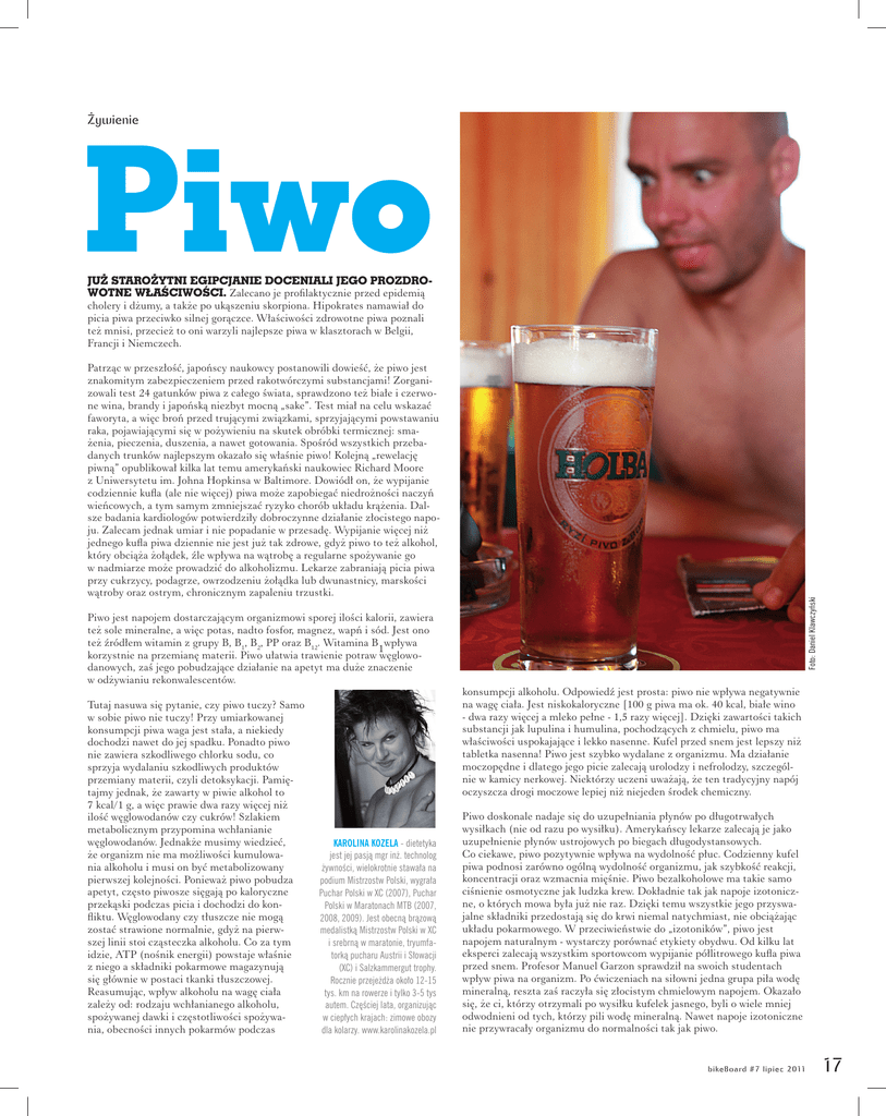 Piwo Żywienie JUŻ STAROŻYTNI EGIPCJANIE DOCENIALI JEGO PROZDROWOTNE WŁAŚCIWOŚCI. Zalecano je profilaktycznie przed epidemią cholery i dżumy, a także po ukąszeniu skorpiona. Hipokrates namawiał do picia piwa przeciwko silnej gorączce. Właściwości zdrowotne piwa poznali też mnisi, przecież to oni warzyli najlepsze piwa w klasztorach w Belgii, Francji i Niemczech. Piwo jest napojem dostarczającym organizmowi sporej ilości kalorii, zawiera też sole mineralne, a więc potas, nadto fosfor, magnez, wapń i sód. Jest ono też źródłem witamin z grupy B, B1, B2, PP oraz B12. Witamina B wpływa 1 korzystnie na przemianę materii. Piwo ułatwia trawienie potraw węglowodanowych, zaś jego pobudzające działanie na apetyt ma duże znaczenie w odżywianiu rekonwalescentów. Tutaj nasuwa się pytanie, czy piwo tuczy? Samo w sobie piwo nie tuczy! Przy umiarkowanej konsumpcji piwa waga jest stała, a niekiedy dochodzi nawet do jej spadku. Ponadto piwo nie zawiera szkodliwego chlorku sodu, co sprzyja wydalaniu szkodliwych produktów przemiany materii, czyli detoksykacji. Pamiętajmy jednak, że zawarty w piwie alkohol to 7 kcal/1 g, a więc prawie dwa razy więcej niż ilość węglowodanów czy cukrów! Szlakiem metabolicznym przypomina wchłanianie węglowodanów. Jednakże musimy wiedzieć, że organizm nie ma możliwości kumulowania alkoholu i musi on być metabolizowany pierwszej kolejności. Ponieważ piwo pobudza apetyt, często piwosze sięgają po kaloryczne przekąski podczas picia i dochodzi do konfliktu. Węglowodany czy tłuszcze nie mogą zostać strawione normalnie, gdyż na pierwszej linii stoi cząsteczka alkoholu. Co za tym idzie, ATP (nośnik energii) powstaje właśnie z niego a składniki pokarmowe magazynują się głównie w postaci tkanki tłuszczowej. Reasumując, wpływ alkoholu na wagę ciała zależy od: rodzaju wchłanianego alkoholu, spożywanej dawki i częstotliwości spożywania, obecności innych pokarmów podczas KAROLINA KOZELA - dietetyka jest jej pasją mgr inż. technolog żywności, wielokrotnie stawała na podium Mistrzostw Polski, wygrała Puchar Polski w XC (2007), Puchar Polski w Maratonach MTB (2007, 2008, 2009). Jest obecną brązową medalistką Mistrzostw Polski w XC i srebrną w maratonie, tryumfatorką pucharu Austrii i Słowacji (XC) i Salzkammergut trophy. Rocznie przejeżdża około 12-15 tys. km na rowerze i tylko 3-5 tys autem. Częściej lata, organizując w ciepłych krajach: zimowe obozy dla kolarzy. www.karolinakozela.pl Foto: Daniel Klawczyński Patrząc w przeszłość, japońscy naukowcy postanowili dowieść, że piwo jest znakomitym zabezpieczeniem przed rakotwórczymi substancjami! Zorganizowali test 24 gatunków piwa z całego świata, sprawdzono też białe i czerwone wina, brandy i japońską niezbyt mocną „sake”. Test miał na celu wskazać faworyta, a więc broń przed trującymi związkami, sprzyjającymi powstawaniu raka, pojawiającymi się w pożywieniu na skutek obróbki termicznej: smażenia, pieczenia, duszenia, a nawet gotowania. Spośród wszystkich przebadanych trunków najlepszym okazało się właśnie piwo! Kolejną „rewelację piwną” opublikował kilka lat temu amerykański naukowiec Richard Moore z Uniwersytetu im. Johna Hopkinsa w Baltimore. Dowiódł on, że wypijanie codziennie kufla (ale nie więcej) piwa może zapobiegać niedrożności naczyń wieńcowych, a tym samym zmniejszać ryzyko chorób układu krążenia. Dalsze badania kardiologów potwierdziły dobroczynne działanie złocistego napoju. Zalecam jednak umiar i nie popadanie w przesadę. Wypijanie więcej niż jednego kufla piwa dziennie nie jest już tak zdrowe, gdyż piwo to też alkohol, który obciąża żołądek, źle wpływa na wątrobę a regularne spożywanie go w nadmiarze może prowadzić do alkoholizmu. Lekarze zabraniają picia piwa przy cukrzycy, podagrze, owrzodzeniu żołądka lub dwunastnicy, marskości wątroby oraz ostrym, chronicznym zapaleniu trzustki. konsumpcji alkoholu. Odpowiedź jest prosta: piwo nie wpływa negatywnie na wagę ciała. Jest niskokaloryczne [100 g piwa ma ok. 40 kcal, białe wino - dwa razy więcej a mleko pełne - 1,5 razy więcej]. Dzięki zawartości takich substancji jak lupulina i humulina, pochodzących z chmielu, piwo ma właściwości uspokajające i lekko nasenne. Kufel przed snem jest lepszy niż tabletka nasenna! Piwo jest szybko wydalane z organizmu. Ma działanie moczopędne i dlatego jego picie zalecają urolodzy i nefrolodzy, szczególnie w kamicy nerkowej. Niektórzy uczeni uważają, że ten tradycyjny napój oczyszcza drogi moczowe lepiej niż niejeden środek chemiczny. Piwo doskonale nadaje się do uzupełniania płynów po długotrwałych wysiłkach (nie od razu po wysiłku). Amerykańscy lekarze zalecają je jako uzupełnienie płynów ustrojowych po biegach długodystansowych. Co ciekawe, piwo pozytywnie wpływa na wydolność płuc. Codzienny kufel piwa podnosi zarówno ogólną wydolność organizmu, jak szybkość reakcji, koncentracji oraz wzmacnia mięśnie. Piwo bezalkoholowe ma takie samo ciśnienie osmotyczne jak ludzka krew. Dokładnie tak jak napoje izotoniczne, o których mowa była już nie raz. Dzięki temu wszystkie jego przyswajalne składniki przedostają się do krwi niemal natychmiast, nie obciążając układu pokarmowego. W przeciwieństwie do „izotoników”, piwo jest napojem naturalnym - wystarczy porównać etykiety obydwu. Od kilku lat eksperci zalecają wszystkim sportowcom wypijanie półlitrowego kufla piwa przed snem. Profesor Manuel Garzon sprawdził na swoich studentach wpływ piwa na organizm. Po ćwiczeniach na siłowni jedna grupa piła wodę mineralną, reszta zaś raczyła się złocistym chmielowym napojem. Okazało się, że ci, którzy otrzymali po wysiłku kufelek jasnego, byli o wiele mniej odwodnieni od tych, którzy pili wodę mineralną. Nawet napoje izotoniczne nie przywracały organizmu do normalności tak jak 