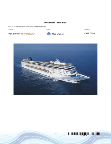 Mozambik - Mini Rejs Termin: 19 marzec 2018 - 23 marzec 2018 (ilość dni: 5) Statek: MSC Sinfonia Linia: Cena od: MSC Cruises €349.00/os. 1/3 EV:48438 TRASA REJSU dzień 1 Data Port Wpłynięcie Wypłynięcie poniedziałek 19.03.2018 Durban --:-- 14:00 09:00 17:00 09:00 18:00 Dzień na morzu --:-- --:-- Durban 07:00 --:-- dzień 2 dzień 3 Republika Południowej Afryki Portugese Island wtorek 20.03.2018 Mozambik Pomene środa 21.03.2018 dzień 4 czwartek 22.03.2018 dzień 5 piątek 23.03.2018 Legenda Mozambik Republika Południowej Afryki CENNIK Cena katalogowa Kabina wewnętrzna od €349.00 Kabina zewnętrzna z oknem od €399.00 Kabina zewnętrzna z balkonem od €449.00 Suite (apartament) od €489.00 Kabina jednoosobowa na zapytanie 3 i 4 osoba dorosła w kabinie na zapytanie dziecko od 12 do 17 lat jako 3 i 4 osoba w kabinie na zapytanie dziecko od 2 do 11 lat jako 3 i 4 osoba w kabinie tylko opłaty portowe Opłaty portowe Cena promocyjna €90.00 Uwaga! Ceny za osobę w kabinie dwuosobowej. Cena zawiera: zakwaterowanie w kabinie wybranej kategorii; wyżywienie - 3 główne posiłki, przekąski między posiłkami, bufet lub przekąski o północy; napoje serwowane do śniadania i w bufetach samoobsługowych; serwis bagażowy podczas wejścia i zejścia ze statku; serwis kabinowy; korzystanie ze wszystkich urządzeń sportowo - rekreacyjnych znajdujących się na pokładzie statku (basen, jacuzzi, sala fitness, itp.); udział we wszystkich imprezach organizowanych na statku (przedstawienia w teatrze, koncerty, programy animacyjne itp.). 2/3 EV:48438 Cena nie zawiera: kosztów dojazdu do portu; opłat portowych; ewentualnych noclegów w hotelu przed/po rejsie i transferów; wycieczek fakultatywnych w trakcie rejsu; korzystania z barów, mini baru w kabinie oraz napojów zamawianych w restauracji; korzystania z punktów usługowych (fryzjer, pralnia, fotograf, salon piękności i odnowy biologicznej, internet) i wydatków osobistych; napiwków dla obsługi na statku (kwota uzależniona od długości rejsu); ubezpieczenia KL, NNW i bagaż, kosztów wiz (tam gdzie wymagane). Uwagi: na wszystkich rejsach MSC Cruises można zarezerwować pakiety all inclusive: Allegrissimo 24h: 26€/os./dzień i 12€/dziecko/dzień; Allegrissimo Premium: 44€/os./dzień i 21€/dziecko/dzień (pakiet musi być wykupiony przez każdą osobę zakwaterowaną w kabinie - można zakupić w biurze przed rejsem). Na Państwa życzenie zarezerwujemy przelot, transfery do/z portu, parking, dodatkowe noclegi oraz zadbamy o odpowiednie ubezpieczenie podróżne. 3/3 EV:48438