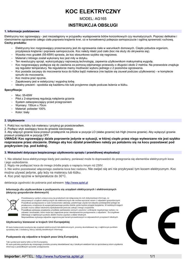 KOC ELEKTRYCZNY MODEL: AG165 INSTRUKCJA OBSŁUGI 1. Informacje podstawowe Elektryczny koc ogrzewający - jest niezastąpiony w przypadku występowania bólów korzonkowych czy reumatycznych. Poprzez delikatne i równomierne ogrzewanie całego ciała poprawia krążenie krwi, co w konsekwencji polepsza samopoczucie i ogólną sprawność ruchową. Cechy produktu: • Elektryczny koc rozgrzewający przeznaczony jest do ogrzewania ciała w warunkach domowych. Ciepło pobudza organizm, przyśpiesza krążenie i poprawia samopoczucie. Koc należy kłaść pod ciało (koc nie służy do okrywania się). • Wysoka moc grzałek (55-65W) sprawia, że koc stosunkowo szybko się nagrzewa. • Materiał z którego został wykonany koc jest miły w dotyku. • Ten rewolucyjny sprzęt, wykorzystujący najnowszą technologię, zapewnia użytkownikom maksymalną wygodę. • Koc rozgrzewający podłącza się do zasilania za pomocą odpinanego przewodu o długości około 2 metrów. Na przewodzie znajduje się regulator temperatury. Na regulatorze mamy możliwość wyboru jednego z 2 poziomów ogrzewania. • Koc posiada zaczepy do mocowania koca do łóżka bądź materaca (nie będzie się zsuwał podczas użytkowania) - w komplecie sznurki do mocowania. • Koc można prać ręcznie. • Zapakowany jest w estetyczną i wygodną torbę. • Idealny prezent - spodoba się każdemu kto lubi przyjemne ciepło podczas leżenia w łóżku. Specyfikacja: • • • • • • Moc: 55-65W Pilot z 2-stopniową regulacją natężenia grzania System zabezpieczający przed przegrzaniem Wymiary: 150cm x 70cm Materiał: poliester 100% Kolor: biały 2. Użytkowanie 1. Połóż koc na łóżku lub materacu i przykryj go prześcieradłem. 2. Podłącz wtyk zasilający koca do gniazda sieciowego. 3. Aby włączyć grzanie koca przesuń przełącznik na pilocie w pozycje LO (słabe grzanie) lub High (mocne grzanie). Aby wyłączyć grzanie przesuń przełącznik w pozycję OFF. UWAGA! Koc ogrzewający działa poprawnie jedynie w sytuacji, w której ciepło przez niego wytwarzane nie jest szybko rozpraszane przez otoczenie. Dlatego aby koc działał prawidłowo należy po położeniu się na kocu pozostawać pod przykryciem (np. pod kołdrą). 3. Wskazówki dotyczące bezpiecznego użytkowania sprzętu i prawidłowej eksploatacji 1. Nie składać koca elektrycznego kiedy jest zasilany, ponieważ może to doprowadzić do przegrzania się elementów elektrycznych koca i jego uszkodzenia. 2. Nigdy nie podłączać koca do innego źródła prądu o napięciu innym niż 230V. 3. Nie wolno pozostawiać włączonego zasilania koca bez nadzoru. Nie owijać się ani nie przykrywać tym kocem elektrycznym. Koc można używać jedynie, gdy leży na materacu lub łóżku. 4. Koc prać ręcznie w temperaturze do 30°C. deklaracja zgodności do pobrania pod adresem: http://www.aptel.pl Importer: APTEL: http://www.hurtownia.aptel.pl 1/1
