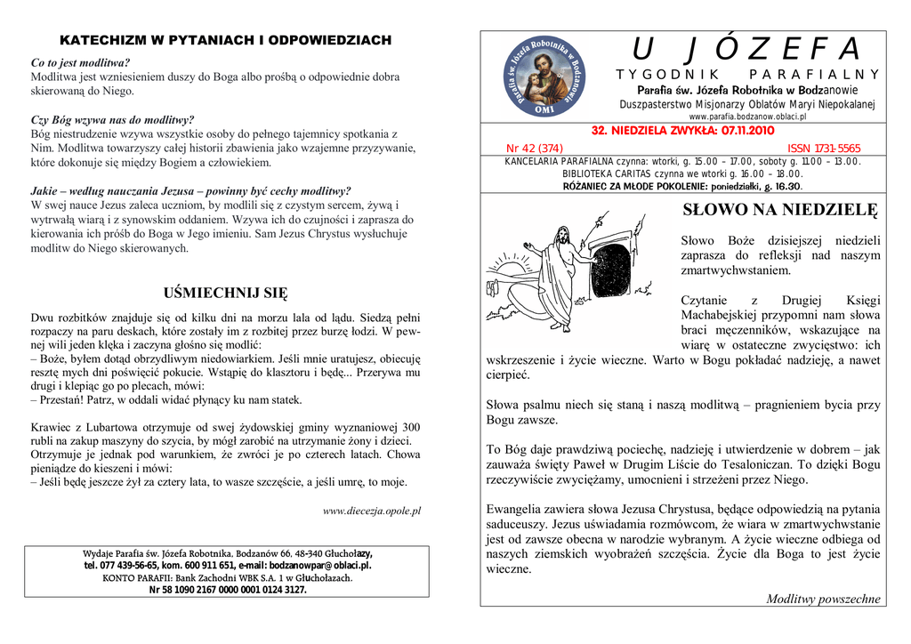 KATECHIZM W PYTANIACH I ODPOWIEDZIACH U Co to jest modlitwa? Modlitwa jest wzniesieniem duszy do Boga albo prośbą o odpowiednie dobra skierowaną do Niego. JÓZEFA TYGODNIK PARAFIALNY Parafia św. Józefa Robotnika w Bodzanowie Duszpasterstwo Misjonarzy Oblatów Maryi Niepokalanej Czy Bóg wzywa nas do modlitwy? Bóg niestrudzenie wzywa wszystkie osoby do pełnego tajemnicy spotkania z Nim. Modlitwa towarzyszy całej historii zbawienia jako wzajemne przyzywanie, które dokonuje się między Bogiem a człowiekiem. Jakie – według nauczania Jezusa – powinny być cechy modlitwy? W swej nauce Jezus zaleca uczniom, by modlili się z czystym sercem, żywą i wytrwałą wiarą i z synowskim oddaniem. Wzywa ich do czujności i zaprasza do kierowania ich próśb do Boga w Jego imieniu. Sam Jezus Chrystus wysłuchuje modlitw do Niego skierowanych. UŚMIECHNIJ SIĘ Dwu rozbitków znajduje się od kilku dni na morzu lala od lądu. Siedzą pełni rozpaczy na paru deskach, które zostały im z rozbitej przez burzę łodzi. W pewnej wili jeden klęka i zaczyna głośno się modlić: – Boże, byłem dotąd obrzydliwym niedowiarkiem. Jeśli mnie uratujesz, obiecuję resztę mych dni poświęcić pokucie. Wstąpię do klasztoru i będę... Przerywa mu drugi i klepiąc go po plecach, mówi: – Przestań! Patrz, w oddali widać płynący ku nam statek. Krawiec z Lubartowa otrzymuje od swej żydowskiej gminy wyznaniowej 300 rubli na zakup maszyny do szycia, by mógł zarobić na utrzymanie żony i dzieci. Otrzymuje je jednak pod warunkiem, że zwróci je po czterech latach. Chowa pieniądze do kieszeni i mówi: – Jeśli będę jeszcze żył za cztery lata, to wasze szczęście, a jeśli umrę, to moje. www.diecezja.opole.pl Wydaje Parafia św. Józefa Robotnika, Bodzanów 66, 48-340 Głuchołazy, tel. 077 439-56-65, kom. 600 911 651, e-mail: [email protected]. KONTO PARAFII: Bank Zachodni WBK S.A. 1 w Głuchołazach. Nr 58 1090 2167 0000 0001 0124 3127. www.parafia.bodzanow.oblaci.pl 32. NIEDZIELA ZWYKŁA: 07.11.2010 Nr 42 (374) ISSN 1731-5565 KANCELARIA PARAFIALNA czynna: wtorki, g. 15.00 – 17.00, soboty g. 11.00 – 13.00. BIBLIOTEKA CARITAS czynna we wtorki g. 16.00 – 18.00. RÓŻANIEC ZA MŁODE POKOLENIE: poniedziałki, g. 16.30. SŁOWO NA NIEDZIELĘ Słowo Boże dzisiejszej niedzieli zaprasza do refleksji nad naszym zmartwychwstaniem. Czytanie z Drugiej Księgi Machabejskiej przypomni nam słowa braci męczenników, wskazujące na wiarę w ostateczne zwycięstwo: ich wskrzeszenie i życie wieczne. Warto w Bogu pokładać nadzieję, a nawet cierpieć. Słowa psalmu niech się staną i naszą modlitwą – pragnieniem bycia przy Bogu zawsze. To Bóg daje prawdziwą pociechę, nadzieję i utwierdzenie w dobrem – jak zauważa święty Paweł w Drugim Liście do Tesaloniczan. To dzięki Bogu rzeczywiście zwyciężamy, umocnieni i strzeżeni przez Niego. Ewangelia zawiera słowa Jezusa Chrystusa, będące odpowiedzią na pytania saduceuszy. Jezus uświadamia rozmówcom, że wiara w zmartwychwstanie jest od zawsze obecna w narodzie wybranym. A życie wieczne odbiega od naszych ziemskich wyobrażeń szczęścia. Życie dla Boga to jest życie wieczne. Modlitwy powszechne OGŁOSZENIA DUSZPASTERSKIE 32 NIEDZIELA ZWYKŁA: 07.11.2010 1. 2. 3. 4. 5. 6. 7. 8. Serdeczne Bóg zapłać! rodzinom, które w ramach swojego dyżuru przygotowały świątynię do niedzieli. W przyszłą sobotę o godz. 9.00 proszę następujące rodziny: Ziubrzyński, Śnieżek Andrzej, Błauciak, Kurczewski, Biernat, Kuliś. Za dzisiejsze ofiary na Kurię oraz seminaria w Opolu i Obrze w imieniu tych instytucji składam serdeczne Bóg zapłać! Bóg zapłać także za ofiary składane na poczet prac na nowym cmentarzu i na ogrzewanie. We wtorek przypada rocznica poświęcenia Bazyliki Laterańskiej, czyli kościoła katedralnego papieża, dlatego też bazylika ta nazywana jest „matką wszystkich kościołów”. W środę wspomnienie św. Leona Wielkiego, papieża z V wieku, którego zapamiętano jako gorliwego obrońcę jedności Kościoła. W czwartek – we wspomnienie św. Marcina z Tours, biskupa - obchodzimy narodowe Święto Niepodległości. Pamiętajmy w modlitwach o tych, którzy za Polskę niepodległą polegli, ale też i o tych, którzy w trudzie budowali i budują jej niepodległy byt. Msze św. w porządku niedzielnym: o godz. 8.00 i o 11.00 za Ojczyznę. W czwartek odpust w Starym Lesie ku czci św. Marcina. Suma o godz. 12.00. W piątek wspomnienie św. Jozafata, apostoła jedności Kościoła na polskich kresach wschodnich. W sobotę – we wspomnienie świętych Benedykta, Jana, Mateusza, Izaaka i Krystyna, pierwszych męczenników Polski, których krew przyczyniła się do rozkwitu chrześcijaństwa w naszej Ojczyźnie - przypada dzień fatimski. Od godz. 15.30 adoracja Najśw. Sakramentu i okazja do spowiedzi. O godz. 16.00 nabożeństwo różańcowe z czytaniem próśb i podziękowań, a następnie, około g. 16.45, Msza św. ZAGADKI (rozwiązania składać w zakrystii) 1. 2. 3. 4. 5. 6. 7. 8. 9. 10. Który święty ma 3 pięty? Co robił Pan Bóg przed stworzeniem świata? Dlaczego wąż w raju najpierw kusił Ewę, a nie Adama? Wchodzi do kościoła na głowie. Co może uczynić człowiek, a nie może tego zrobić Pan Bóg? Co w kościele kiedyś było zupełnie niepotrzebne? Który święty chodził głową do góry? Który święty ma ciepłe pięty? Nie urodził się, a umarł. Urodził się raz, a umarł dwa razy. (Ze zbiorów o. J. Sadowskiego OMI Poniedziałek 16.30 17.00 Wtorek 17.00 Środa 07.00 Czwartek 08.00 11.00 Piątek 17.00 Sobota 07.00 15.30 16.00 Niedziela 08.00 11.00 INTENCJE MSZALNE: 08 – 14.11.2010 08.11.2010 r. Wypominki. Rez. P. Owsiańska. (157) 09.11.2010 r. W intencji Kamila w 18. urodziny. (88) 10.11.2010 r. Za ++ Stefanię i Leona Szewczyk oraz ++ Zofię i Stanisława Majda. (131) 11.11.2010 r. Za + Józefa Landwójtowicza. (105) Za Ojczyznę. 12.11.2010 r. Rez. P. Kwiat