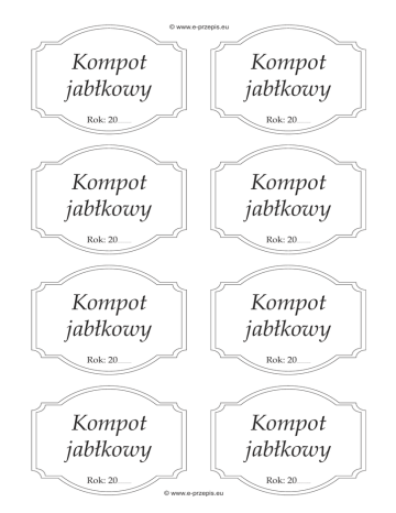 © www.e-przepis.eu Kompot jabłkowy Kompot jabłkowy Rok: 20.............. Rok: 20.............. Kompot jabłkowy Kompot jabłkowy Rok: 20.............. Rok: 20.............. Kompot jabłkowy Kompot jabłkowy Rok: 20.............. Rok: 20.............. Kompot jabłkowy Kompot jabłkowy Rok: 20.............. Rok: 20.............. © www.e-przepis.eu
