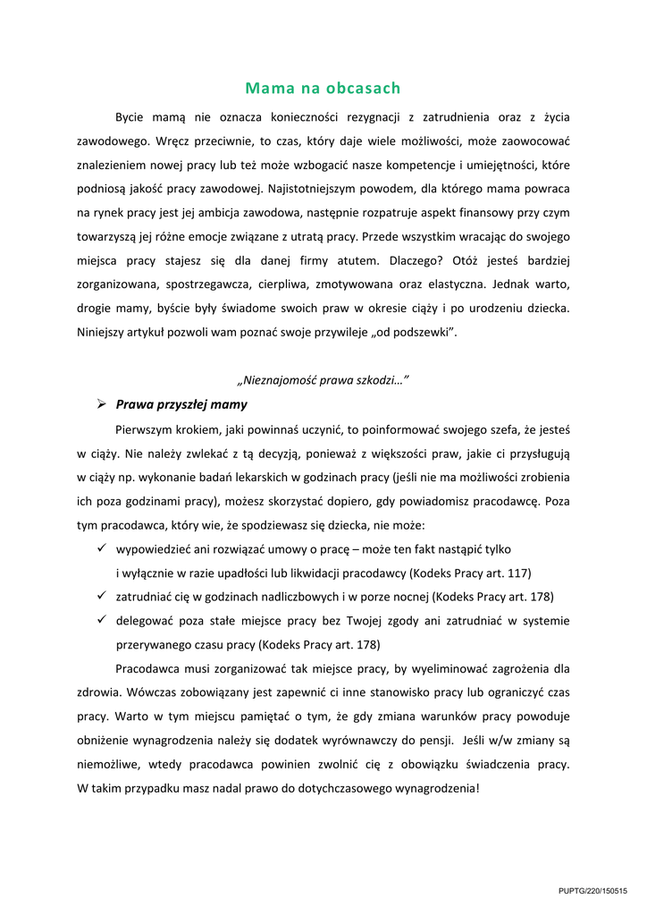 Mama na obcasach Bycie mamą nie oznacza konieczności rezygnacji z zatrudnienia oraz z życia zawodowego. Wręcz przeciwnie, to czas, który daje wiele możliwości, może zaowocować znalezieniem nowej pracy lub też może wzbogacić nasze kompetencje i umiejętności, które podniosą jakość pracy zawodowej. Najistotniejszym powodem, dla którego mama powraca na rynek pracy jest jej ambicja zawodowa, następnie rozpatruje aspekt finansowy przy czym towarzyszą jej różne emocje związane z utratą pracy. Przede wszystkim wracając do swojego miejsca pracy stajesz się dla danej firmy atutem. Dlaczego? Otóż jesteś bardziej zorganizowana, spostrzegawcza, cierpliwa, zmotywowana oraz elastyczna. Jednak warto, drogie mamy, byście były świadome swoich praw w okresie ciąży i po urodzeniu dziecka. Niniejszy artykuł pozwoli wam poznać swoje przywileje „od podszewki”. „Nieznajomość prawa szkodzi…” Prawa przyszłej mamy Pierwszym krokiem, jaki powinnaś uczynić, to poinformować swojego szefa, że jesteś w ciąży. Nie należy zwlekać z tą decyzją, ponieważ z większości praw, jakie ci przysługują w ciąży np. wykonanie badań lekarskich w godzinach pracy (jeśli nie ma możliwości zrobienia ich poza godzinami pracy), możesz skorzystać dopiero, gdy powiadomisz pracodawcę. Poza tym pracodawca, który wie, że spodziewasz się dziecka, nie może: wypowiedzieć ani rozwiązać umowy o pracę – może ten fakt nastąpić tylko i wyłącznie w razie upadłości lub likwidacji pracodawcy (Kodeks Pracy art. 117) zatrudniać cię w godzinach nadliczbowych i w porze nocnej (Kodeks Pracy art. 178) delegować poza stałe miejsce pracy bez Twojej zgody ani zatrudniać w systemie przerywanego czasu pracy (Kodeks Pracy art. 178) Pracodawca musi zorganizować tak miejsce pracy, by wyeliminować zagrożenia dla zdrowia. Wówczas zobowiązany jest zapewnić ci inne stanowisko pracy lub ograniczyć czas pracy. Warto w tym miejscu pamiętać o tym, że gdy zmiana warunków pracy powoduje obniżenie wynagrodzenia należy się dodatek wyrównawczy do pensji. Jeśli w/w zmiany są niemożliwe, wtedy pracodawca powinien zwolnić cię z obowiązku świadczenia pracy. W takim przypadku masz nadal prawo do dotychczasowego wynagrodzenia! PUPTG/220/150515 Oczywisty jest fakt, iż nie każda ciąża może przebiegać prawidłowo. Czasem niektóre komplikacje powodują zagrożenie nie tylko dla twojego zdrowia, ale i dziecka. Dlatego masz prawo do zwolnienia lekarskiego, podczas którego otrzymujesz zasiłek chorobowy w wysokości 100% wynagrodzenia. Przywileje po urodzeniu dziecka Według polskiego prawa każdej kobiecie aktywnej zawodowo po urodzeniu dziecka przysługuje tzw. urlop macierzyński. Nie ma tutaj znaczenia rodzaj umowy, wymiar czasu pracy czy też twój staż pracy. W związku ze zmianą przepisów – Ustawa z dnia 28 maja 2013 roku o zmianie ustawy – Kodeks pracy oraz niektórych innych zmian (Dz.U. 2013 poz. 675), zasiłek macierzyński przysługuje nie tylko za okres urlopu macierzyńskiego, czy dodatkowego urlopu macierzyńskiego, ale również za okres urlopu rodzicielskiego. W związku z tym następuje wydłużenie urlopu macierzyńskiego. Sumując wszystkie dni, wychodzi na to, że po w/w zmianach, mama może uzyskać praktycznie pełny rok płatnego urlopu na dziecko. Należy także podkreślić, że od 1 września 2013r. istnieje możliwość łączenia zasiłku macierzyńskiego z pracą zawodową. Wówczas wymiar czasu pracy będzie wynosił maksymalnie pół etatu, a zasiłek otrzymywany na urlopie będzie odpowiednio przeliczany. a) Podstawowy wymiar urlopu macierzyńskiego: - 20 tygodni w przypadku urodzenia jednego dziecka przy jednym porodzie, - 31 tygodni w przypadku urodzenia dwojga dzieci przy jednym porodzie, - 33 tygodni w przypadku urodzenia trojga dzieci przy jednym porodzie, - 35 tygodni w przypadku urodzenia czworga dzieci przy jednym porodzie, - 37 tygodni w przypadku urodzenia pięciorga i więcej dzieci przy jednym porodzie. b) Dodatkowy urlop macierzyński: - od 6 tygodni w przypadku urodzenia się jednego dziecka, - od 8 tygodni w przypadku urodzenia się dwojga lub więcej dzieci. c) Urlop rodzicielski w wymiarze 26 tygodni (niezależnie od liczby dzieci). Warto dodać, iż z urlopu dodatkowego oraz rodzicielskiego może skorzystać również ojciec dziecka. W latach 2012-2013 będzie to 4 i 6 tygodni, a od 2014 roku – 6 i 8 tygodni. Ojciec wychowujący dziecko może z niego skorzystać, jeżeli: − korzysta z części urlopu macierzyńskiego – matka wykorzystała już 14 tygodni urlopu i rezygnuje z niego, PUPTG/220/150515 − matka dziecka wykorzystała przysługujący jej urlop macierzyński. Wówczas pracownik – ojciec zaznacza we wniosku termin zakończenia urlopu macierzyńskiego przez matkę. Ojciec dziecka ma także prawo do urlopu ojcowskiego w wymiarze 2 tygodni, nie dłużej niż do ukończenia przez dziecko 12 miesiąca życia. Urlopu udziela sie na pisemny wniosek ojca, który należy złożyć w terminie nie krótszym niż 7 dni przed jego rozpoczęciem. Przerwa na karmienie Przepisy związane z rodzicielstwem nakładają na pracodawcę obowiązek zapewnienia mamie takich warunków, aby mogła najlepiej sprawować opiekę nad dzieckiem. Dlatego, dopóki karmisz dziecko piersią nie możesz wykonywać pracy szczególnie uciążliwej oraz masz prawo do przerwy na karmienie. Wówczas przysługuje ci: − gdy pracujesz więcej niż 6 godzin – dwie przerwy na karmienie po 30 minut każda, − gdy pracujesz krócej niż 6 godzin – jedna przerwa półgodzinna, − gdy karmisz więcej niż jedno dziecko – dwie przerwy po 45 minut każda. Przerwy możesz łączyć, więc albo możesz mieć jedną dłuższą przerwę lub możesz wychodzić wcześniej z pracy. Przywileje opiekuńcze Gdy wychowujesz dziecko w wieku do 4 lat, pracodawca nie może bez twojej zgody zatrudniać cię w godzinach nadliczbowych, w porze nocnej, w 