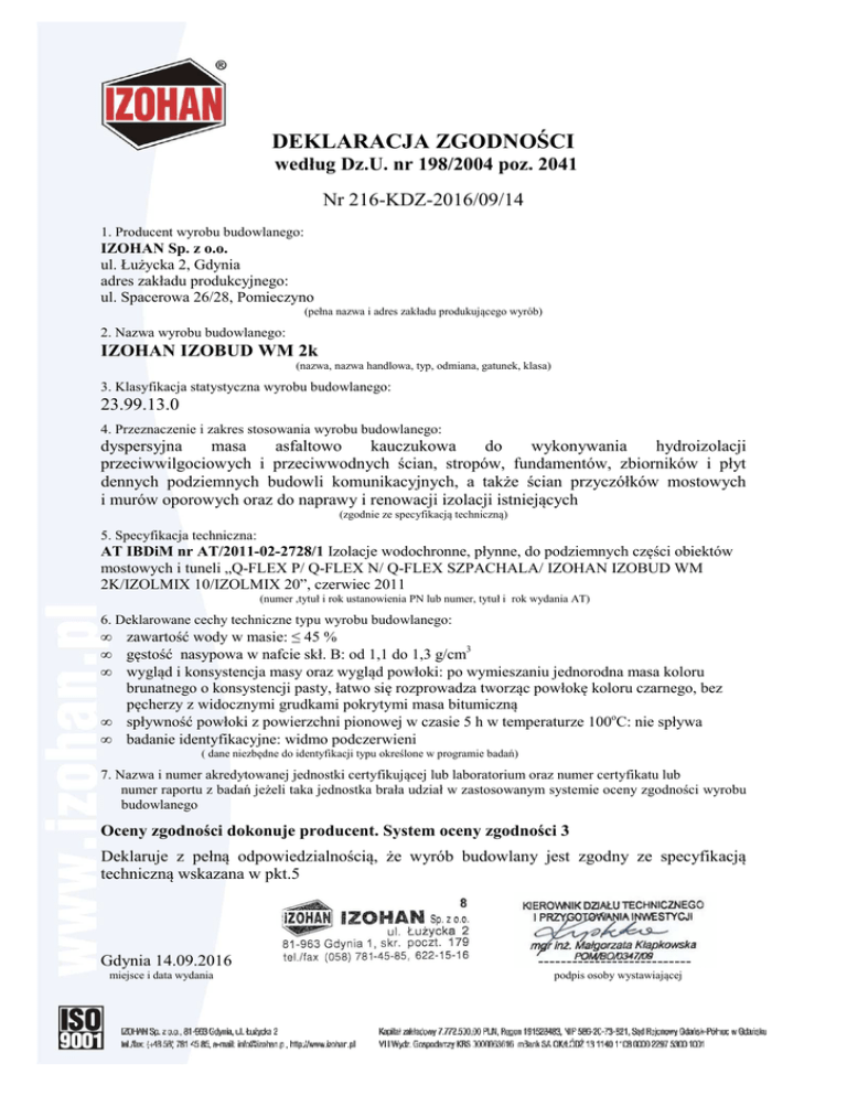 DEKLARACJA ZGODNOŚCI według Dz.U. nr 198/2004 poz. 2041 Nr 216-KDZ-2016/09/14 1. Producent wyrobu budowlanego: IZOHAN Sp. z o.o. ul. Łużycka 2, Gdynia adres zakładu produkcyjnego: ul. Spacerowa 26/28, Pomieczyno (pełna nazwa i adres zakładu produkującego wyrób) 2. Nazwa wyrobu budowlanego: IZOHAN IZOBUD WM 2k (nazwa, nazwa handlowa, typ, odmiana, gatunek, klasa) 3. Klasyfikacja statystyczna wyrobu budowlanego: 23.99.13.0 4. Przeznaczenie i zakres stosowania wyrobu budowlanego: dyspersyjna masa asfaltowo kauczukowa do wykonywania hydroizolacji przeciwwilgociowych i przeciwwodnych ścian, stropów, fundamentów, zbiorników i płyt dennych podziemnych budowli komunikacyjnych, a także ścian przyczółków mostowych i murów oporowych oraz do naprawy i renowacji izolacji istniejących (zgodnie ze specyfikacją techniczną) 5. Specyfikacja techniczna: AT IBDiM nr AT/2011-02-2728/1 Izolacje wodochronne, płynne, do podziemnych części obiektów mostowych i tuneli „Q-FLEX P/ Q-FLEX N/ Q-FLEX SZPACHALA/ IZOHAN IZOBUD WM 2K/IZOLMIX 10/IZOLMIX 20”, czerwiec 2011 (numer ,tytuł i rok ustanowienia PN lub numer, tytuł i rok wydania AT) 6. Deklarowane cechy techniczne typu wyrobu budowlanego: • • • • • zawartość wody w masie: ≤ 45 % gęstość nasypowa w nafcie skł. B: od 1,1 do 1,3 g/cm3 wygląd i konsystencja masy oraz wygląd powłoki: po wymieszaniu jednorodna masa koloru brunatnego o konsystencji pasty, łatwo się rozprowadza tworząc powłokę koloru czarnego, bez pęcherzy z widocznymi grudkami pokrytymi masa bitumiczną spływność powłoki z powierzchni pionowej w czasie 5 h w temperaturze 100oC: nie spływa badanie identyfikacyjne: widmo podczerwieni ( dane niezbędne do identyfikacji typu określone w programie badań) 7. Nazwa i numer akredytowanej jednostki certyfikującej lub laboratorium oraz numer certyfikatu lub numer raportu z badań jeżeli taka jednostka brała udział w zastosowanym systemie oceny zgodności wyrobu budowlanego Oceny zgodności dokonuje producent. System oceny zgodności 3 Deklaruje z pełną odpowiedzialnością, że wyrób budowlany jest zgodny ze specyfikacją techniczną wskazana w pkt.5 Gdynia 14.09.2016 miejsce i data wydania --------------------------podpis osoby wystawiającej