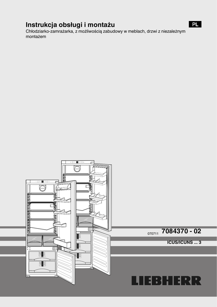 Instrukcja obsługi i montażu Chłodziarko-zamrażarka, z możliwością zabudowy w meblach, drzwi z niezależnym montażem 070711 7084370 - 02 ICUS/ICUNS ... 3 Prezentacja urządzenia Zawartość 1 1.1 1.2 1.3 1.4 Prezentacja urządzenia......................................... Przegląd urządzenia i wyposażenia......................... Zakres zastosowania urządzenia............................. Zgodność................................................................. Oszczędzanie energii............................................... 2 2 2 3 3 2 ogólne wskazówki dotyczące bezpieczeństwa. . 3 3 3.1 3.2 Elementy obsługi i wskaźniki............................... Elementy obsługi i sterowania.................................. Wskaźnik temperatury.............................................. 4 4 4 4 4.1 4.2 4.3 4.4 4.5 4.6 4.7 Uruchomienie......................................................... Transportowanie urządzenia.................................... Ustawianie urządzenia............................................. Zmiana kierunku otwierania drzwi............................ Montaż..................................................................... Utylizacja opakowania.............................................. Podłączanie urządzenia........................................... Włączanie urządzenia.............................................. 4 4 4 5 5 7 7 7 5 5.1 5.2 5.3 Obsługa................................................................... Alarm temperaturowy............................................... Chłodziarka.............................................................. Zamrażalnik.............................................................. 8 8 8 9 6 6.1 6.2 6.3 6.4 6.5 Konserwacja........................................................... Rozmrażanie przy systemie NoFrost........................ Rozmrażanie ręczne................................................ Czyszczenie urządzenia........................................... Wymienianie żarówki oświetlenia wnętrza................ Serwis...................................................................... 10 10 10 11 11 11 7 Usterki..................................................................... 11 8 8.1 8.2 Wyłączanie urządzenia.......................................... 12 Wyłączanie urządzenia............................................ 12 Wyłączenie urządzenia............................................ 12 9 Utylizacja urządzenia............................................. 12 Producent ciągle pracuje nad ulepszaniem wszystkich typów i modeli urządzeń. Dlatego prosimy o zrozumienie, iż jesteśmy zmuszeni zastrzec sobie prawo wprowadzenia zmian kształtu, wyposażenia i rozwiązań technicznych. W celu zapoznania się ze wszystkimi zaletami nowego urządzenia zalecamy uważne przeczytanie wskazówek zawartych w niniejszej instrukcji. Instrukcja została opracowana dla kilku modeli urządzeń. Mogą zatem występować pewne różnice pomiędzy opisem i urządzeniem. Fragmenty dotyczące tylko określonych urządzeń są zaznaczone gwiazdką (*). Instrukcje robocze są wyróżnione , a wyniki działań . 1 Prezentacja urządzenia 1.1 Przegląd urządzenia i wyposażenia Wskazówka u Produkty spożywcze podzielić zgodnie z ilustracją. W ten sposób urządzenie pracuje energooszczędnie. u Półki, szuflady lub kosze w stanie dostawy są rozmieszczone tak, by uzyskać optymalną efektywność energetyczną. 2 Fig. 1 (1) Elementy obsługi i sterowania (2) Półka na masło i sery (3) Wentylator* (4) Półka, przemieszczalna (5) Półka na konserwy, przemieszczalna (6) Półka, dzielona (7) Oświetlenia wnętrza (8) Otwór odpływowy (9) Półka na warzywa (10) Półka w drzwiach na wysokie butelki (11) Akumulator chłodniczy (12) VarioSpace (13) System informacyjny (14) Tabliczka znamionowa 1.2 Zakres zastosowania urządzenia Urządzenie jest przeznaczone wyłącznie do chłodzenia produktów spożywczych w środowisku domowym lub podobnym. Zalicza się do tego np. użytkowanie - w kuchniach dla personelu, pensjonatach ze śniadaniem, - przez gości w gospodarstwach agroturystycznych, hotelach, motelach oraz innych miejscach noclegowych, - przy cateringach oraz podobnych usługach gastronomicznych w handlu hurtowym Urządzenia używać wyłącznie w ramach gospodarstwa domowego. Każde inne zastosowanie jest niedopuszczalne. Urządzenie nie jest przeznaczone do przechowywania i chłodzenia leków, plazmy krwi, preparatów laboratoryjnych oraz innych materiałów i produktów wymienianych w dyrektywie dotyczącej produktów medycznych 2007/47/EG. Użytkowanie urządzenia niezgodne z przeznaczeniem może doprowadzić do uszko- ogólne wskazówki dotyczące bezpieczeństwa dzenia lub zepsucia przechowywanych w nim towarów. Ponadto urządzenie nie jest przeznaczone do pracy w obszarach zagrożonych wybuchem. Zależnie od klasy klimatycznej urządzenie jest przeznaczone do pracy w obrębie wskazanych granic temperatury otoczenia. Klasa klimatyczna obowiązująca dla danego urządzenia podana jest na tabliczce znamionowej. Wskazówka u Należy przestrzegać podanego zakresu temperatury otoczenia, gdyż inaczej spada wydajność chłodzenia. Klasa klimatyczna Temperatura otoczenia SN 10 °C do 32 °C N 16 °C do 32 °C ST 16 °C do 38 °C T 16 °C do 43 °C 1.3 Zgodność Układ obiegowy czynnika chłodniczego przeszedł pomyślnie próby szczelności, którym został poddany. Po wbudowaniu urządzenie spełnia warunki odpowiednich przepisów bezpieczeństwa jak również dyrektyw Unii Europejskiej 2006/95/WE oraz 2004/108/WE. 1.4 Oszczędzanie energii - Należy zawsze dbać o dobrą wentylację. Nie zakrywać otworów wentylacyjnych wzgl. kratek wentylacyjnych. - Szczeliny wentylacyjne muszą być zawsze odkryte.* - Nie należy ustawiać urządzenia w miejscach narażonych na - bezpośrednie działanie promieni słonecznych ani obok kuchenki, grzejnika itp. Zu