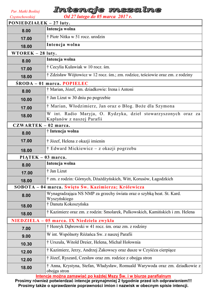 Par. Matki Boskiej Częstochowskiej Od 27 lutego do 05 marca 2017 r. PONIEDZIAŁEK – 27 luty. Intencja wolna 8.00 17.00 † Piotr Nitka w 51 rocz. urodzin Intencja wolna 18.00 WTOREK – 28 luty. Intencja wolna 8.00 17.00 † Cecylia Kulawiak w 10 rocz. śm. 18.00 † Zdzisław Wójtowicz w 12 rocz. śm.; zm. rodzice, teściowie oraz zm. z rodziny ŚRODA – 01 marca. POPIELEC † Marian, Józef, zm. dziadkowie: Irena i Antoni 8.00 10.00 † Jan Lizut w 30 dniu po pogrzebie 17.00 † Marian, Włodzimierz, Jan oraz o Błog. Boże dla Szymona W int. Radio Maryja, O. Rydzyka, dzieł stowarzyszonych oraz za Kapłanów z naszej Parafii CZWARTEK – 02 marca. † Intencja wolna 8.00 18.00 17.00 † Józef, Helena z okazji imienin † Edward Mickiewicz – z okazji pogrzebu 18.00 PIĄTEK – 03 marca. Intencja wolna 8.00 17.00 † Jan Lizut † zm. z rodzin: Górnych, Dżażdżyńskich, Witt, Korusów, Łagodzkich 18.00 SOBOTA – 04 marca. Święto Św. Kazimierza; Królewicza Wynagradzająca NS NMP za grzechy świata oraz o szybką beat. St. Kard. 8.00 Wyszyńskiego † Danuta Kokoszyńska 18.00 † Kazimierz oraz zm. z rodzin: Smolarek, Pulkowskich, Kamińskich i zm. Helena 18.00 NIEDZIELA – 05 marca. IX Niedziela zwykła † Henryk Dąbrowski w 41 rocz. śm. oraz zm. z rodziny 7.00 9.00 W int. Wspólnoty Różańca Sw. z naszej Parafii 10.30 † Urszula, Witold Dreier, Helena, Michał Hołownia 12.00 † Kazimierz, Jerzy, Andrzej Żakowscy oraz dusze w Czyśćcu cierpiące 12.00 † Józef, Ryszard, Czesław oraz zm. rodzice z obojga stron 18.00 † Anna, Krystyna, Stefan, Władysław, Romuald Warywoda oraz zm. dziadkowie z obojga stron Intencje można zamawiać po każdej Mszy Św. i w biurze parafialnym Prosimy również potwierdzać intencje przynajmniej 2 tygodnie przed ich odprawieniem!!! Prosimy także o sprawdzenie poprawności imion i nazwisk w obecnym spisie intencji.