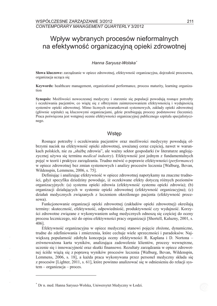 WSPÓŁCZESNE ZARZ DZANIE 3/2012 CONTEMPORARY MANAGEMENT QUARTERLY 3/2012 211 Wpływ wybranych procesów nieformalnych na efektywno organizacyjn opieki zdrowotnej Hanna Saryusz-Wolska∗ Słowa kluczowe: zarz dzanie w opiece zdrowotnej, efektywno organizacja ucz ca si organizacyjna, dojrzało procesowa, Keywords: healthcare management, organizational performance, process maturity, learning organization Synopsis: Mo liwo ci nowoczesnej medycyny i starzenie si populacji powoduj rosn ce potrzeby i oczekiwania pacjentów, co wi si z olbrzymim zainteresowaniem efektywno ci i wydajno ci systemów opieki zdrowotnej. Mimo licznych uwarunkowa systemowych, zakłady opieki zdrowotnej (głównie szpitale) s kluczowymi organizacjami, gdzie przebiegaj procesy podstawowe (leczenie). Praca po wi cona jest wst pnej ocenie efektywno ci organizacyjnej publicznego szpitala specjalistycznego. Rosn ce potrzeby i oczekiwania pacjentów oraz mo liwo ci medycyny powoduj olbrzymi nacisk na efektywno opieki zdrowotnej, uwa anej coraz cz ciej, nawet w warunkach polskich, nie za „słu b zdrowia”, ale wa ny sektor gospodarki (w literaturze angloj zycznej u ywa si terminu medical industry). Efektywno jest jednym z fundamentalnych poj w teorii i praktyce zarz dzania. Trudno mówi o poprawie efektywno ci (performance) w opiece zdrowotnej bez zmian systemowych i analizy procesów leczenia [Walburg, Bevan, Wildenspin, Lemmens, 2006, s. 75]. Definiuj c i analizuj c efektywno w opiece zdrowotnej napotykamy na znaczne trudnoci, gdy specyfika dziedziny powoduje, i oczekiwane efekty dotycz ró nych poziomów organizacyjnych: (a) systemu opieki zdrowia (efektywno systemu opieki zdrowia); (b) organizacji działaj cych w systemie opieki zdrowotnej (efektywno organizacyjna); (c) działa medycznych zwi zanych z leczeniem okre lonego pacjenta (efektywno procesowa). Funkcjonowanie organizacji opieki zdrowotnej (zakładów opieki zdrowotnej) okre laj terminy: skuteczno , efektywno , odpowiednio , produktywno czy wydajno . Korzyci zdrowotne zwi zane z wykonywaniem usług medycznych odnosz si cz ciej do oceny procesu leczniczego, ni do opisu efektywno ci pracy organizacji [Shortell, Kaluzny, 2001, s. 406]. Efektywno organizacyjna w opiece medycznej stanowi poj cie zło one, dynamiczne, trudne do zdefiniowania i zmierzenia, które cechuje wiele sprzeczno ci i paradoksów. Najwi ksz popularno zdobyła koncepcja oceny efektywno ci R. Kaplana i D. Nortona – zrównowa ona karta wyników, analizuj ca zadowolenie klientów, procesy wewn trzne, uczenie si i innowacyjno oraz skutki finansowe. Rezultaty zarz dzania w opiece zdrowotnej ci le wi si z popraw wyników procesów leczenia [Walburg, Bevan, Wildenspin, Lemmens, 2006, s. 18], a ka da praca wykonywana przez personel medyczny składa si z procesów [Lighter, 2011, s. 61], które powinno analizowa si w odniesieniu do relacji system – organizacja – proces. - - - - - Wst p ∗ Dr n. med. Hanna Saryusz-Wolska, Uniwersytet Medyczny w Łodzi. 212 H. Saryusz-Wolska, Wpływ wybranych procesów nieformalnych… H. Saryusz-Wolska, The effect of selected informal processes… Celem artykyłu jest poznanie wpływu wybranych procesów nieformalnych na efektywno organizacyjn opieki zdrowotnej. Efektywno w opiece zdrowotnej Raport WHO – The World Health Report 2000. Health Systems: Improving Performance [2000] – w ród standardów oceny efektywno ci systemów zdrowotnych wymienia: (1) popraw zdrowia (mierniki epidemiologiczne stanu zdrowia ludno ci); (2) zapewnienie wra liwo ci systemu na oczekiwania ludzi;(3) sprawiedliwe obci enie gospodarstw domowych wydatkami zdrowotnymi. Health Project OECD (Organization for Economic Co-Operation and Development), którego efektem był raport: Towards High-Performing Health Systems, analizuje liczne wska niki charakteryzuj ce opiek zdrowotn (tj. czas oczekiwania na procedury lecznicze, mo liwo wyboru wiadczeniodawcy, mierniki jako ci, przestrzeganie wytycznych opieki medycznej – standardy leczenia). Europejskie badanie prze ywalno ci pacjentów leczonych z powodu nowotworów EUROCARE (EUROpean CAncer REgistry-based on survival and CARE of cancer patients) prowadzone od 1978 roku przez Narodowy Instytut Nowotworów w Mediolanie (Instituto Nazionale Tumori) wskazuje na złe wyniki leczenia onkologicznego w Polsce (www.eurocare.it). Europejski Index Zdrowia 2009 pochodzi z badania Eurobarometru „Bezpiecze stwo Pacjentów i Jako Opieki Zdrowotnej” (Patient Safety and Quality of Healthcare) i analizuje opiek zdrowotn w krajach europejskich (www.ec.europa.eu…). W rankingu Polska zaj ła 26. miejsce uzyskuj c 565/1000 punktów. Index opracowano na podstawie 20 wska ników w 6 kategoriach: (1) prawa pacjenta i informacja; (2) e-Zdrowie; (3) czas oczekiwania na leczenie; (4) wyniki leczenia; (5) zakres i zasi g wiadczonych usług oraz (6) rodki farmaceutyczne. Pomiar efektywno ci organizacyjnej stanowi zło ony i trudny problem, jednak wyra nie pozytywnie wpływa na procesy usprawniania organizacji [Bratnicki, 2005]. W opiece zdrowotnej od ko ca lat 90. zacz to wprowadza systemy pomiarów na poziomie procesów leczenia i organizacji (szpitale), a najcz ciej stosowanym narz dziem była zrównowa ona karta wyników (BSC – balanced scorecard) [Chow i in., 1998; Zelman, Pink, Mathias, 2002; Groene i in., 2009]. Ka dy z wymiarów BSC (zadowolenie klientów, procesy wewn trzne, uczenie si i innowacyjno oraz skutki finansowe) w sposób bezpo redni lub po redni ma zwi zek z przebiegiem procesów podstawowych w organizacji. Analiza podstawowych procesów wewn trznych (procesy leczenia) w organizacji opieki zdrowotnej oraz ich powi za z innymi wymiarami BSC stanowiła przesłanki teoretyczne prezentowanych bada . - - - - - Procesy w opiece zdrowotnej Rezultaty zarz dzania w opiece zdrowotnej zawsze wi si z popraw wyników procesów leczenia [Walburg, Bevan, Wildenspin, Lemmens, 2006, s. 18]. Procesem nazywa si „ka dy ci g przemian doprowadzaj cy do nowego stan