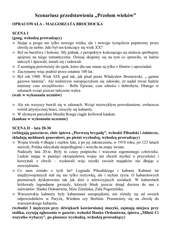 Scenariusz przedstawienia „Przełom wieków” OPRACOWAŁA - MAŁGORZATA BROCHOCKA SCENA I (gong, wchodzą prowadzący) • Stojąc u progu nie tylko nowego wieku, ale i nowego tysiąclecia popatrzmy przez chwilę za siebie. Jaki był ten kończący się wiek XX? • Był on burzliwy i bolesny. My jednak, z perspektyw kończącego się stulecia spróbujmy spojrzeć na niego romantycznie. Dzisiaj skupimy się na tym co sprawiło, ze ludzie tańczyli i śpiewali, śmiali się i radowali. • Z nostalgią powrócimy do epok, które dla nas znane są tylko z filmów i opowiadań. • Zaczynamy więc podróż przez ostatnie 100 lat. • Był rok 1900. Wiek XIX gasł tak, jak pisał poeta Władysław Broniewski, „..gaśnie gazowa latarnia”. Ale niektórym europejczykom się zdawało, że nadal trwać będzie miniony czas szczęśliwości – Belle Epooue, czas ufności i dobrobytu. Dlatego w salonach wciąż jeszcze tańczono walca. (walc w wykonaniu uczniów) • Ale nie wszyscy bawili się w salonach. Wciąż niezwykłym powodzeniem, zwłaszcza wśród artystycznej braci, cieszyły się kabarety. • W słynnym paryskim Moulin Rouge ciągle królował kankan. (kankan w wykonaniu uczennic) SCENA II – lata 20-30 (wbiegają gazeciarze, chór śpiewa „Pierwszą brygadę”, wchodzi Piłsudski i żołnierze, składają meldunek generałowi, po pieśni wychodzą, wchodzą prowadzący) • Wojna trwała 4 długie i ciężkie lata, a po jej zakończeniu, w 1918 roku, po 123 latach niewoli, Polska odzyskała niepodległość i wróciła na mapy świata. Nadeszły lata 20-te. Były to czasy pośpiechu i wiecznie zagonionego człowieka. Ludzie mając w pamięci okropieństwa wojny nie chcieli myśleć o przyszłości i korzystali z chwili – wydawali więc resztki swoich majątków nie dbając o oszczędzanie. • Co nam zostało z tych lat? Legenda Piłsudskiego i kabaret. Kabaret lat międzywojennych stał się nie tylko rozrywką, ale i stylem życia. O kabaretowych premierach dyskutowano tak jak dziś o telewizyjnych serialach. W kabaretach królowały legendarne gwiazdy, których blask jeszcze dotąd dociera do nas z zaświatów: Hanka Ordonówna, Mira Zimińska, Zula Pogorzelska. • Warszawskie kabarety były kabaretami europejskimi, nie różniły się od swoich odpowiedników w Paryżu, Wiedniu czy Berlinie. Przenieśmy się na chwilę do warszawskiego kabaretu. (wchodzi 3 mężczyzn przy dźwiękach kawiarnianej muzyki, zajmują miejsca przy stoliku, czytają ogłoszenia w gazecie; wchodzi Hanka Ordonówna, śpiewa „Miłość Ci wszystko wybaczy”, po piosence wychodzą, wchodzą prowadzący) • Po wojnie, domenie mężczyzn, nadszedł czas kobiet wyzwolonych – chłopczyc, które nosiły się swobodnie i podobnie zachowywały. Lubiły tańczyć w nowym stylu – tango, charlestona, fokstrota, w strojach, które ułatwiały poruszanie się na parkiecie. Suknie były proste, często z pęknięciem z boku, luźna góra, nagie ramiona. Tak ubraną można było tańczyć do upadłego. (tango tańczą tancerze tańca towarzyskiego) • W latach 20-tych gwiazdy filmowe jaśniały niemym blaskiem na białym ekranie. Ogromną sympatią cieszyła się postać sympatycznego włóczęgi, który, chociaż obdarty, zawsze był elegancki. (Charli Chaplin, raqtaim, po nim syrena, wbiegają gazeciarze obwieszczając II wojnę światową) SCENA III – wojna (przy dźwiękach „Na Warszawiaka nie masz cwaniaka” wchodzą mieszkańcy Warszawy, handlują, uciekają przed tajniakami, śpiewają piosenki „Teraz jest wojna”, „Siekiera, motyka”) SCENA IV – lata 50-te • Po zakończeniu II wojny światowej ludzkość uległa euforycznej radości. Ludzie chcieli zapomnieć o 6-cioletnim koszmarze, szukali rozrywki. I znajdowali. Na początku lat 50-tych pojawiła się telewizja oraz tzw. kina samochodowe, które przyciągały rzesze wielbicieli aktorów nowego pokolenia. • Całe rodziny w wygodnych wnętrzach swoich samochodów oglądały szalejące na ekranie potwory z filmów science fiction, zaś buntowniczo nastawione nastolatki ciągnęły do kin, aby podziwiać swoich idoli: (przy dźwiękach muzyki wchodzą aktorzy) - John Wayne – typ szlachetnego bohatera westernów, gotowego samotnie walczyć przeciwko złu - Brigite Bardot – słynna BB, najatrakycniejsza francuska aktorka filmowa, stworzyła typ bohaterki symbolizującą emancypację obyczajową kobiet - Marlon Brando – w filmie „Dziki”, ubrany w czarną skórę i dżinsy, odniósł ogromny sukces.; na wiele lat stał się bożyszczem nastolatków - Marilyn Monroe – najbardziej kobieca z hollywoodzkich gwiazd, typ słodkiej blondynki, do której próbowały upodobnić się miliony nastolatek - Zbyszek Cybulski – stworzył kultową postać w filmie Andrzeja Wajdy „Popiół i diament”, po którym stał się idolem całego pokolenia Polaków - Jemes Dean – stał się symbolem pokolenia rock and rolla, był wiernym odbiciem swych buntowniczo nastawionych rówieśników, zginął w swoim ulubionym porche • Prezenter telewizyjny Ed Suullivan powiedział publicznie, że „nie powinny oglądać go dzieci i młodzież”. • Zaledwie w kilka tygodni po potępieniu Elvisa Presleya, ten sam prezenter zaprosił go do swojego programu w roli gwiazdy. Presley miał zaśpiewać 3 utwory – za każdy otrzymał po 50 tys. dolarów. • Świat oszalał na punkcie Elvisa Presleya i rock and rolla. (śpiewa i gra Elvis) SCENA V – lata 60-te • Do muzycznej rewolucji lat 60-tych doszło w wielkie Brytanii. Czwórka chłopców z Liverpoolu, która z czasem zdobyła sławę jako zespól The Beatles, podbiła najpierw Europę, a w 1964 roku wyruszyła na podbój Stanów Zjednoczonych. Dziś będą naszymi gośćmi. (The Beatles i fanki) • Lata 60-te to czas swobody i emancypacji. Spragniona wolności młodzież buntowała się przeciwko wszystkiemu – poczynając od wojny w Wietnamie a na mieszczańskich wartościach sw